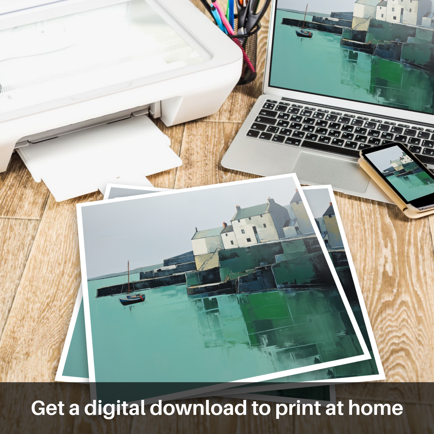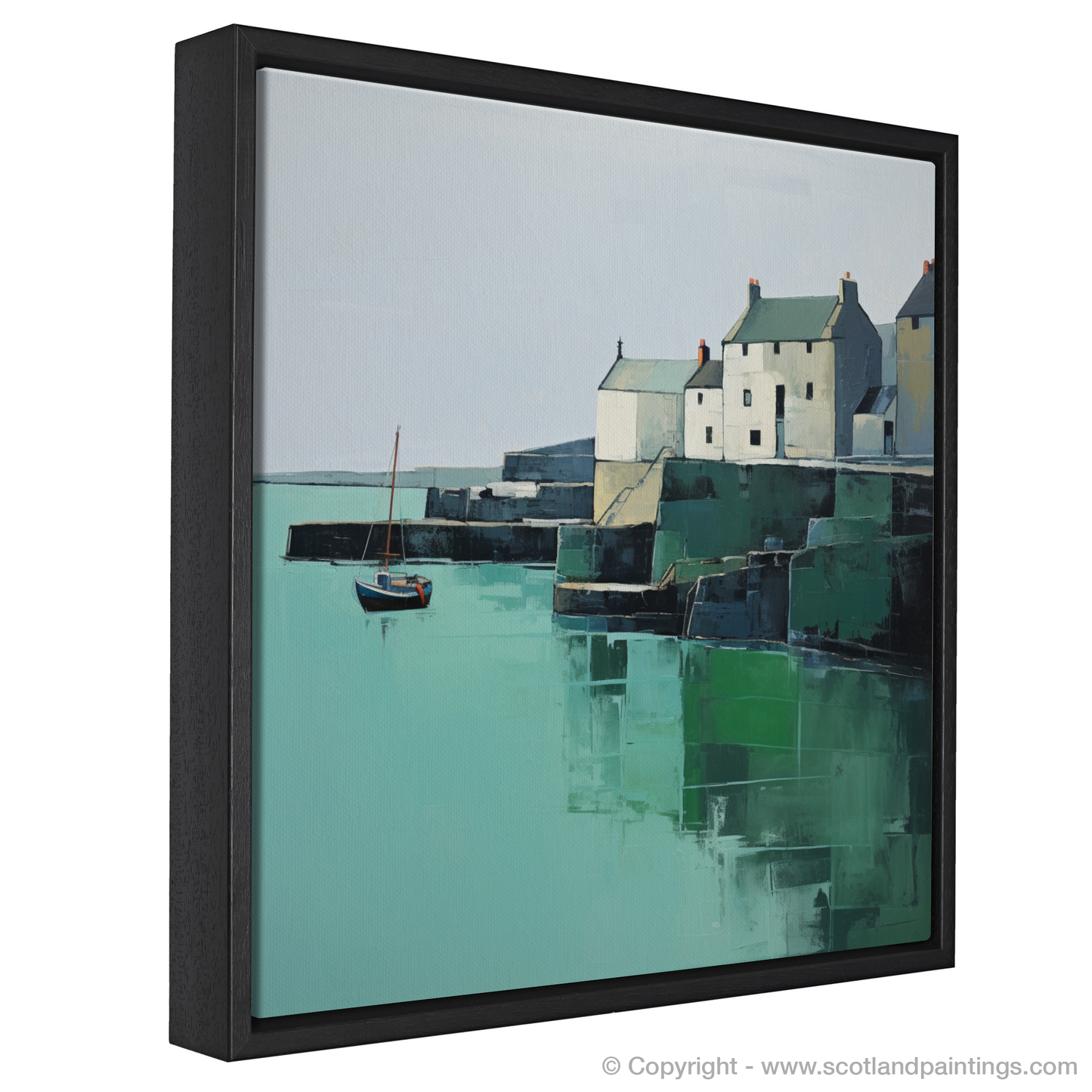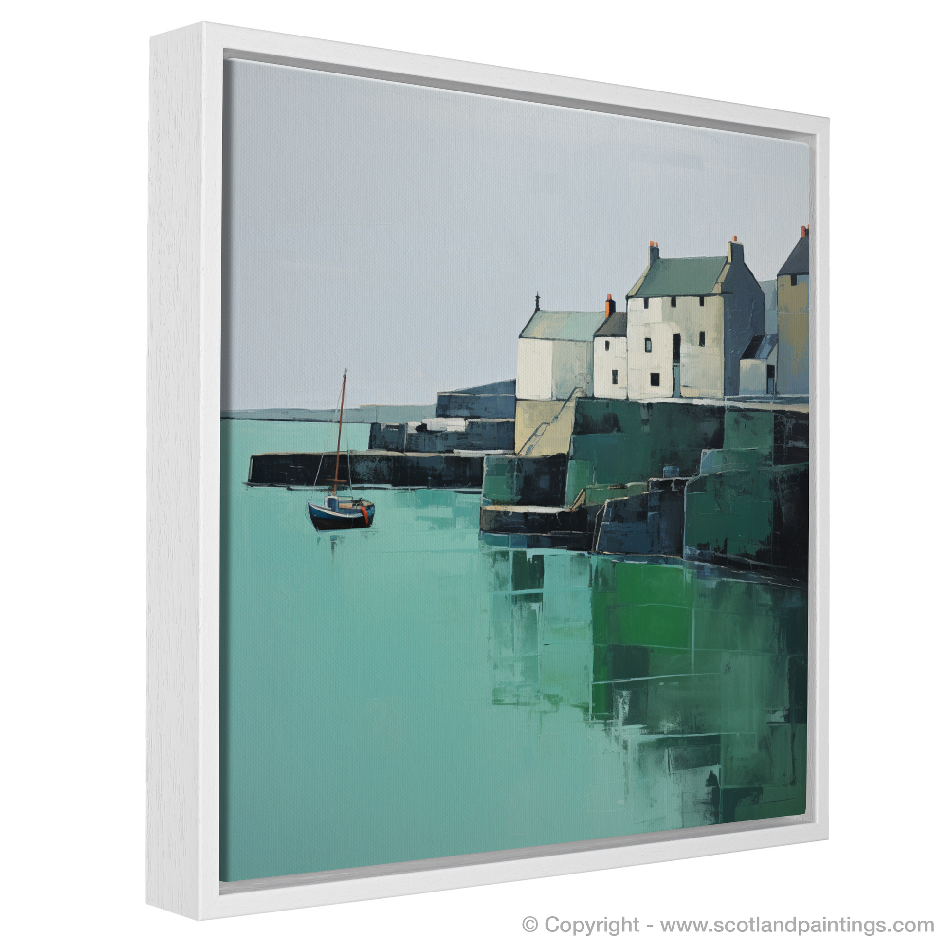 Embrace the serene simplicity of St Monans Harbour through this exquisite minimalist print that captures the essence of coastal tranquillity. With a calm and considered use of colour, the artwork showcases the soothing tones of sea greens and sky blues contrasting with the gentle whites and greys of the harbourside buildings which are portrayed with an almost geometric clarity.