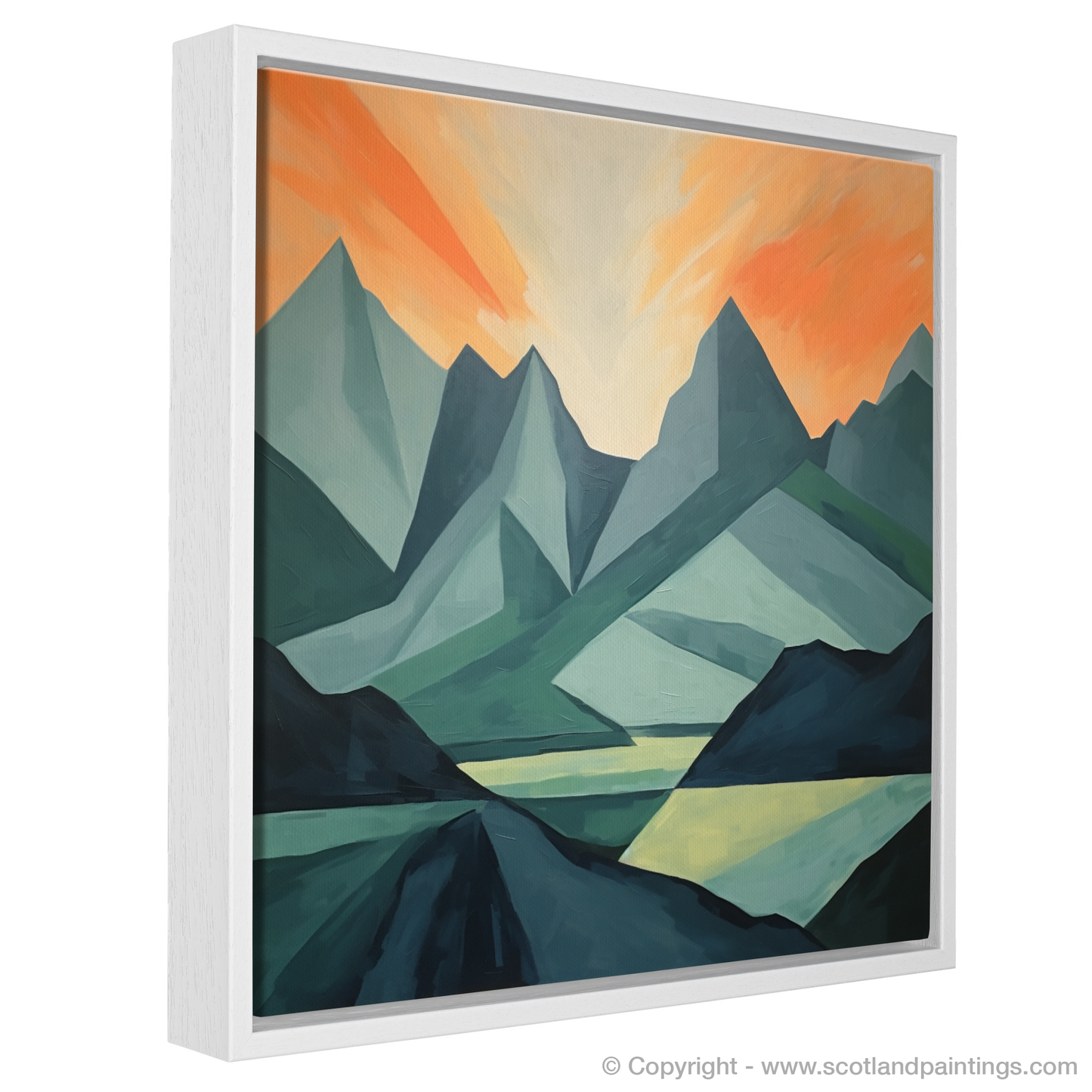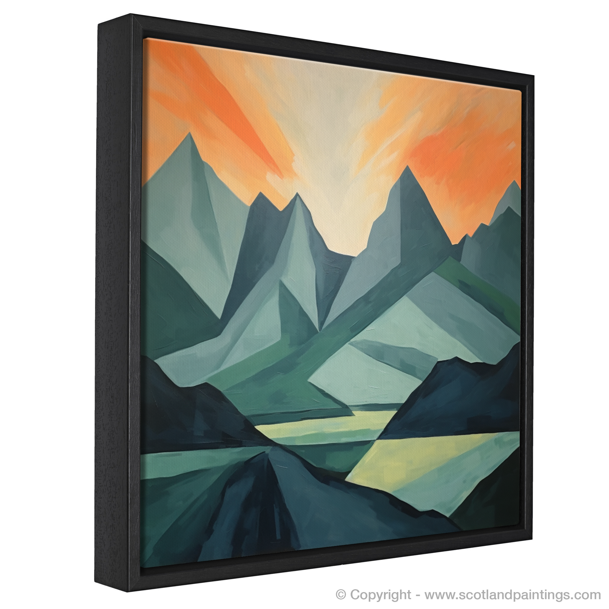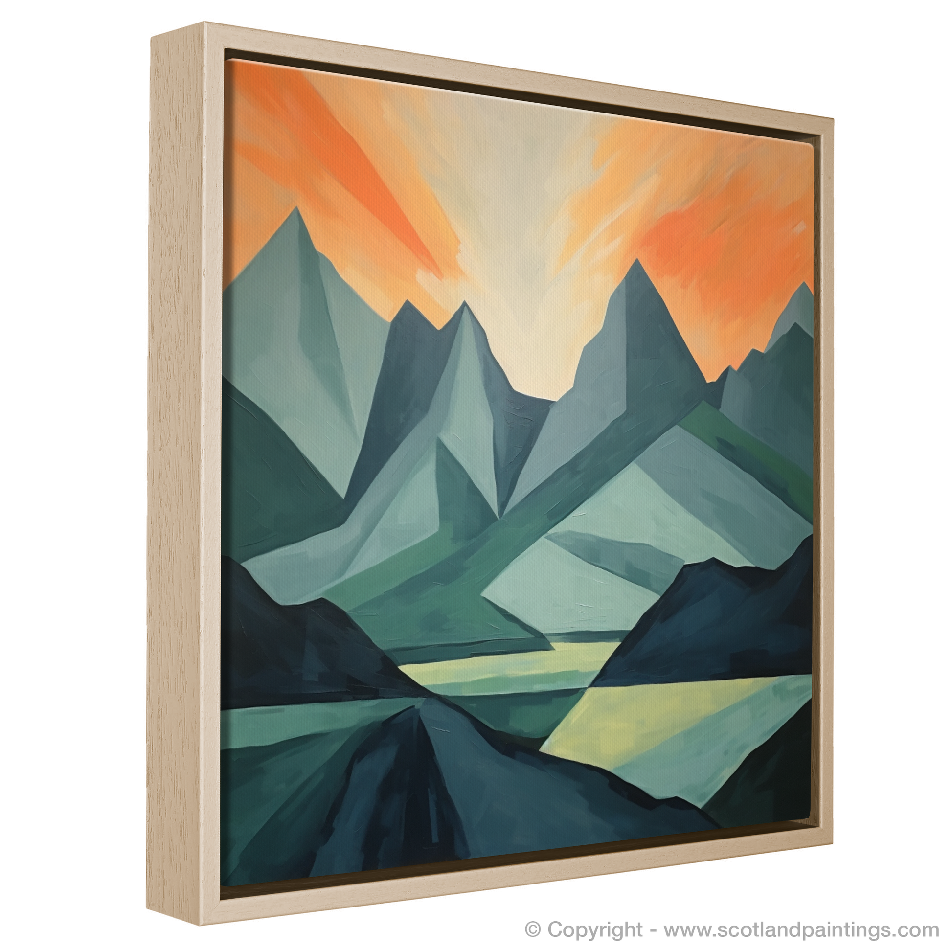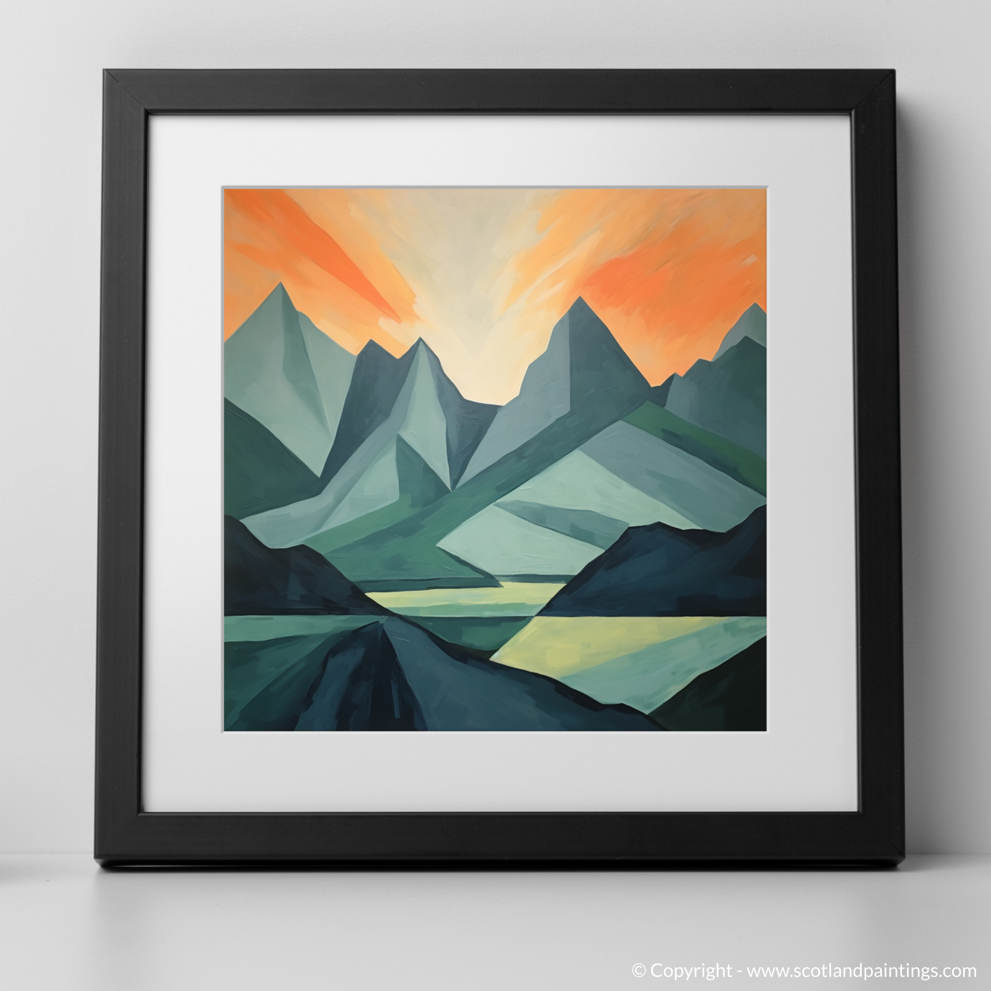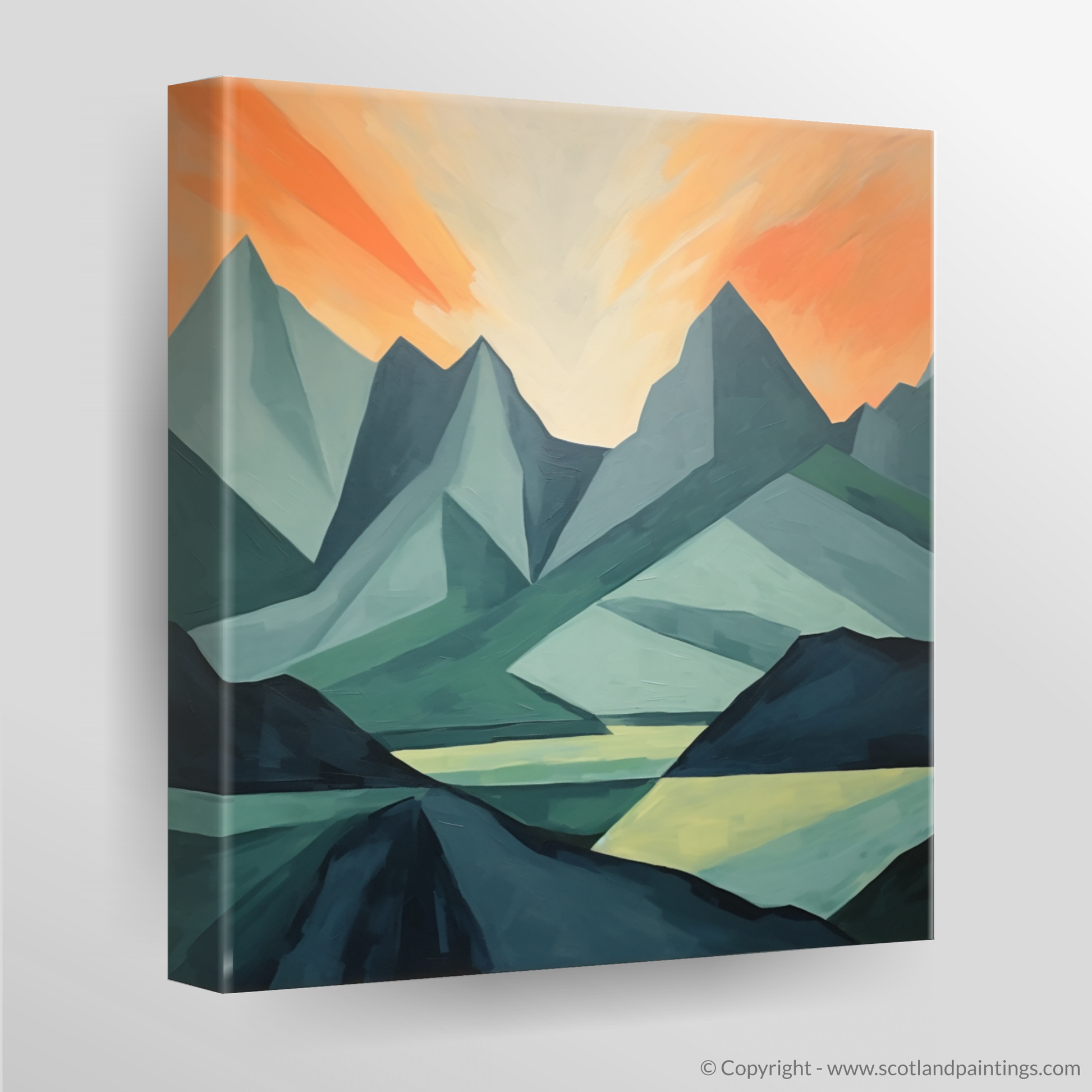 Immerse yourself in the serene yet striking elegance of the Scottish Highlands with this captivating minimalist rendition that captures the essence of Glencoe's fiery skies soaring over its majestic peaks. Boasting a vibrant and emotive palette, this piece eloquently juxtaposes the fierce warmth of the sunset with the cool, tranquil tones of the rugged glacial valleys below.