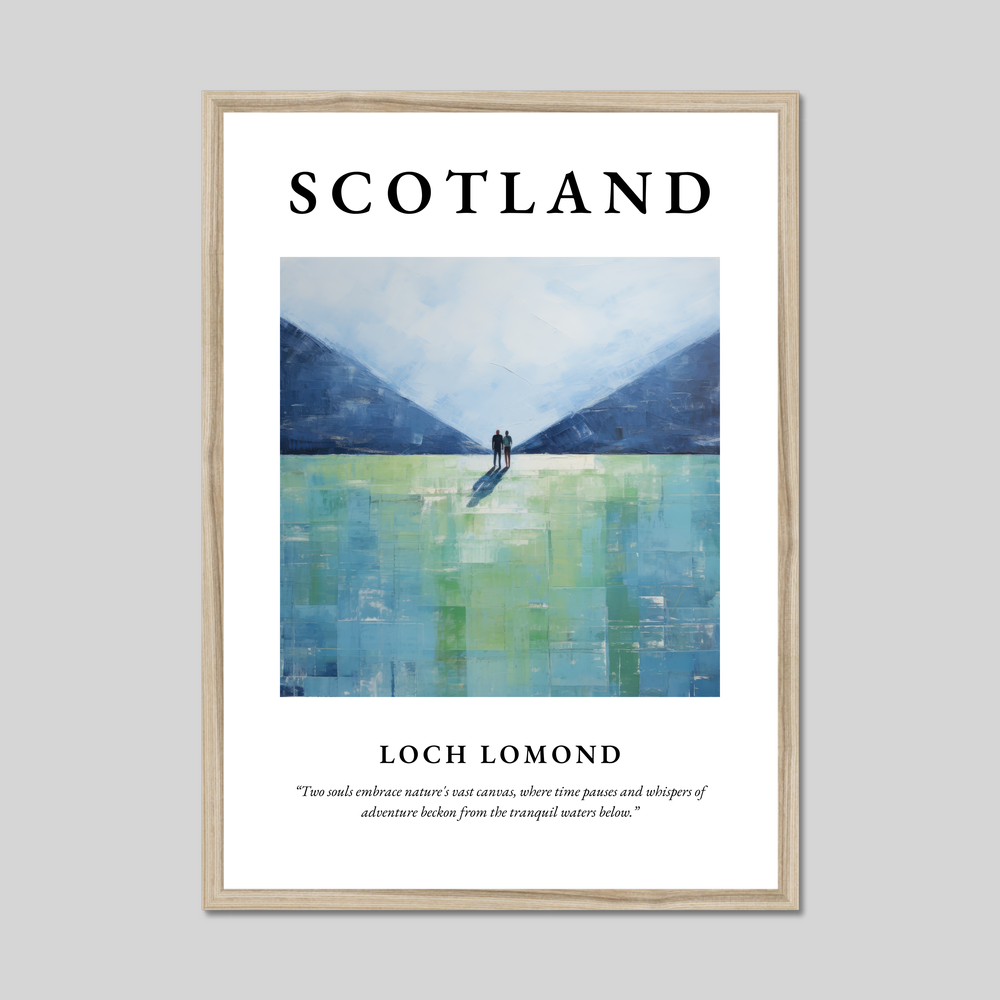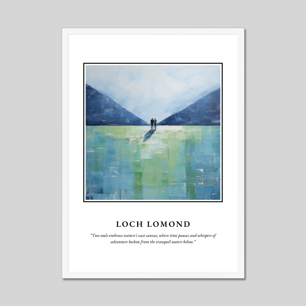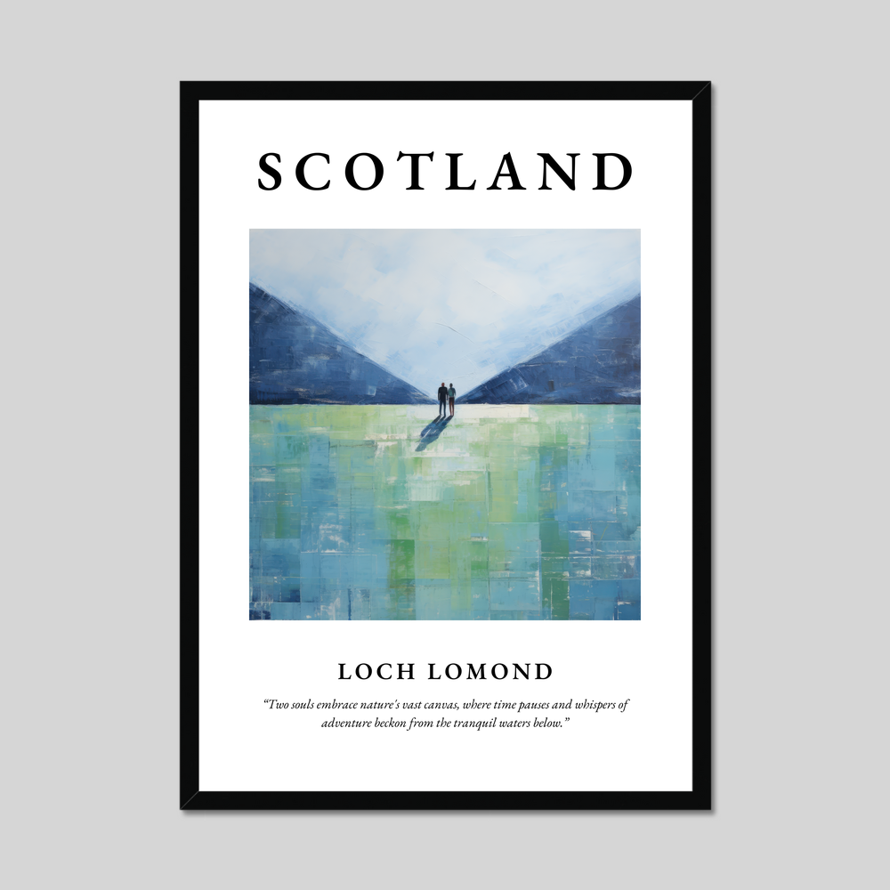 At the top, bold letters spell out "SCOTLAND," immediately drawing the eye to the essence of this breathtaking country. Below, a serene minimalist painting of Loch Lomond captures the soulful essence of this legendary place. The painting showcases two figures standing together, embraced by nature's simple yet profound expanse, as the landscape plays with hues of blue and green. The geometric style breaks down complexity into simplicity, making it a perfect piece for those who appreciate the beauty of minimalism or have a personal connection to Scotland.