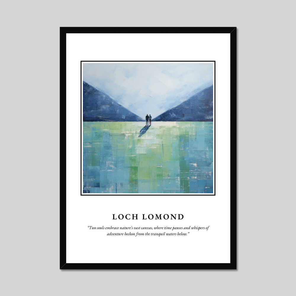 Accompanying the image is the evocative quote: “Two souls embrace nature's vast canvas, where time pauses and whispers of adventure beckon from the tranquil waters below.” This phrase perfectly encapsulates the spirit of Loch Lomond and invites viewers into a world where time stands still and nature's whispers beckon.