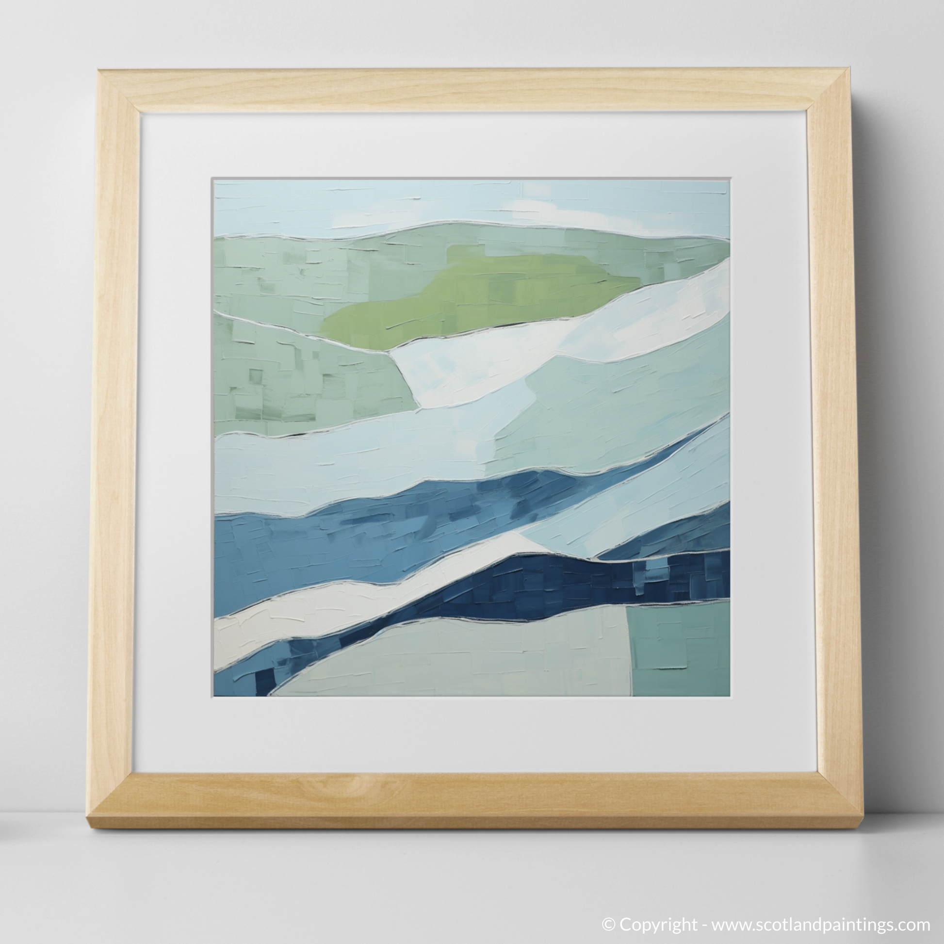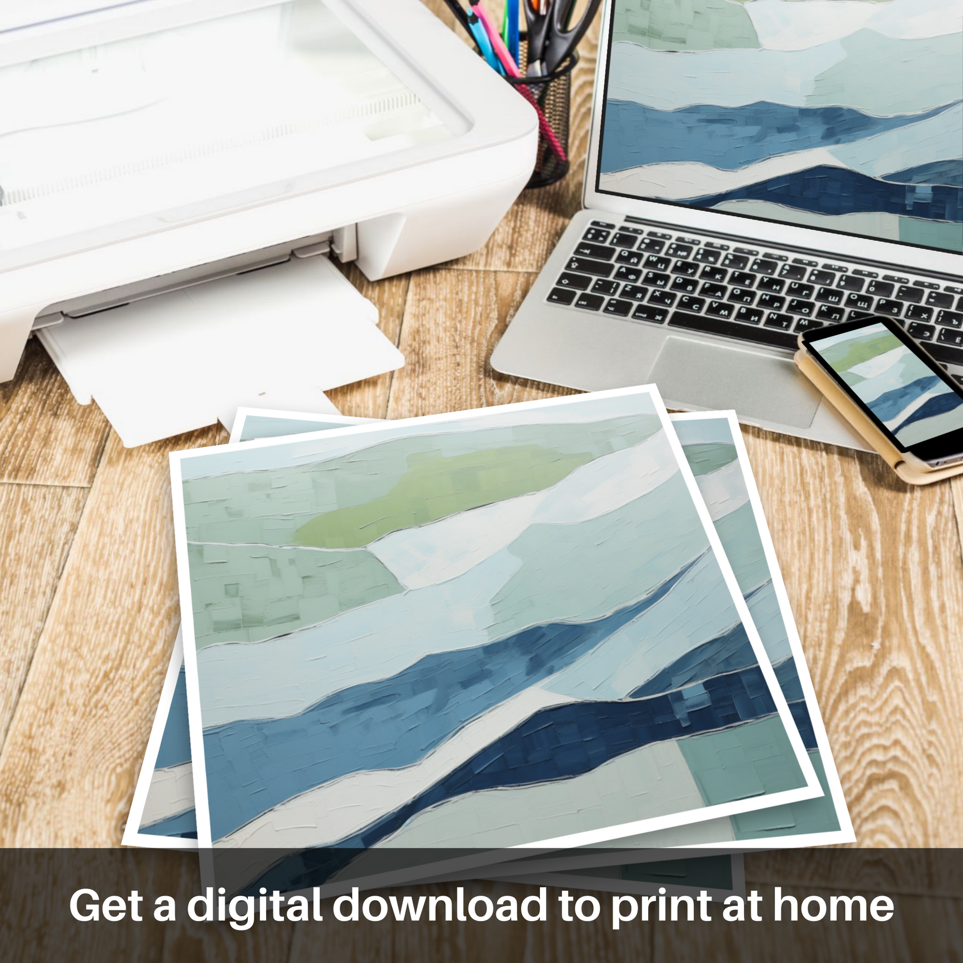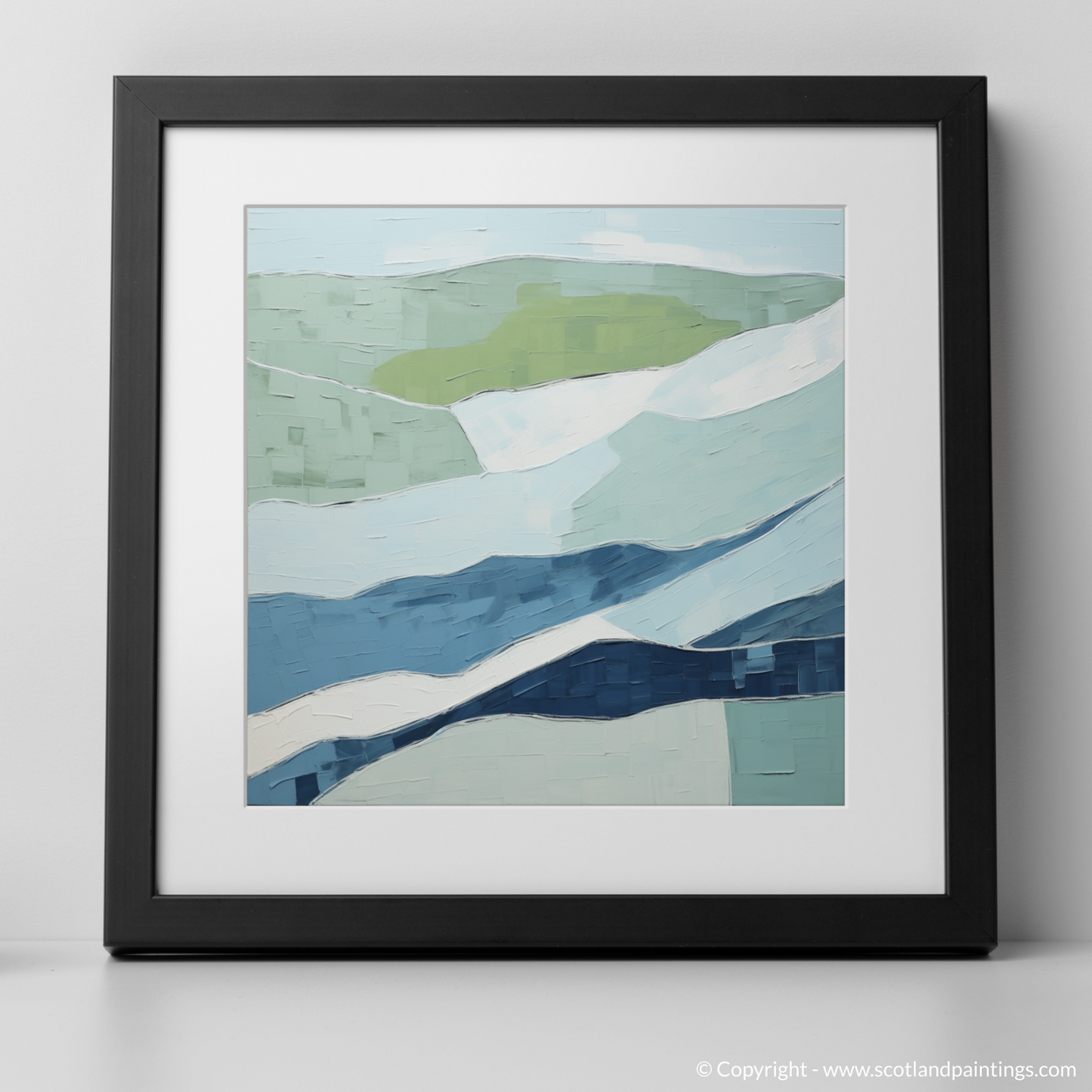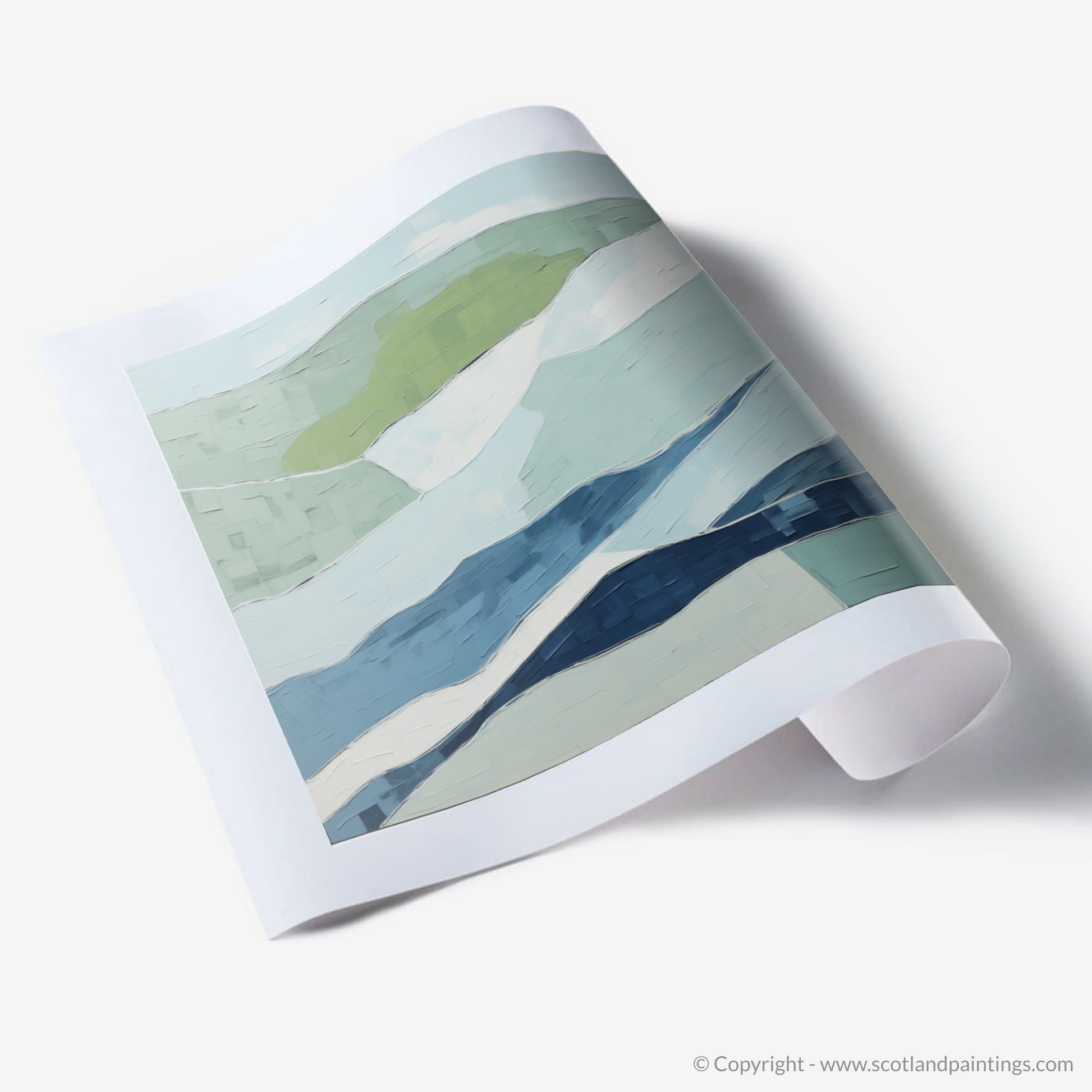Embrace the tranquillity and stillness of Perthshire with this evocative minimalistic print. Inspired by the serene River Earn as it meanders through the lush landscapes of Scotland, this piece captures the essence of simplicity and elegance in art. The print features a deftly pared-down palette dominated by blue and green hues, evoking the cool waters of the river juxtaposed against the verdant rolling hills—weaves of nature's own fabric.