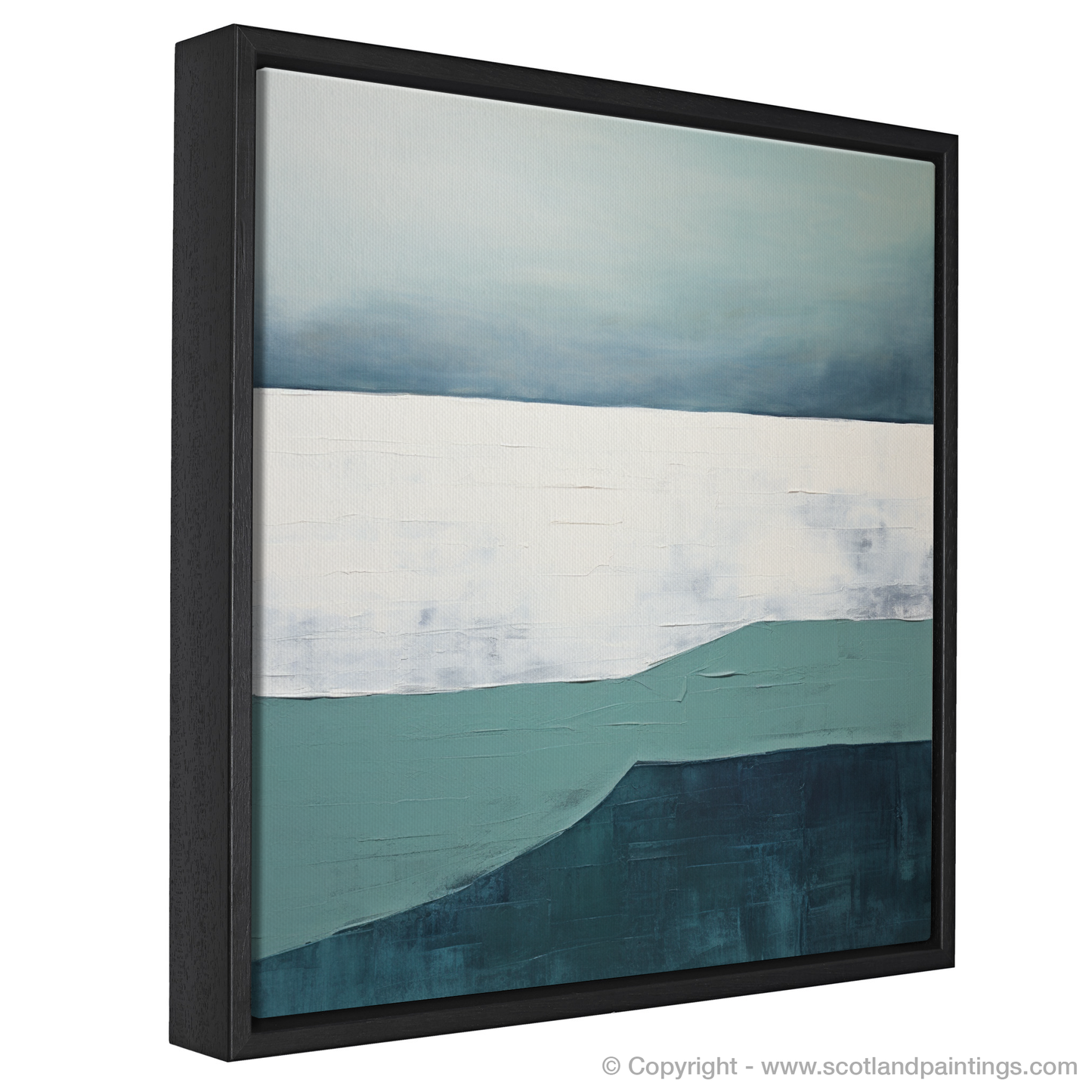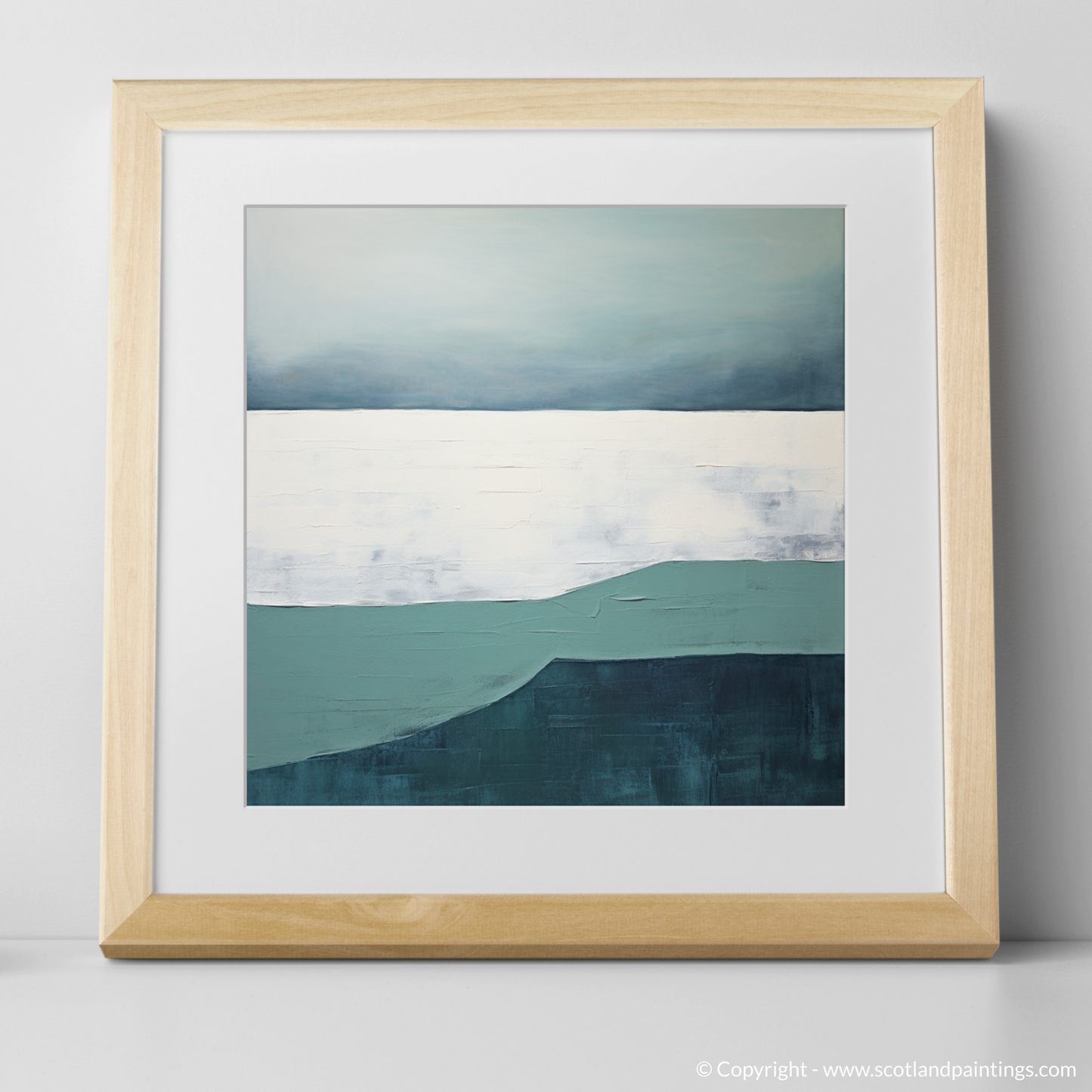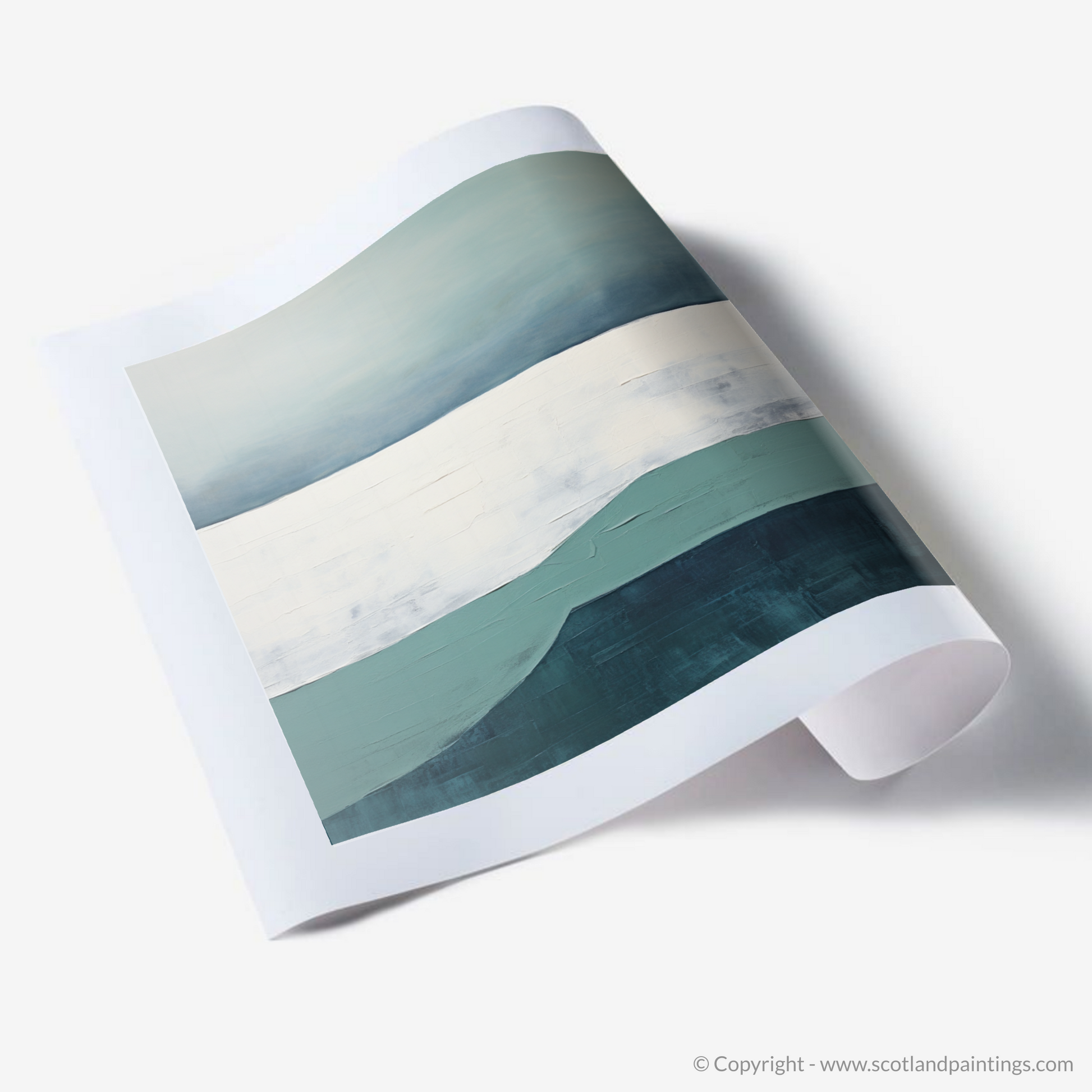 As the hues of twilight embrace the Silver Sands of Morar, this evocative print captures the serene essence of dusk with its minimalist interpretation. Subtle gradations of teal and deep marine blues conjure the sea's gentle undulations, while a crisp horizon line separates the water from the broad expanse of the sky. Above, an array of muted sky blues softly transitions into a pellucid white—a tranquil portrayal of the fleeting daylight fading into evening.