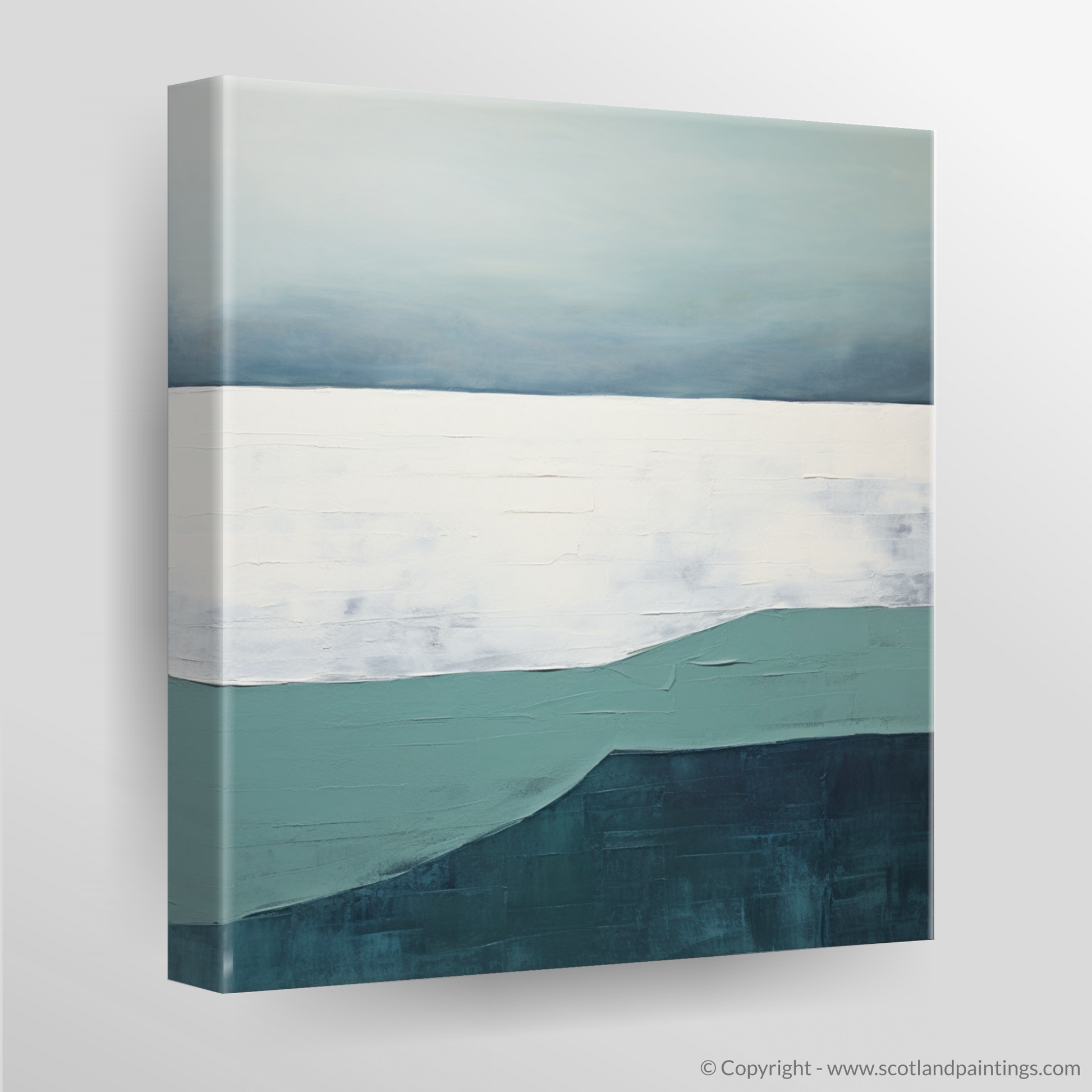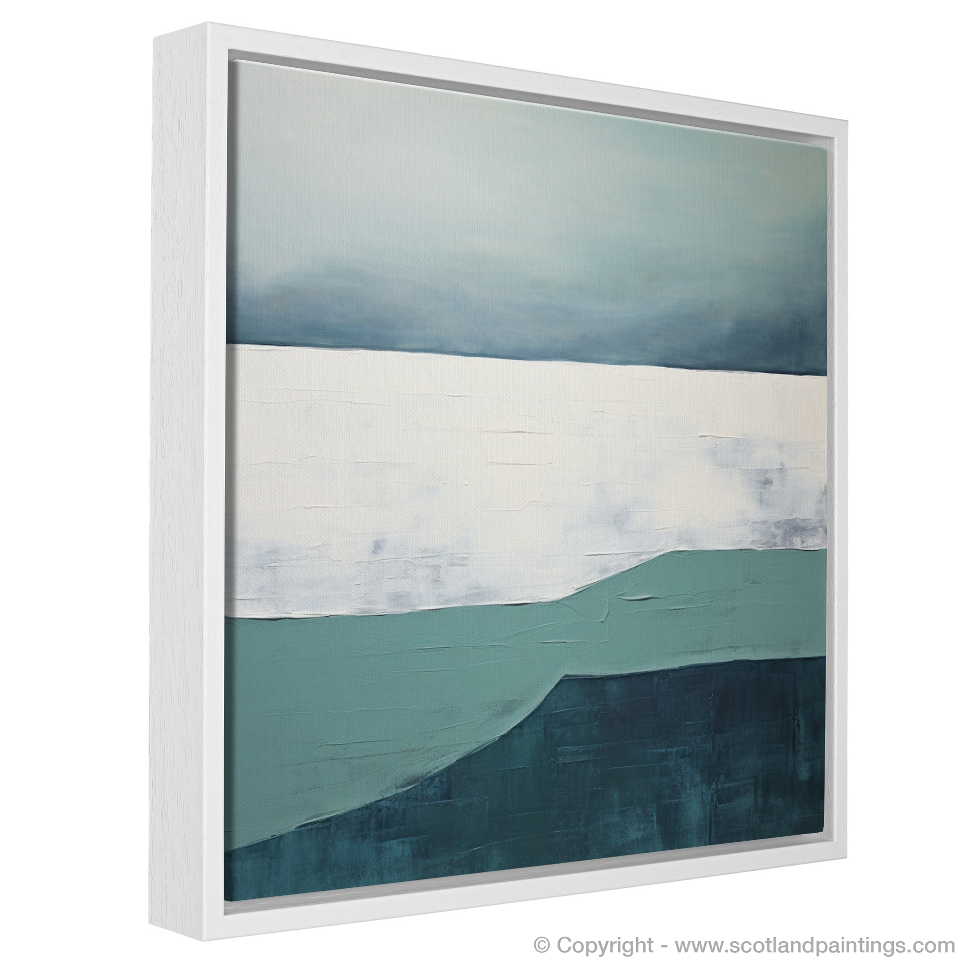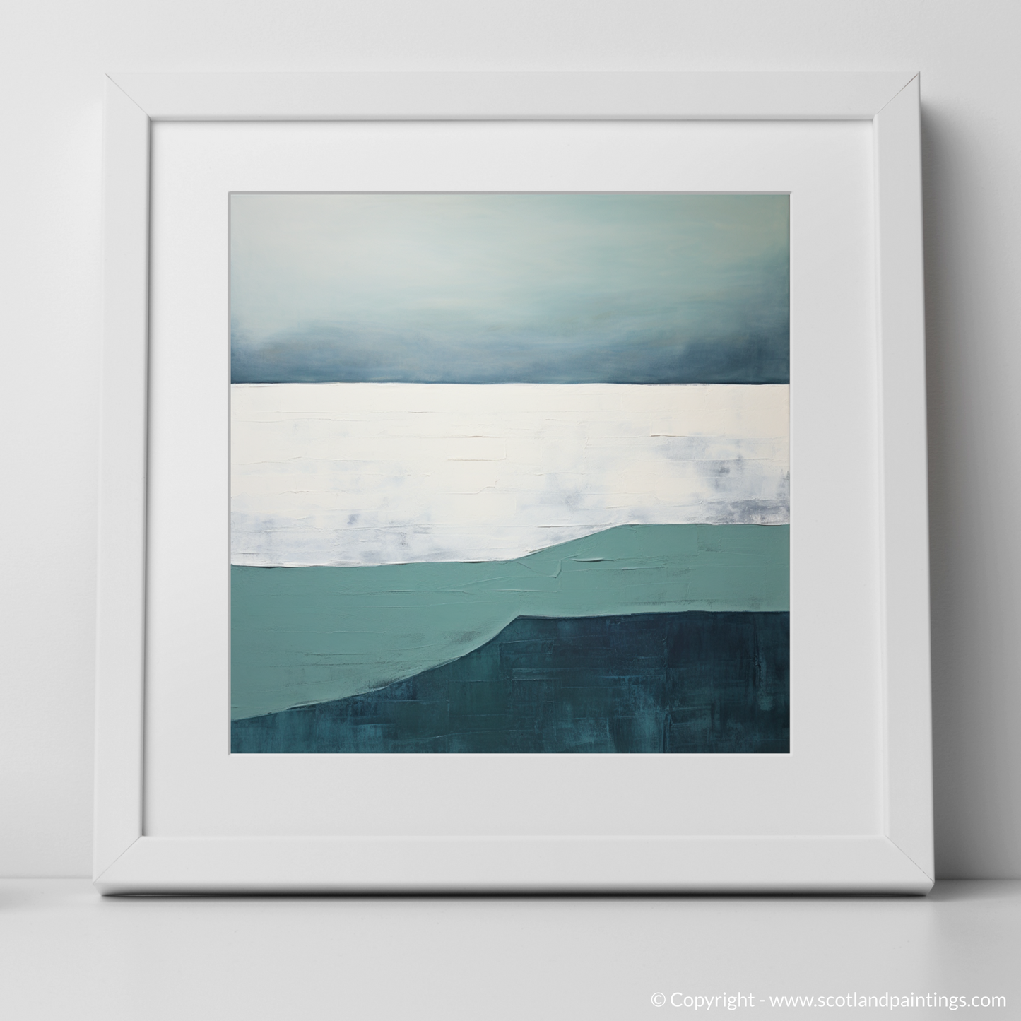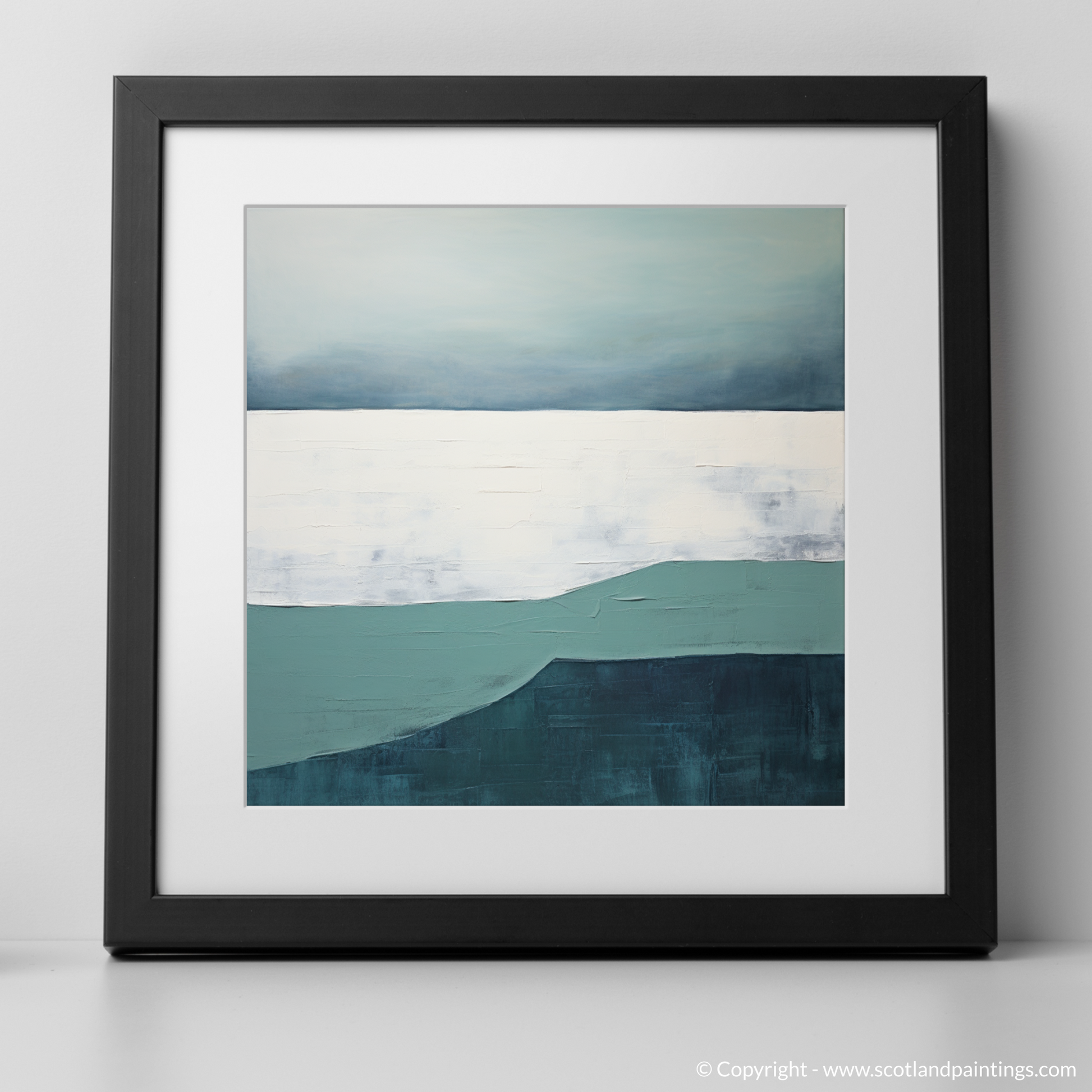 The depiction cleverly employs negative space to suggest the vast openness of the Scottish coastline, as well as to evoke a sense of calm and introspection. Broad, textured strokes in white and soft grey suggest the sandy shore, integrating a tactile dimension that contrasts with the smoothness of the sea and sky.