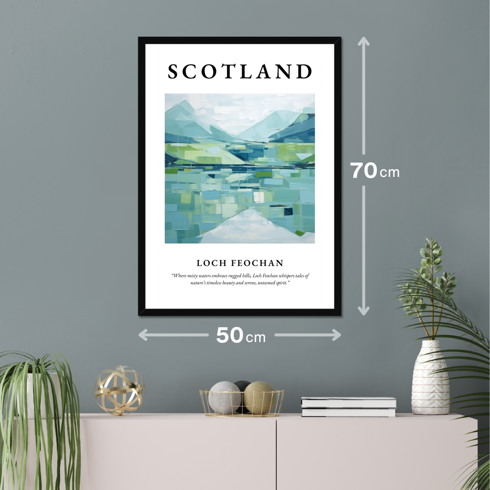 Underneath, a poetic quote whispers of the loch's allure: “Where misty waters embrace rugged hills, Loch Feochan whispers tales of nature’s timeless beauty and serene, untamed spirit.” The result is a breathtaking composition that appeals not only to admirers of Scotland’s natural beauty but also to those who appreciate the art of minimalism. This large piece offers an affordable way to cover significant wall area while making a bold aesthetic statement.