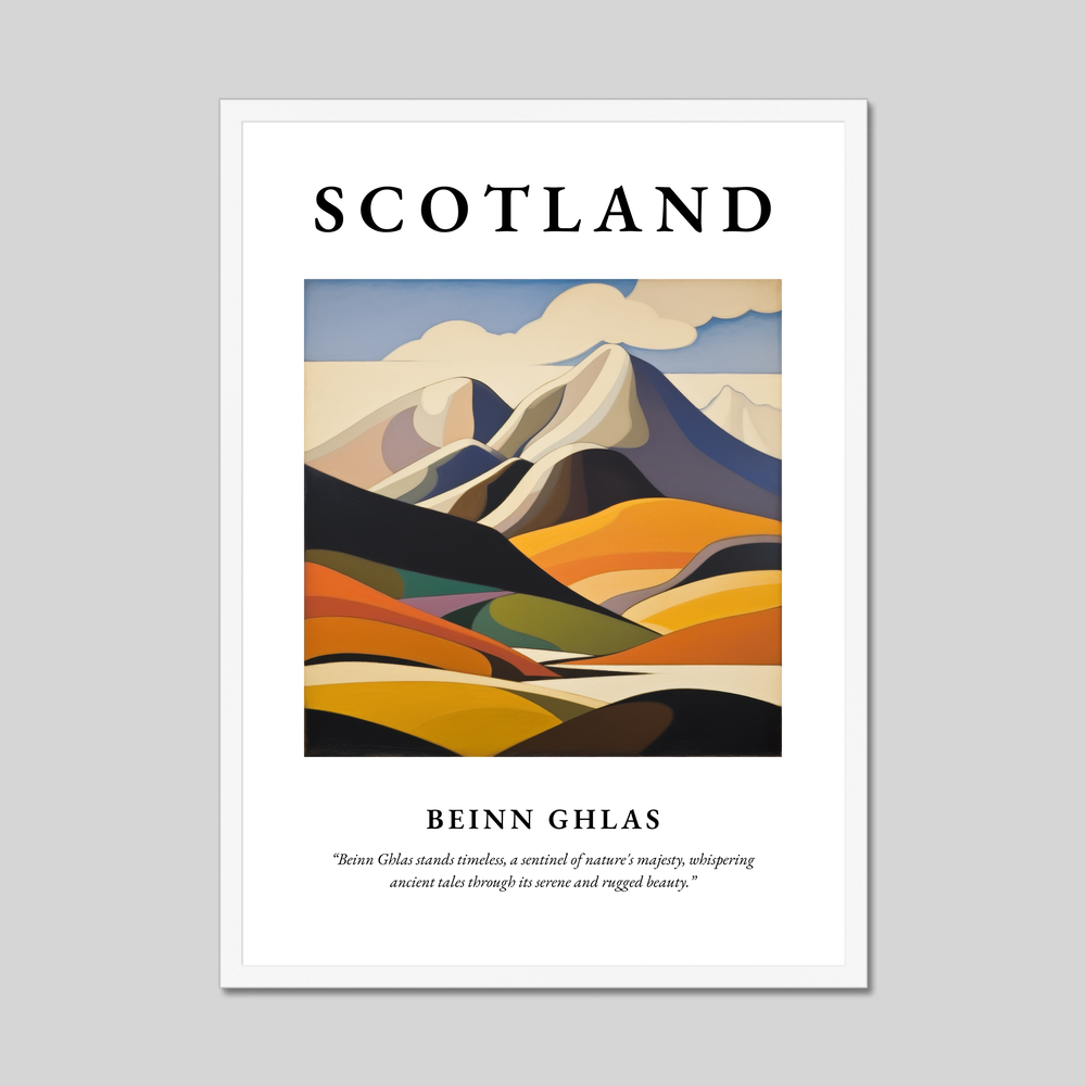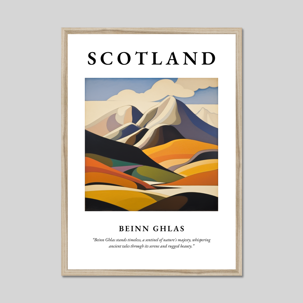 Introduce a touch of Scottish serenity to your space with our exquisite framed poster print of Beinn Ghlas. Measuring an impressive 50cm x 70cm, this large-format poster is perfect for those who want to make a bold statement on their walls without breaking the bank. Available in versatile black, crisp white, or a natural wood-effect frame, this piece seamlessly fits into any decor style, bringing a modern yet timeless feel to your home or office.