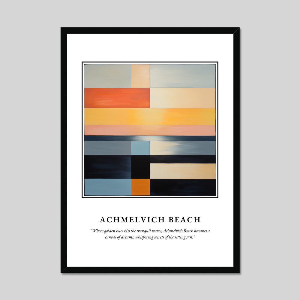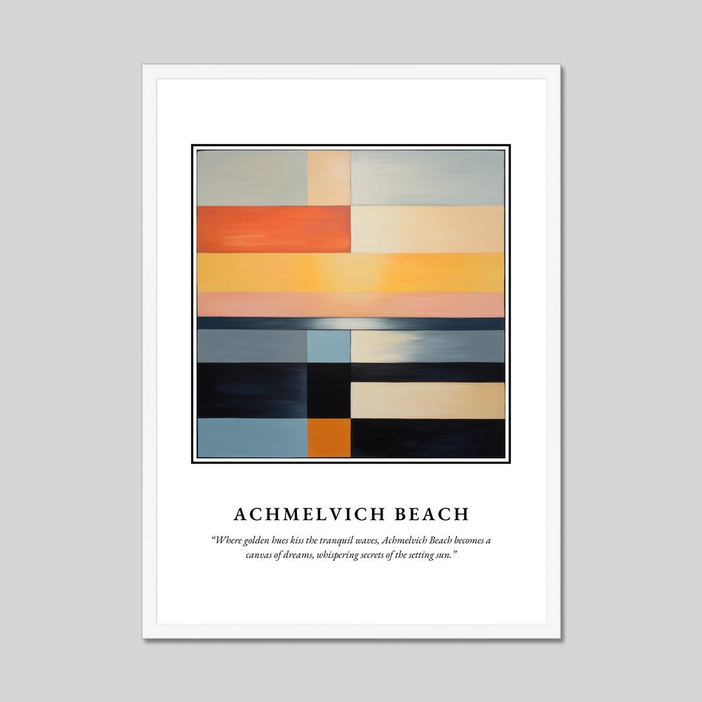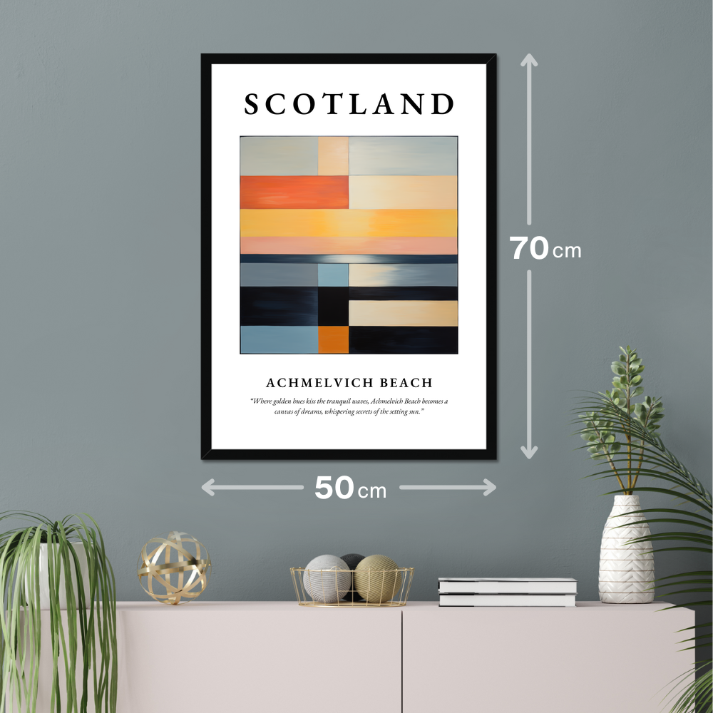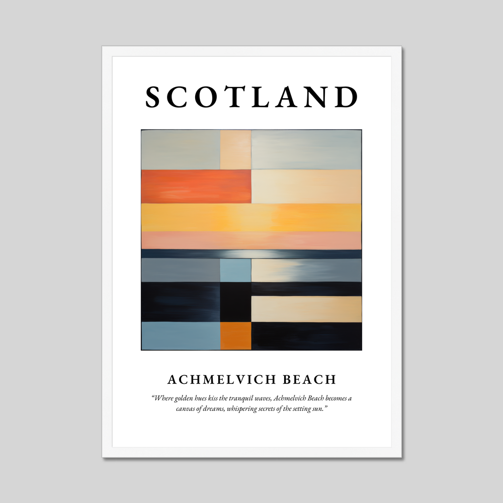 Achmelvich's beauty is captured not just in its striking landscapes but in its tranquillity, so vividly suggested in this minimalistic interpretation. The beach is part of Scotland's unique coastal charm, where history and nature blend seamlessly. With this poster, you bring not only a piece of art into your home but a whisper of the secrets held by the timeless waves and sands of Achmelvich Beach.