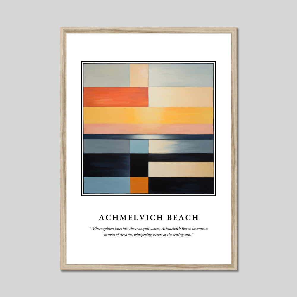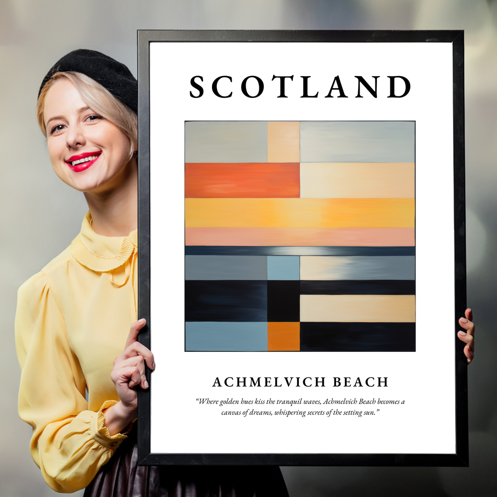 At the heart of the poster is a minimalist painting that elegantly encapsulates the essence of Achmelvich Beach. The abstract composition features harmonious blocks of colour that play between soft golden hues and tranquil blues, evoking the gentle kiss of waves at sunset. The painting invites the viewer to find calm and beauty in its simplicity—appealing to lovers of art and minimalism alike. Beneath the painting, the emotive quote whispers the thoughts of those who yearn for the serene beauty of Scotland's rugged coastlines.