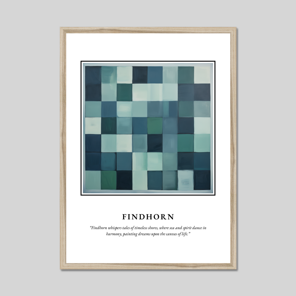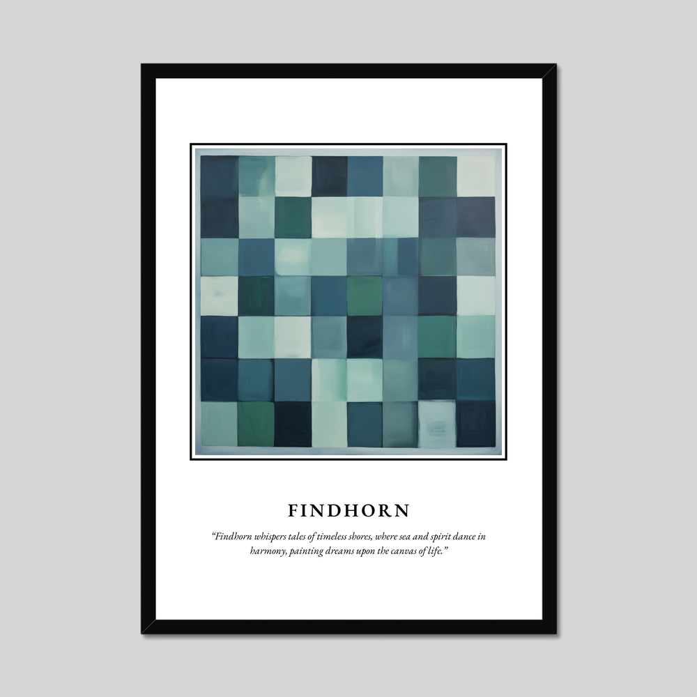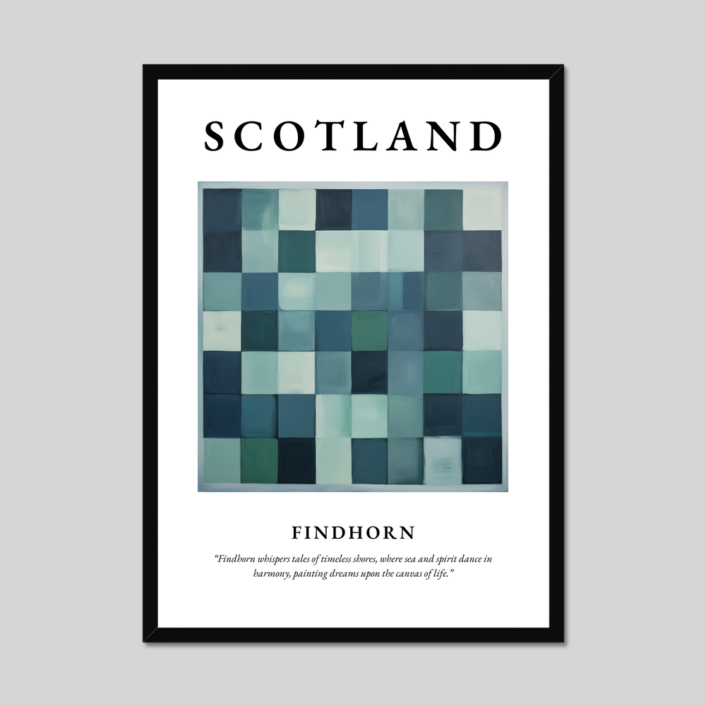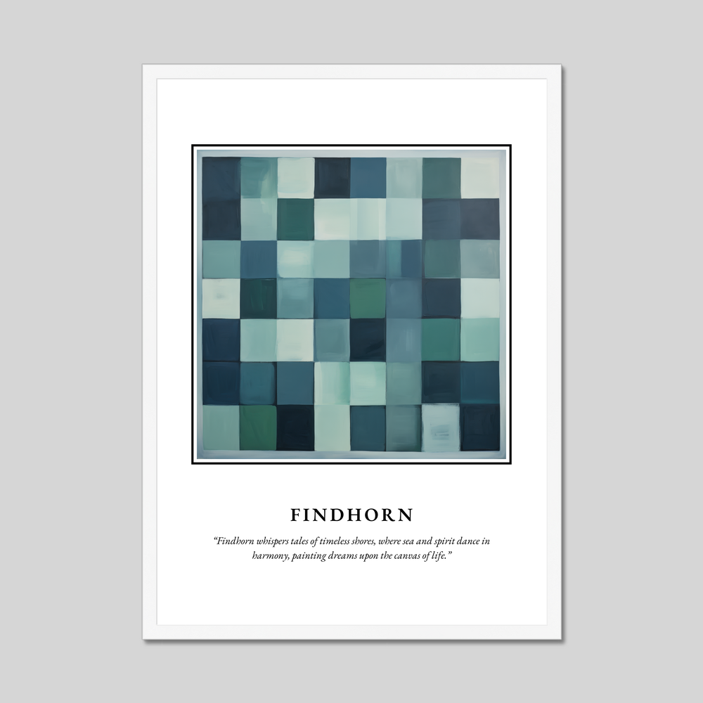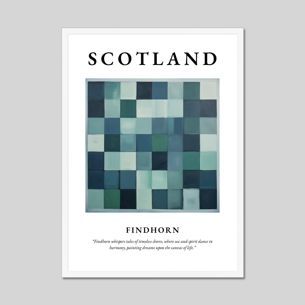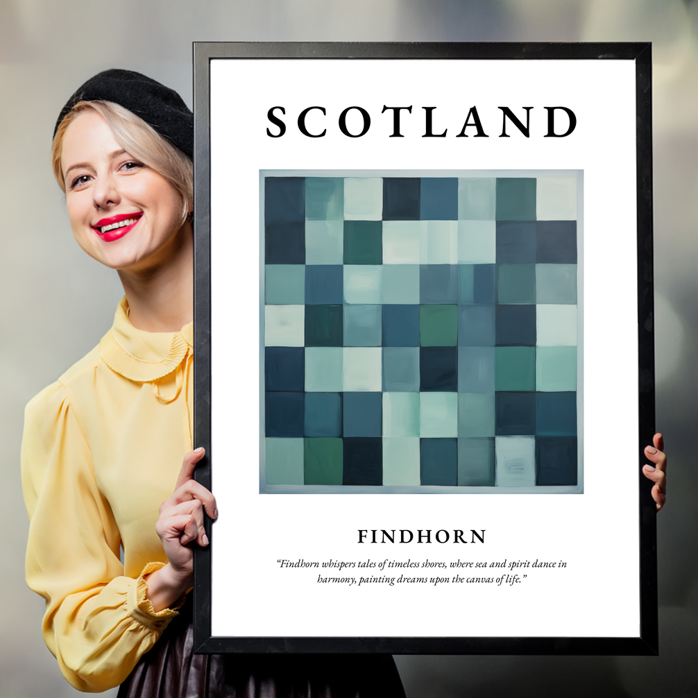 Below the bold “SCOTLAND” header, the artwork is neatly underscored with the poetic wonder: “Findhorn whispers tales of timeless shores, where sea and spirit dance in harmony, painting dreams upon the canvas of life.” This evocative quote encapsulates the mysterious charm of Findhorn, a place where every breeze speaks stories of ancient shores and boundless dreams.