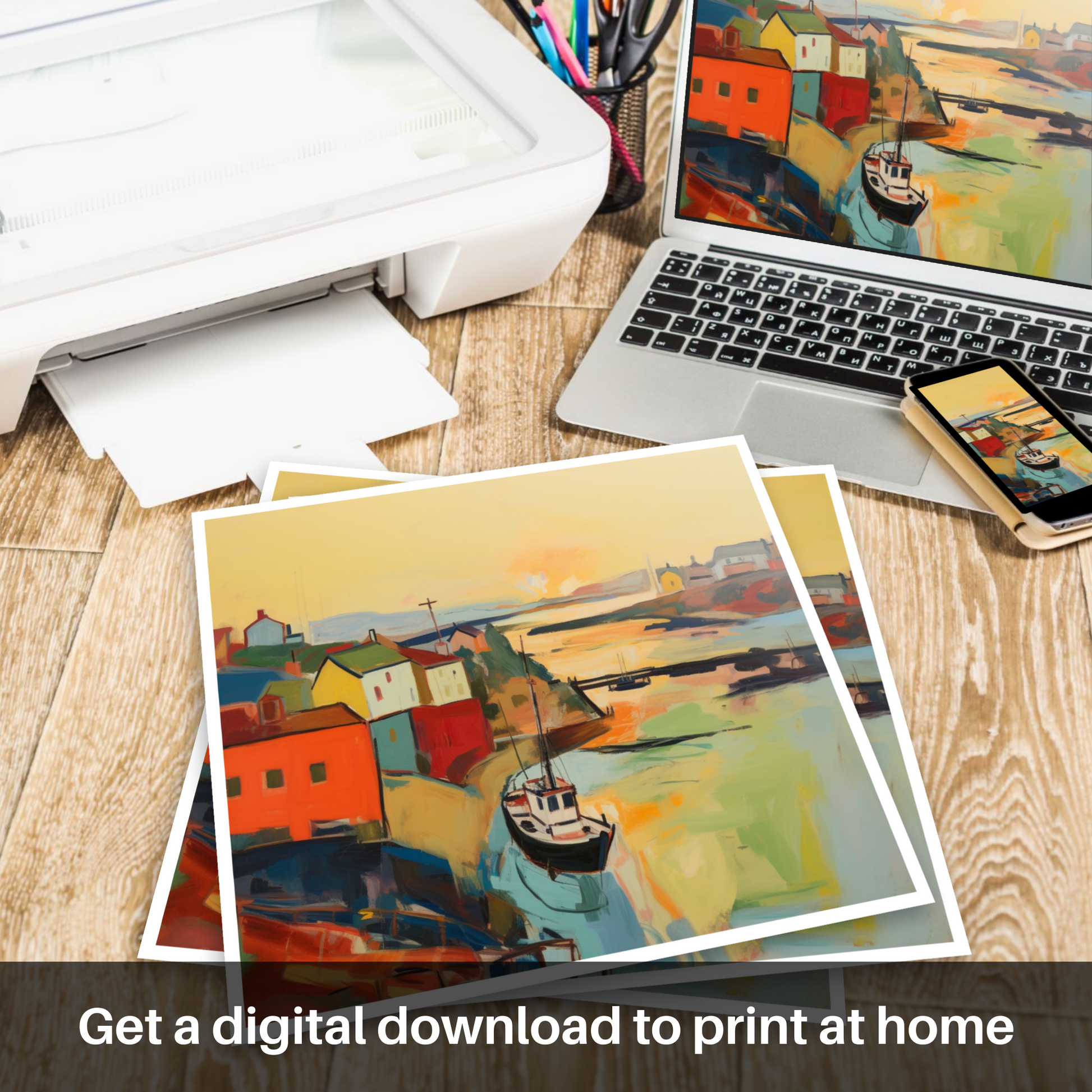 Let the essence of the serene Macduff Harbour at golden hour envelop your space with this exquisite abstract print. Brimming with a rich tapestry of colours, the artwork encapsulates the time of day when the sun kisses the horizon and the sky becomes a canvas painted with hues of warm gold, blushing pinks, and cool blues.