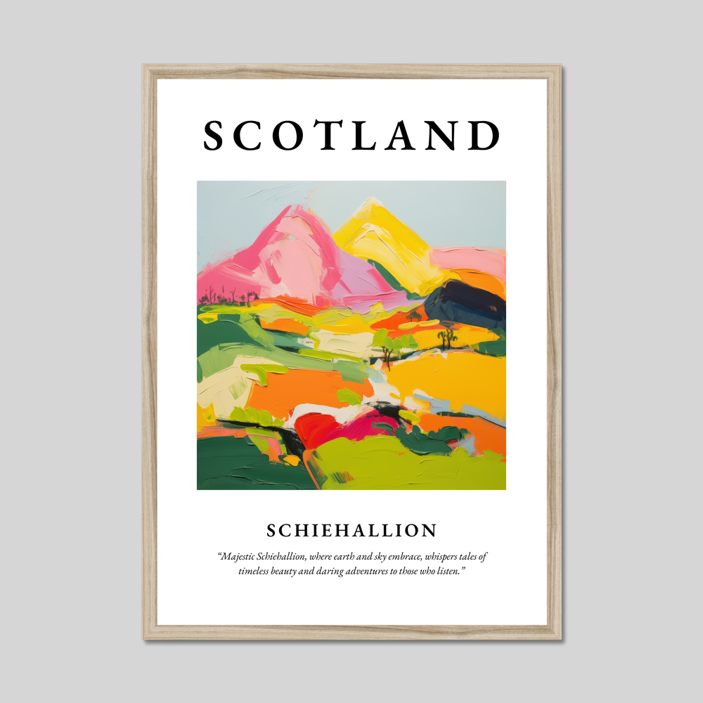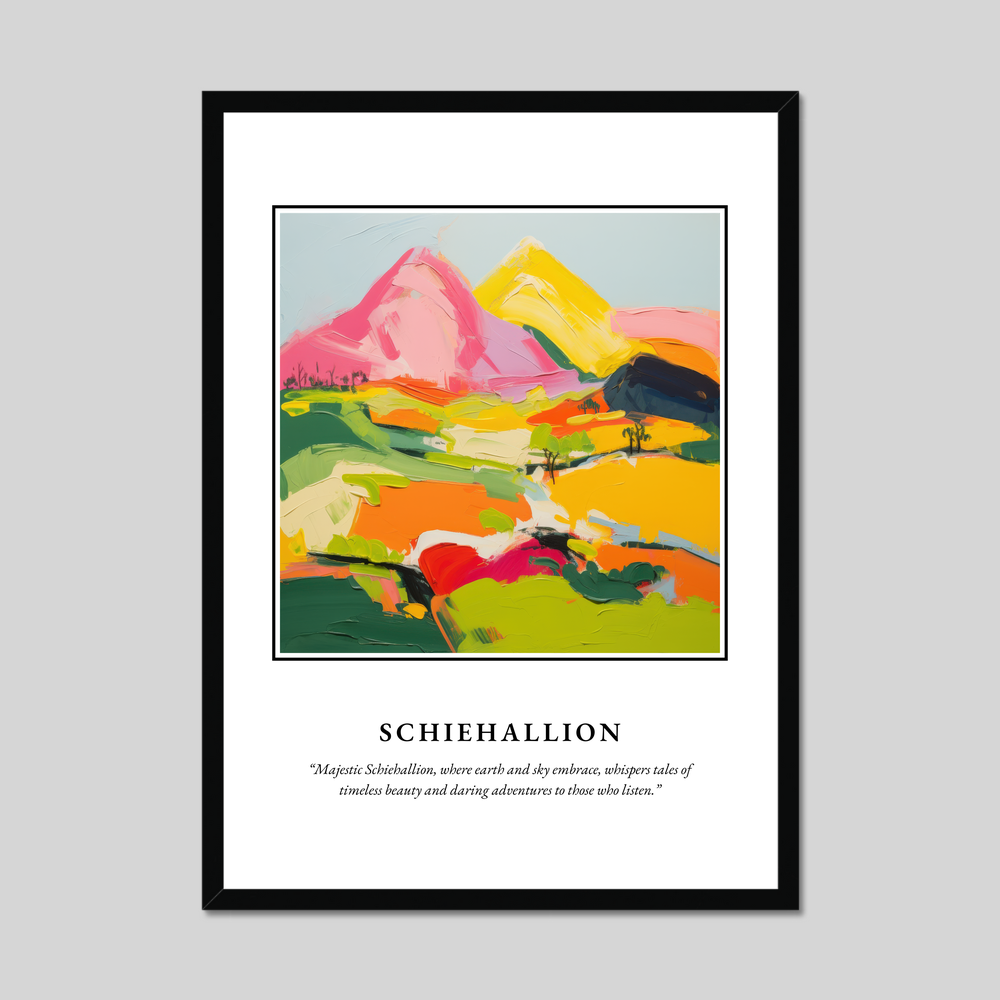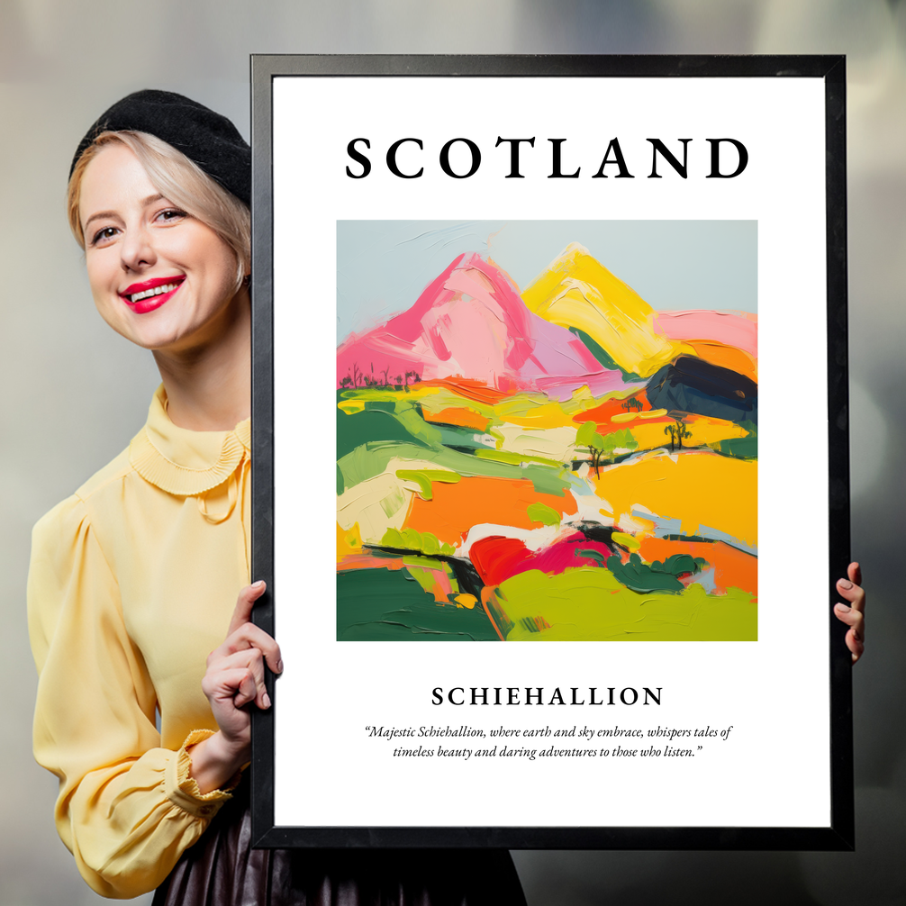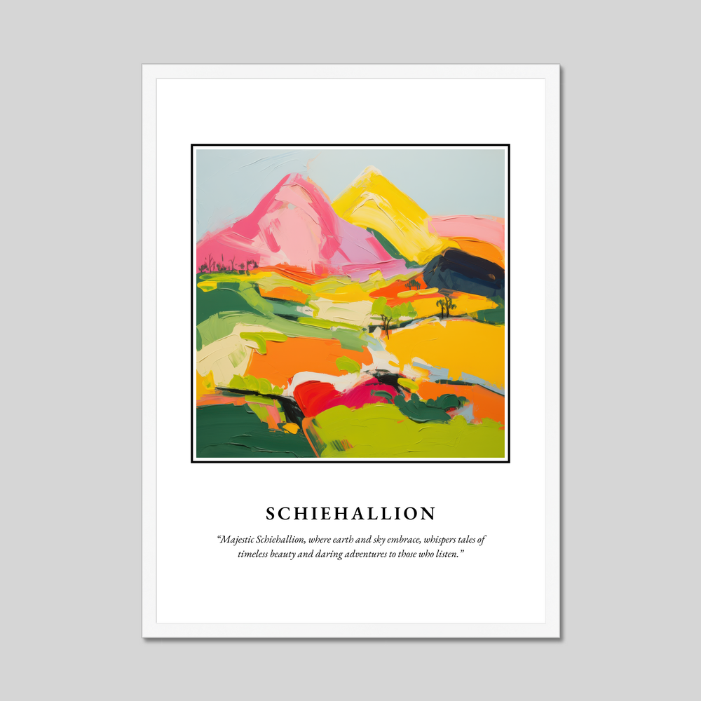 Beneath the painting, the evocative quote, “Majestic Schiehallion, where earth and sky embrace, whispers tales of timeless beauty and daring adventures to those who listen,” adds an enchanting layer of storytelling to this masterpiece.
