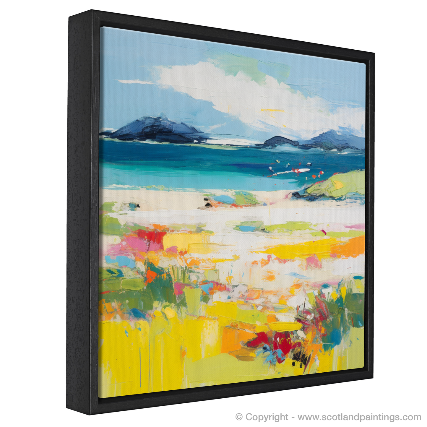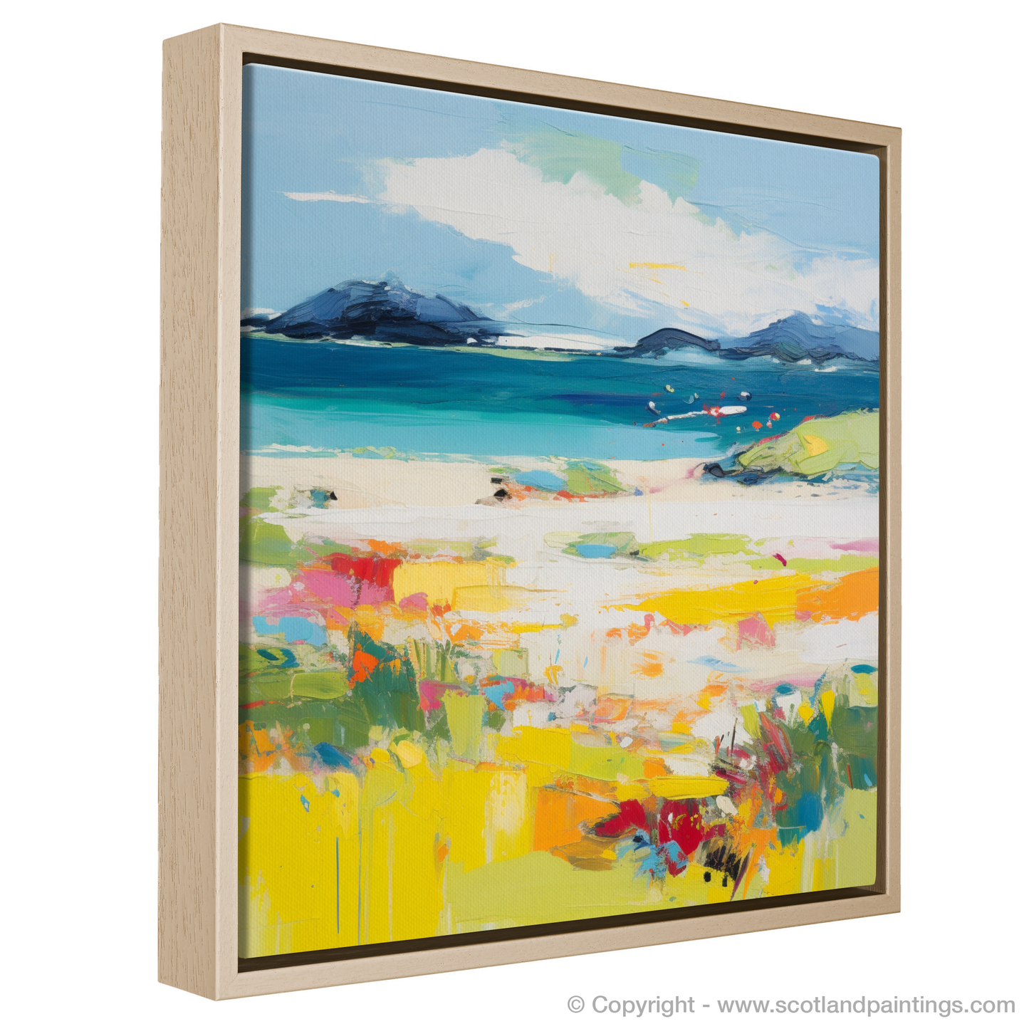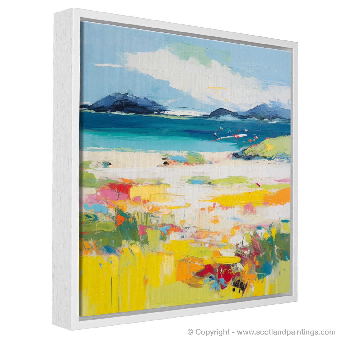 The shoreline is an abstracted celebration of form and hue. Swathes of white and yellow converge upon the canvas, conveying the luminous sands that define Arisaig Beach. Bursts of pink, red, and green are strewn about like wildflowers in bloom, suggesting a rich, undefined flora that thrives in this artistic interpretation.