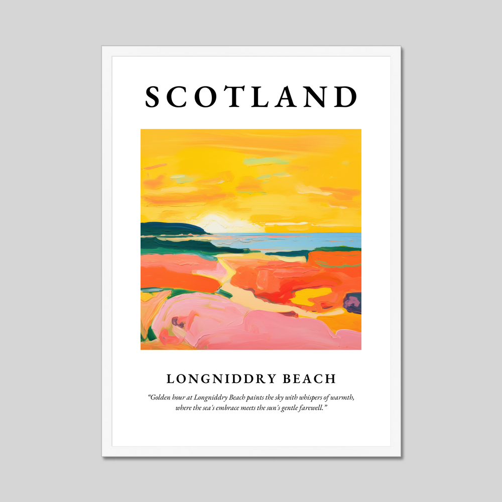 At the top of the poster, the word “SCOTLAND” is emblazoned in bold lettering, immediately drawing your gaze to the heart of our “Abstract” collection. Below, an evocative painting captures the golden hour at Longniddry Beach, where vibrant hues meld into one another, whispering warmth and showcasing the dynamic interplay between sea and sky. Beneath this vivid depiction, the phrase “Golden hour at Longniddry Beach paints the sky with whispers of warmth, where the sea's embrace meets the sun's gentle farewell” adds a poetic layer, inviting reflection and a sense of serenity.