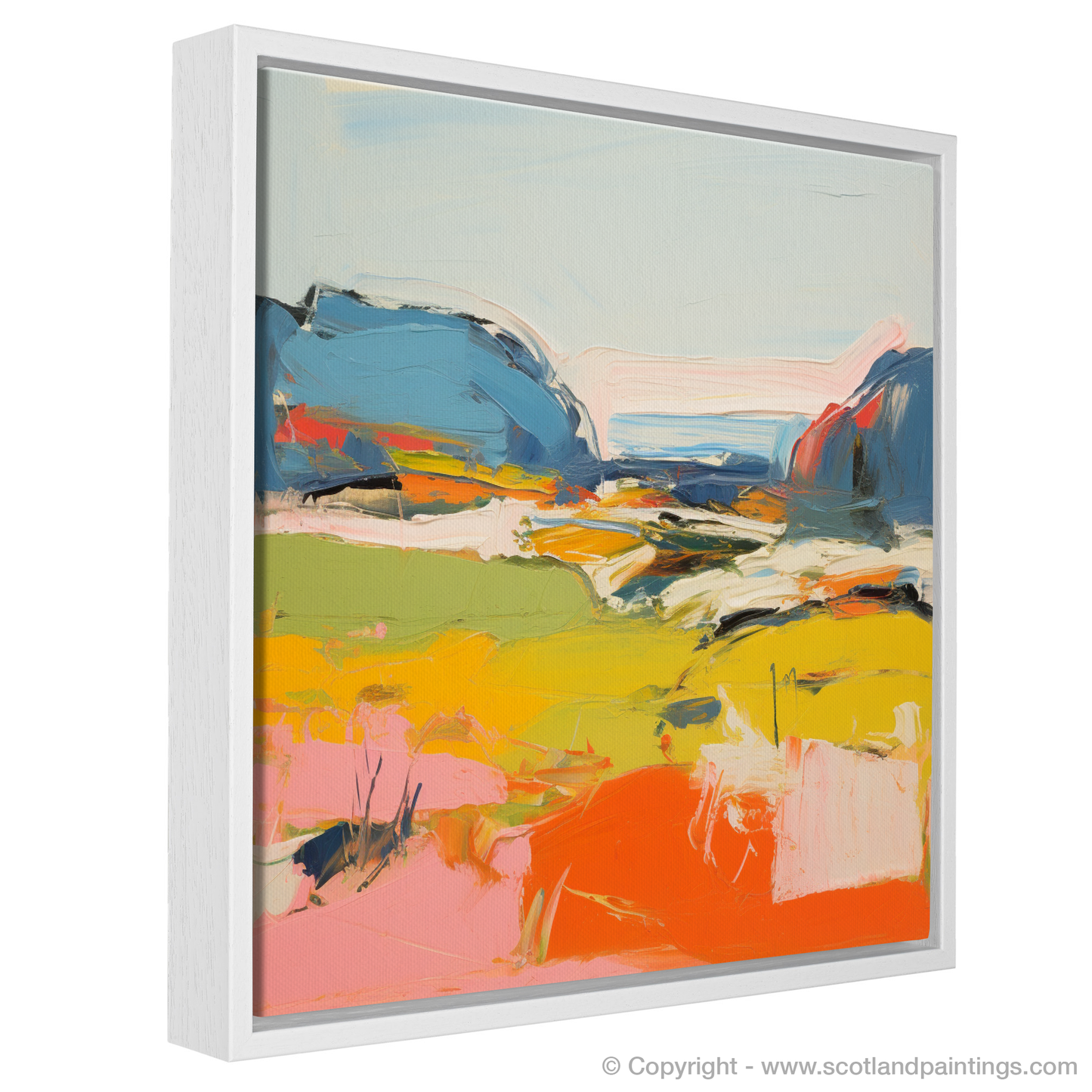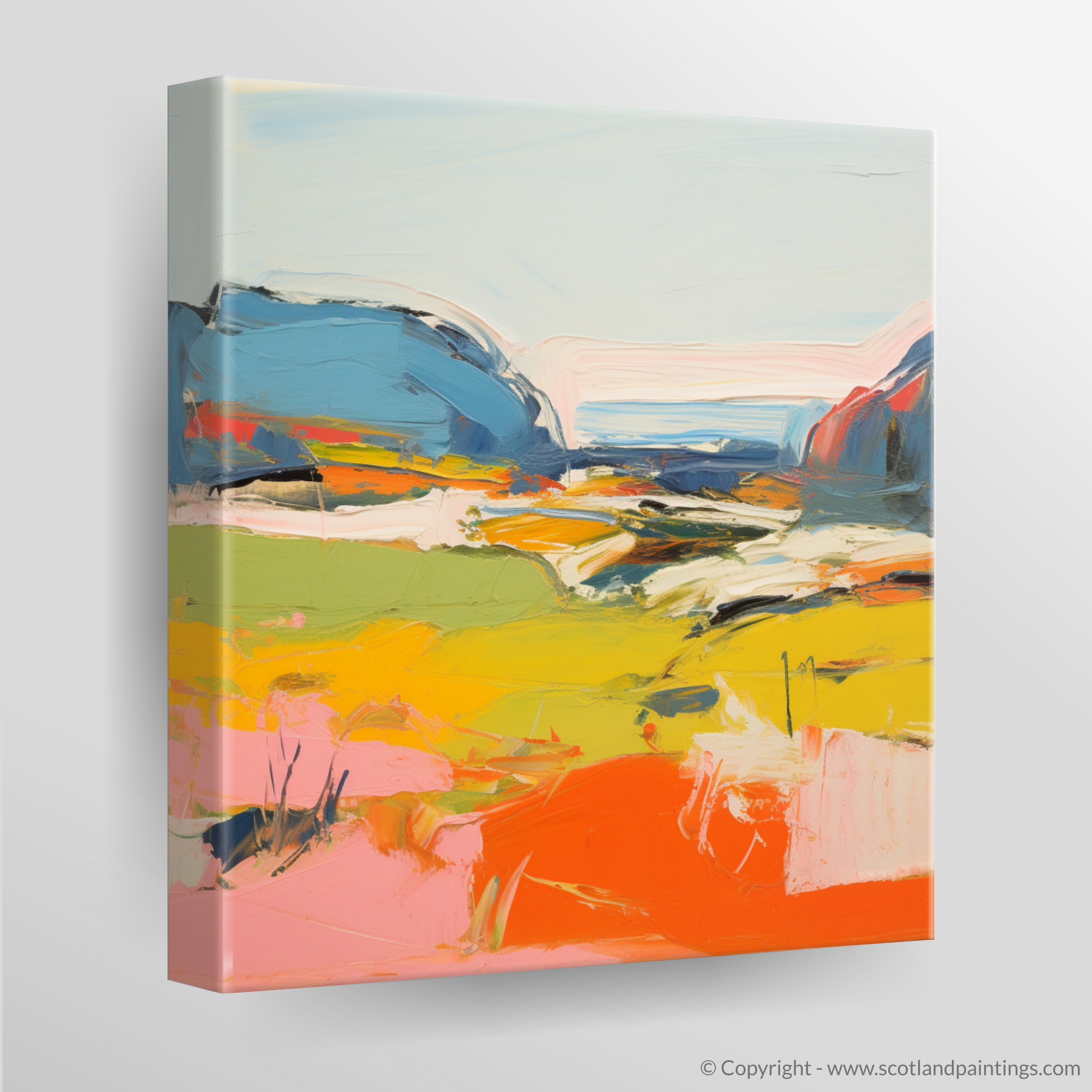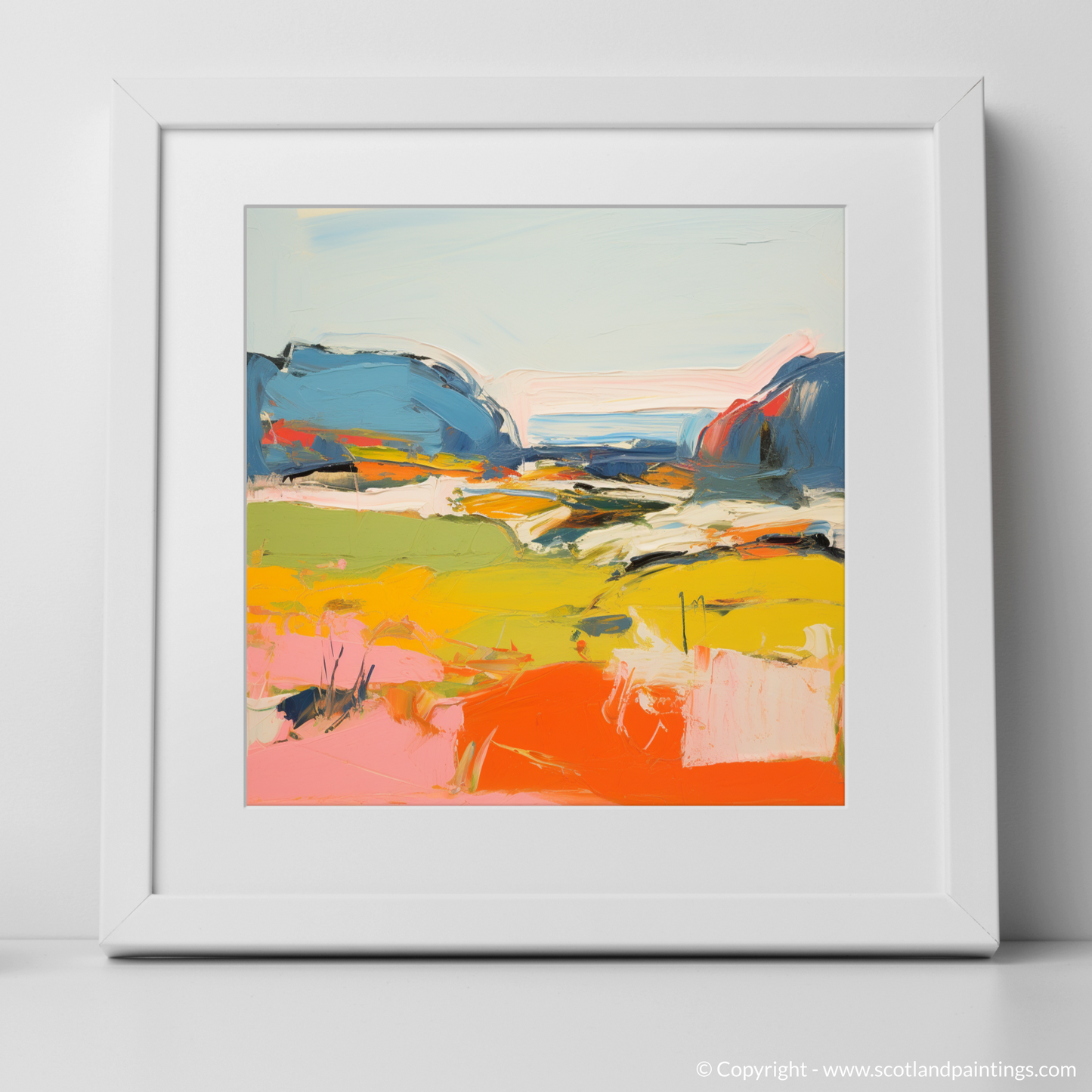 Embark on a visual journey through the essence of Lochinver, Sutherland, as this exquisite abstract print captures the vibrant spirit of the Scottish landscape in a riot of colour and form. Bold strokes and sweeping gestures of orange, pink, and yellow dance across the piece, reminiscent of the wild heather and gorse that speckle the highland plains, while verdant greens and cool blues suggest rolling hills and distant shorelines under a wide, open sky.