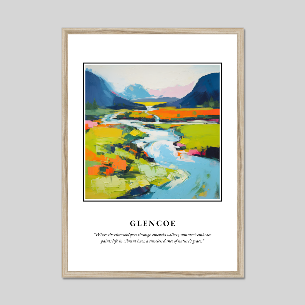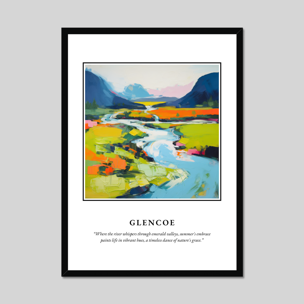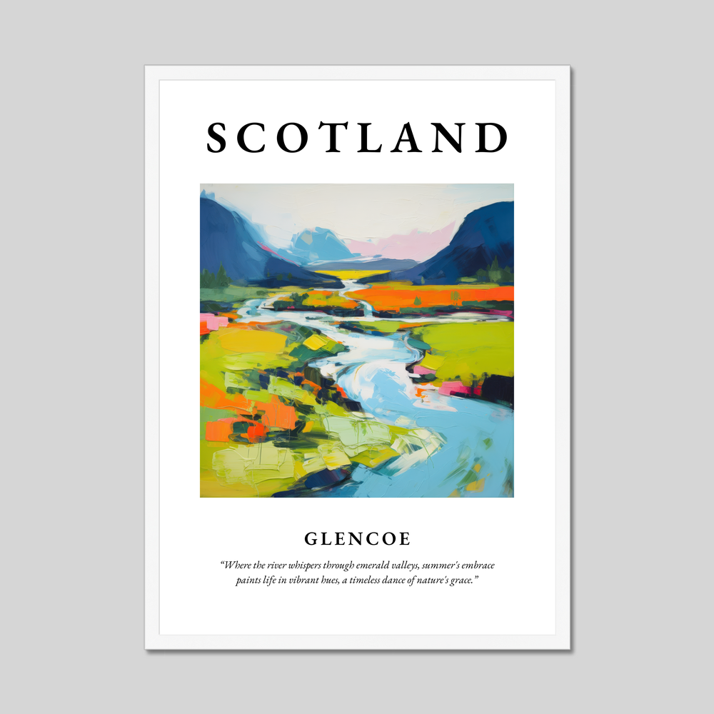 Below, the vibrant painting captures the essence of Glencoe in an abstract style, where swirling colours meet the imagination. The emerald valleys flow seamlessly with the river, a dance of blues and greens intertwined with bursts of warm hues. This vivid depiction invites art lovers and adventurers alike to bask in the emotional resonance of Scotland’s dramatic landscapes. The quote, “Where the river whispers through emerald valleys, summer's embrace paints life in vibrant hues, a timeless dance of nature's grace,” adds a poetic layer, enhancing the overall dream-like quality of this piece.
