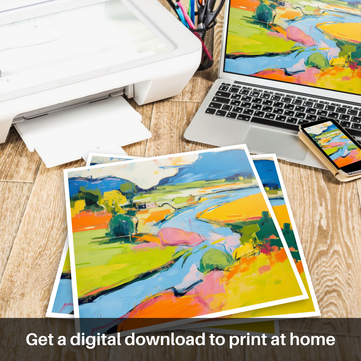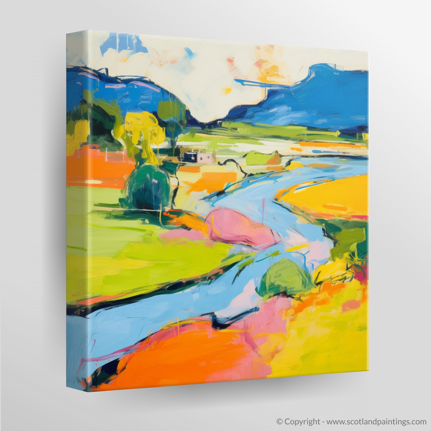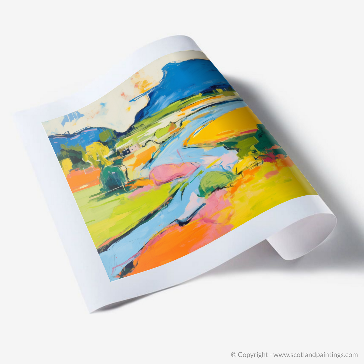 Immerse yourself in the vibrant essence of summer encapsulated within this abstract homage to the serene beauty of River Lyon, Perthshire. Bold and invigorating brushstrokes dance across the canvas, depicting an interpretative landscape alive with exuberant colour. This spirited piece plays host to a riveting palette of azure blues, lush greens, and sun-kissed yellows, masterfully intertwined with splotches of warm oranges and pinks reminiscent of a summer sunset.