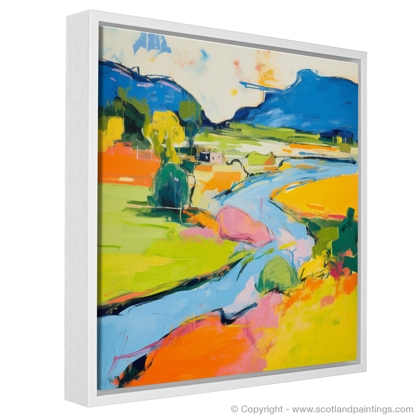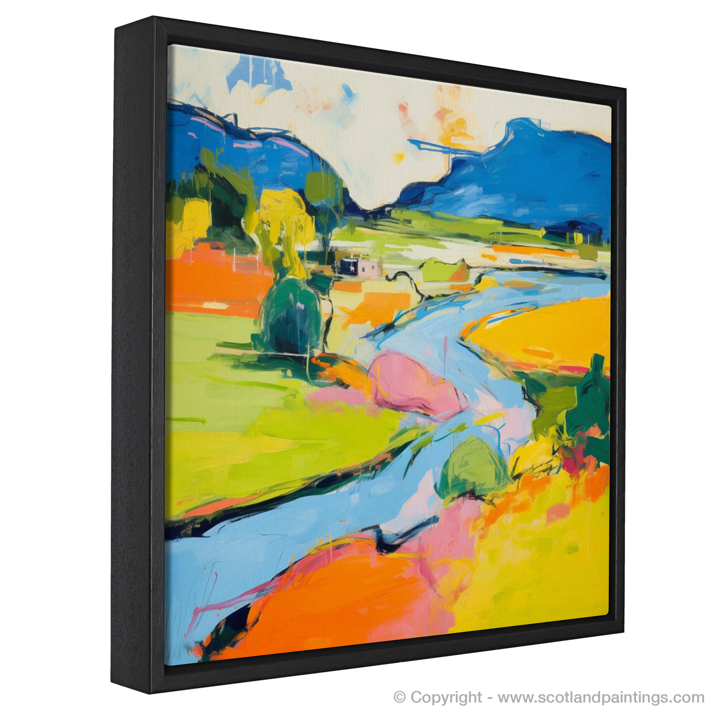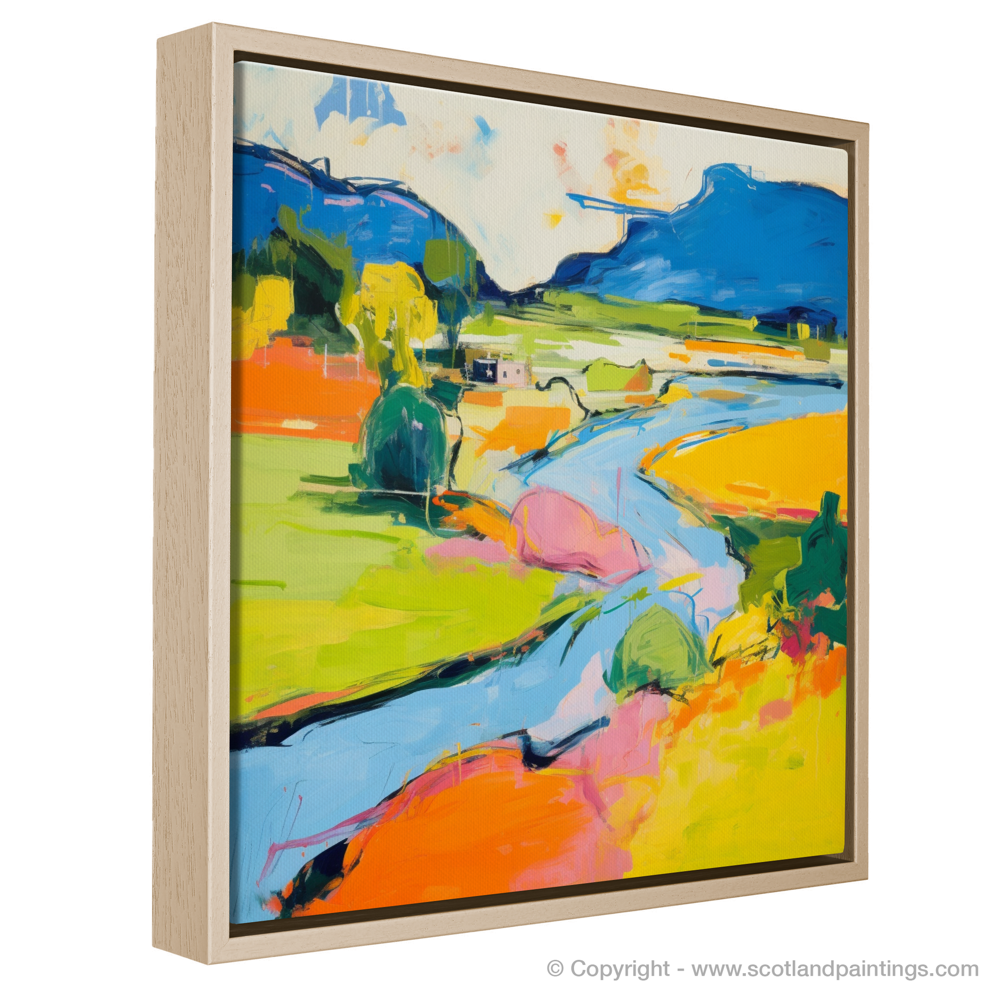 Immerse yourself in the vibrant essence of summer encapsulated within this abstract homage to the serene beauty of River Lyon, Perthshire. Bold and invigorating brushstrokes dance across the canvas, depicting an interpretative landscape alive with exuberant colour. This spirited piece plays host to a riveting palette of azure blues, lush greens, and sun-kissed yellows, masterfully intertwined with splotches of warm oranges and pinks reminiscent of a summer sunset.