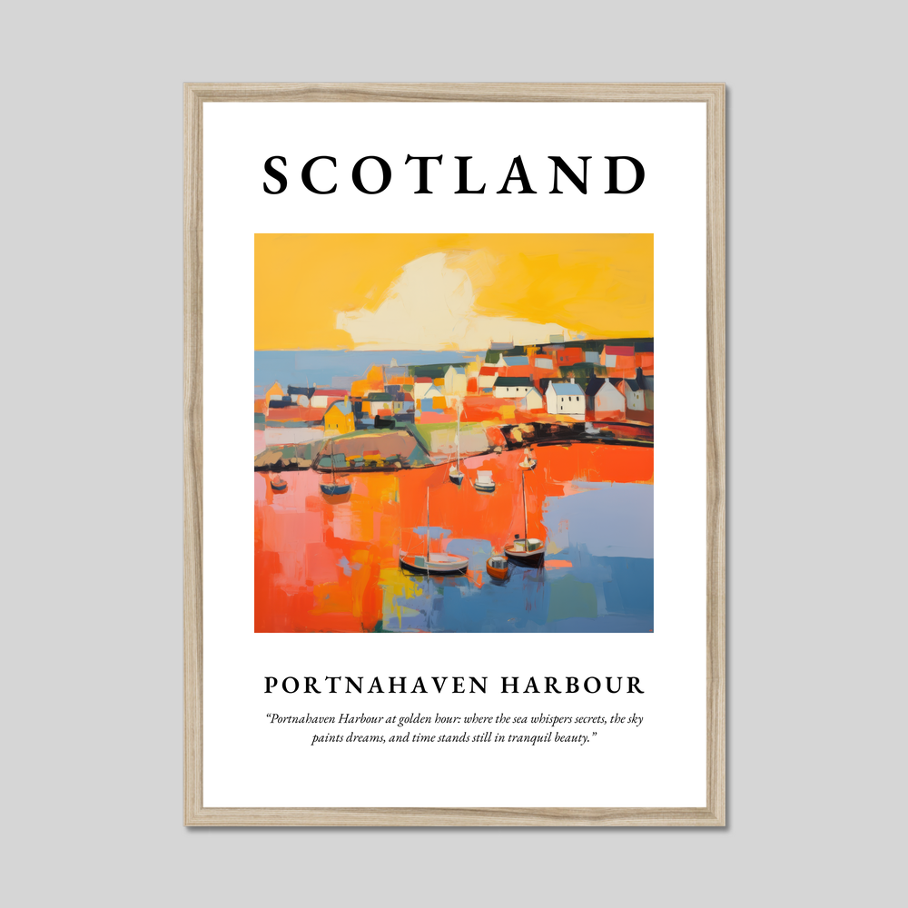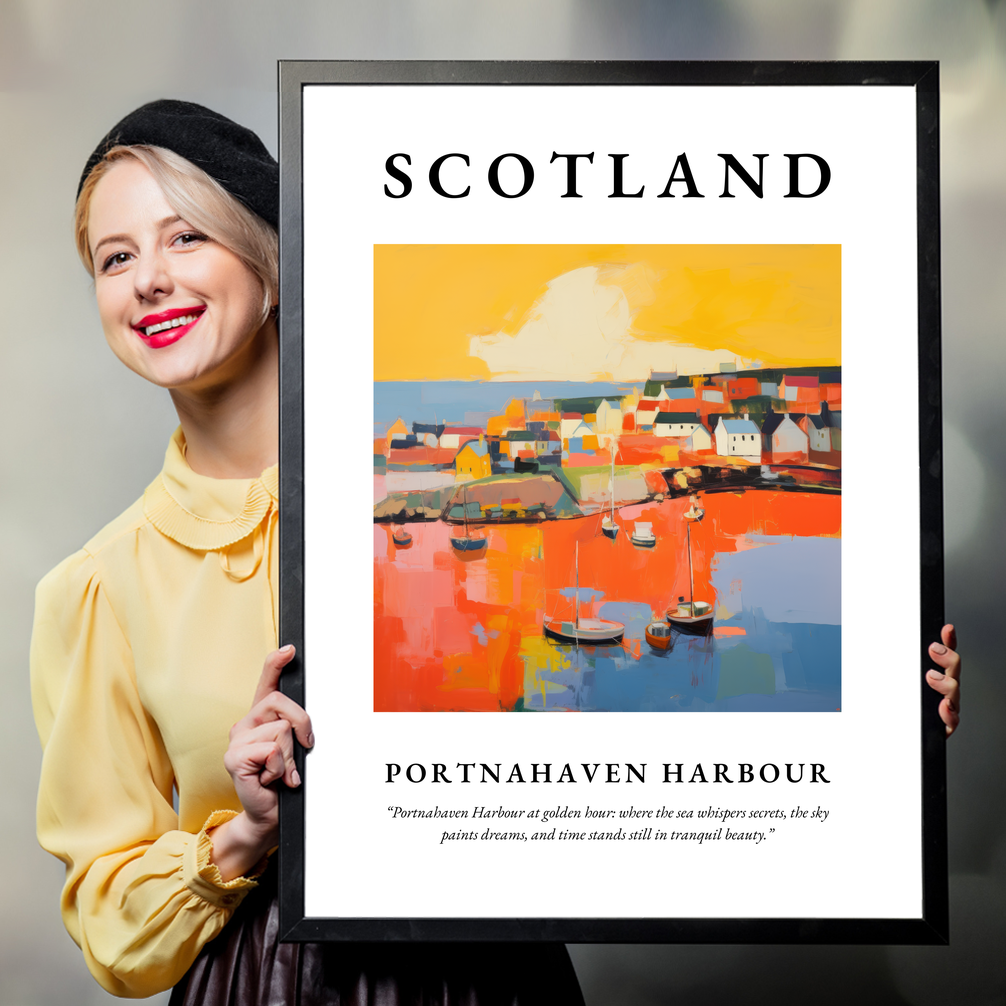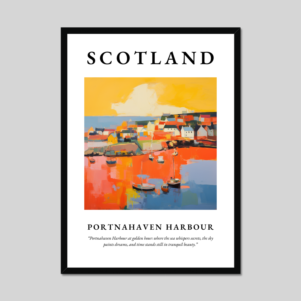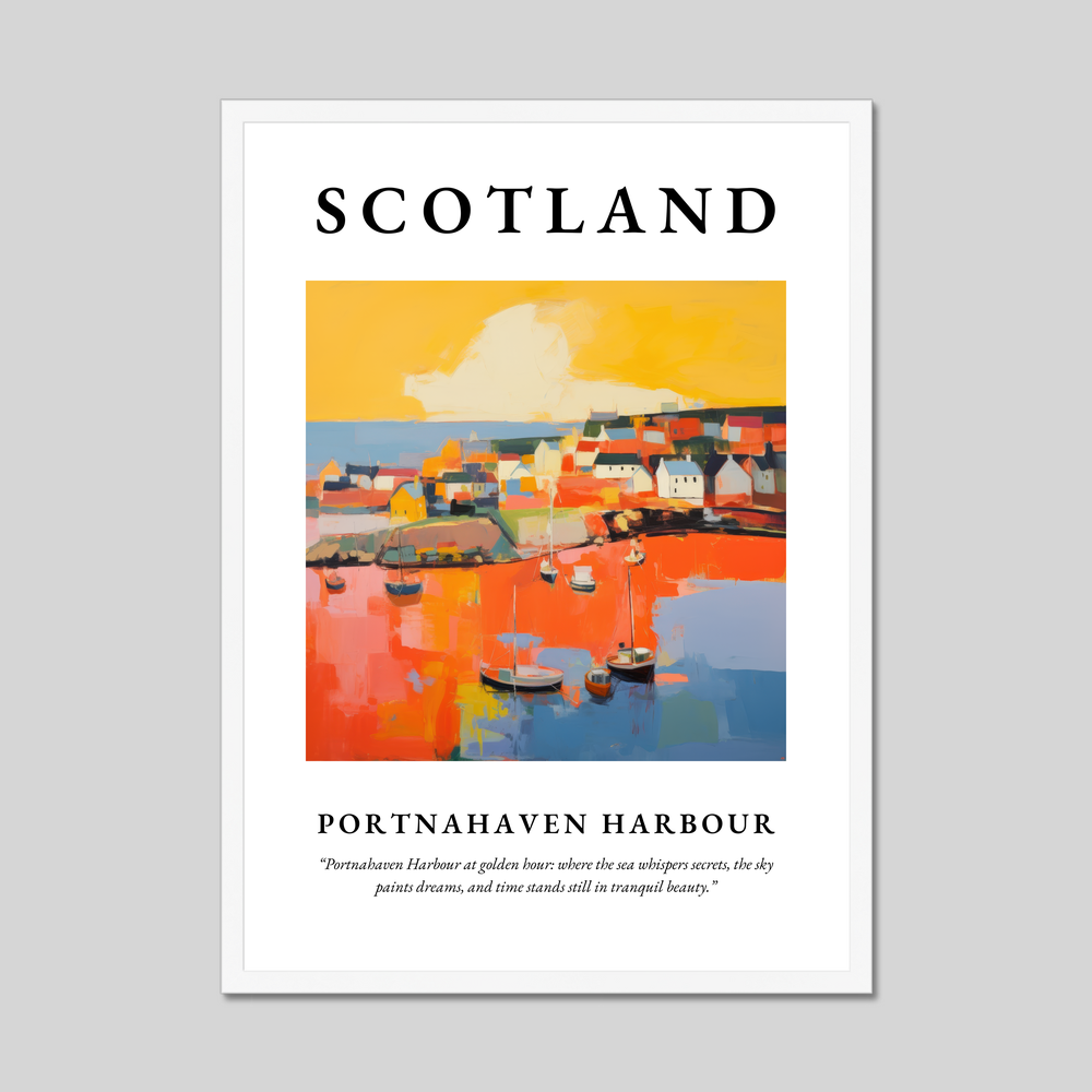The poster proudly features the word “SCOTLAND” in bold lettering, capturing the essence of this captivating nation. Below, the abstract painting of Portnahaven Harbour bursts forth with dynamic colour blocks and fluid shapes, evoking the ethereal beauty of the golden hour. This piece is a haven for art lovers, abstract enthusiasts, or anyone with a fond connection to the enchanting Portnahaven.