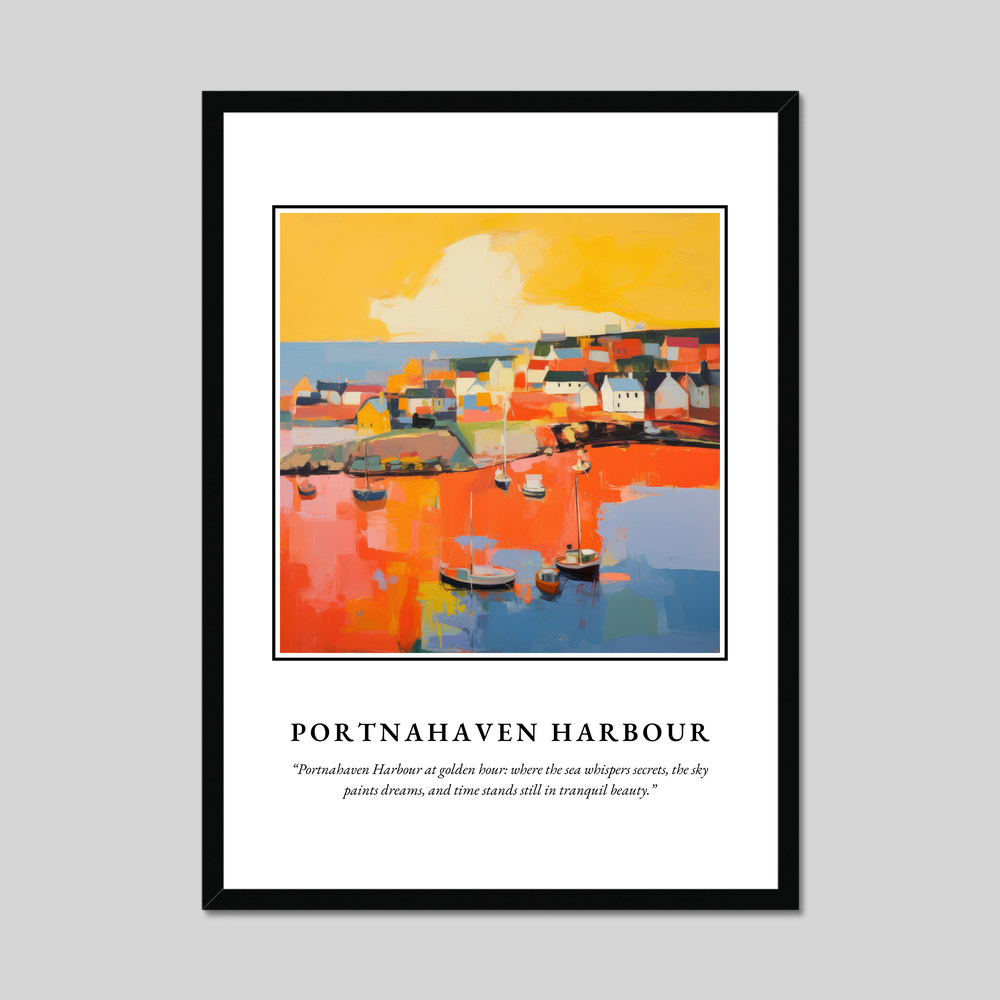 The art effortlessly merges hues of orange, yellow, blue, and red, conjuring the play of light reflecting on the tranquil waters and rustic harbour. The quote beneath, “Portnahaven Harbour at golden hour: where the sea whispers secrets, the sky paints dreams, and time stands still in tranquil beauty,” encapsulates the serene magic of the scene.