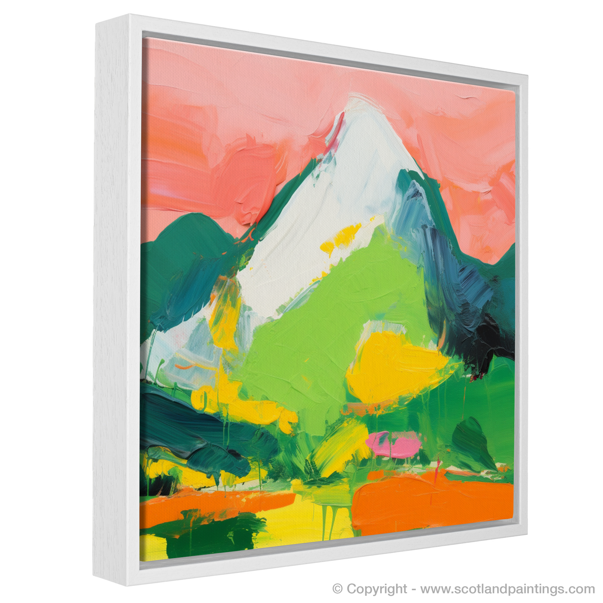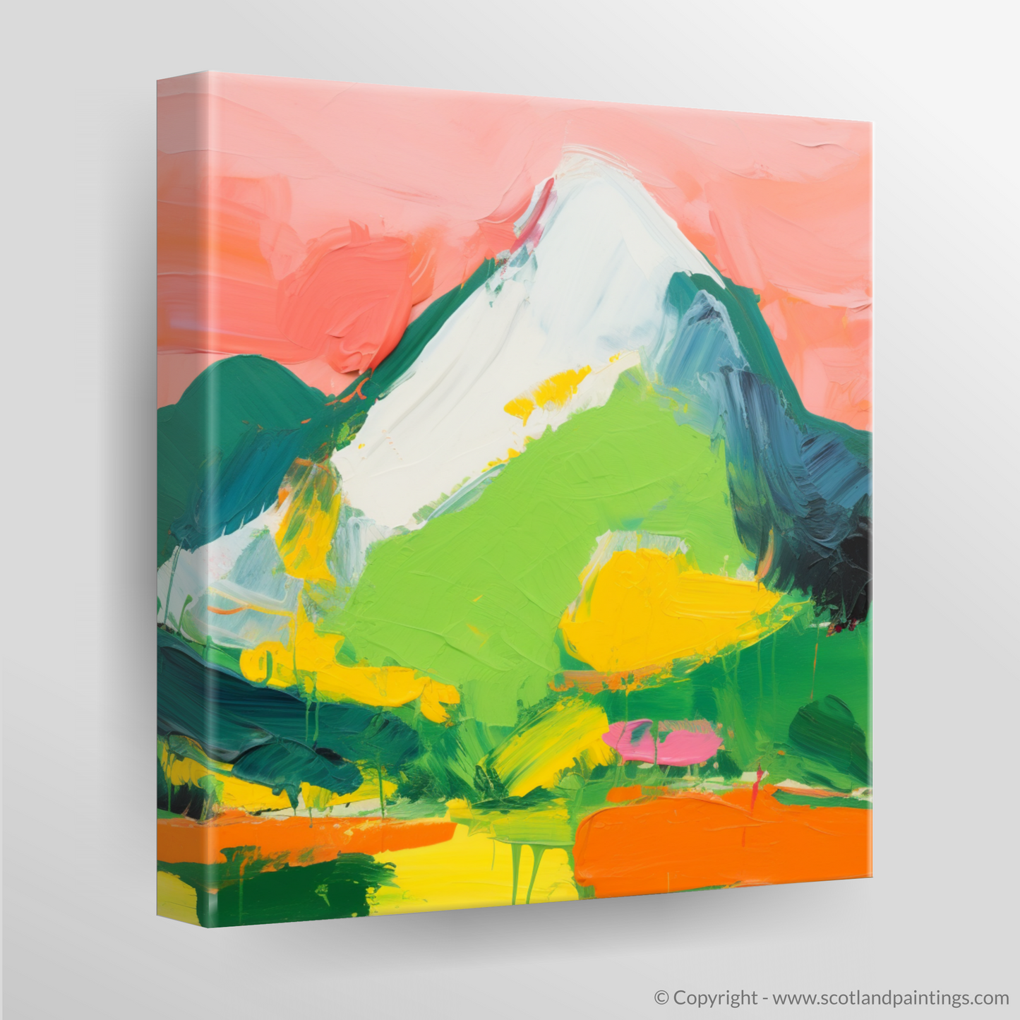 An interplay of verdant greens, bold yellows, and deep blues form the base of the composition, creating an impression of undulating hills and valleys that suggest the Highland's rugged terrain. Meanwhile, ethereal whites and soft pink hues hint at the fleeting Scottish mists and the delicate alpenglow that caresses the peak at dawn and dusk.