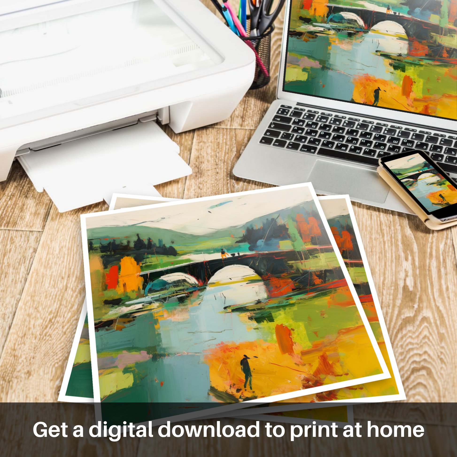 The historic bridge arches graciously across the painting, its reflection rippling in the loch's surface. It serves as a striking architectural counterpoint to the organic contours of the surrounding hills, emphasising the harmonious blurring of man-made and natural beauty. Verdant greens, autumnal oranges, and touches of crimson dance across the image, evoking the rich tapestry of the landscape's foliage.