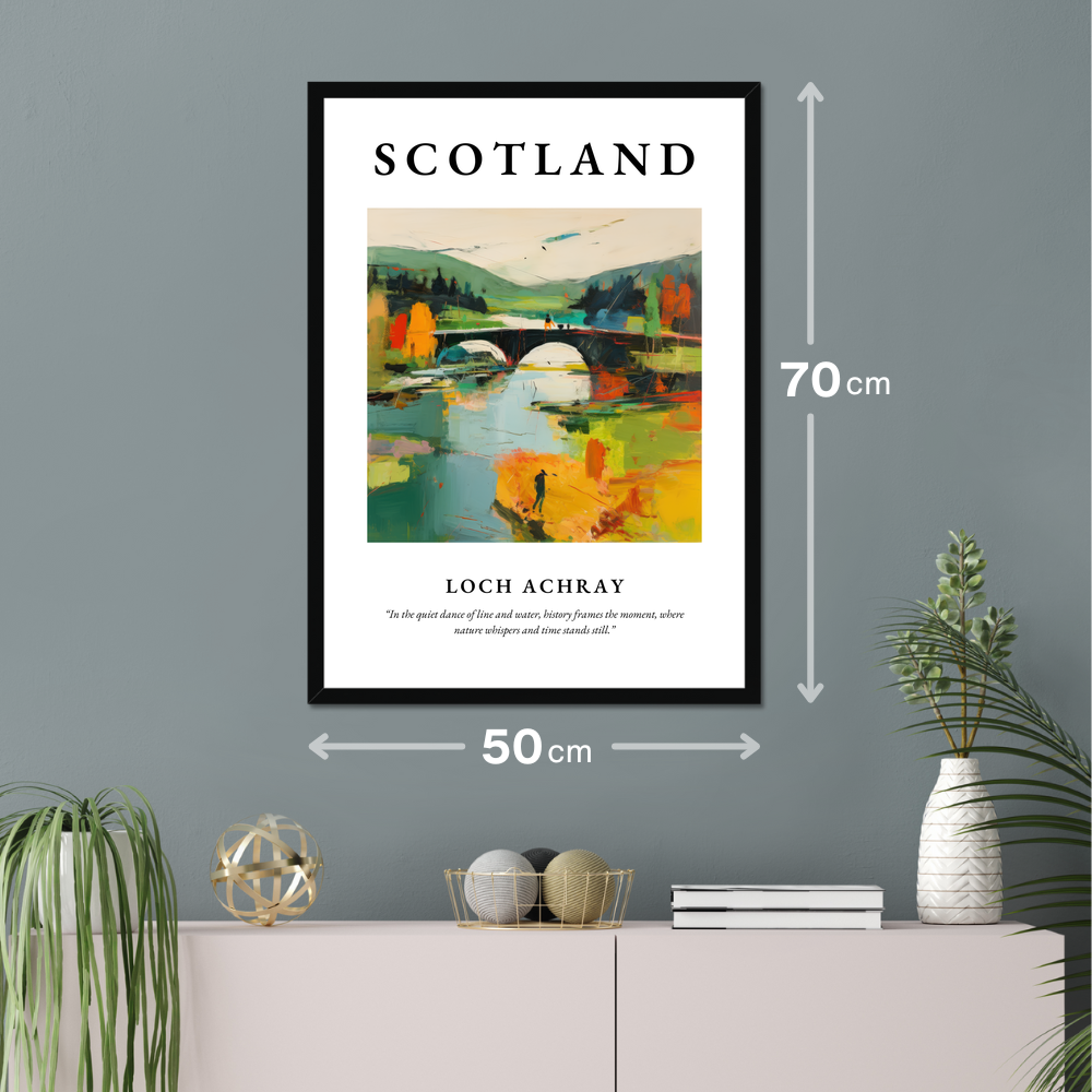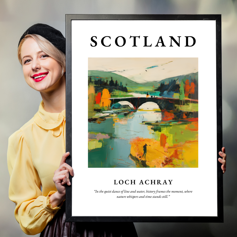 Available in a choice of elegant black, classic white, or natural wood-effect frames, this poster not only enriches your space but also complements any decor theme effortlessly. Below the bold "SCOTLAND" lettering, the painting captures Loch Achray in a dance of colours and lines, balancing between vibrant energy and tranquil reflection. The abstract strokes bring to life the essence of Scotland's landscapes, making it a perfect piece for art lovers or anyone with fond memories of the area.