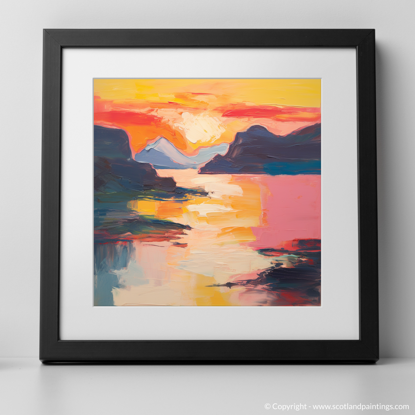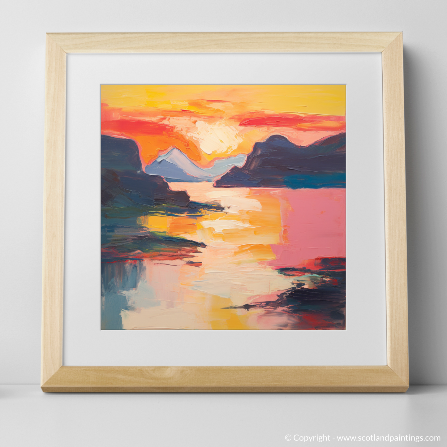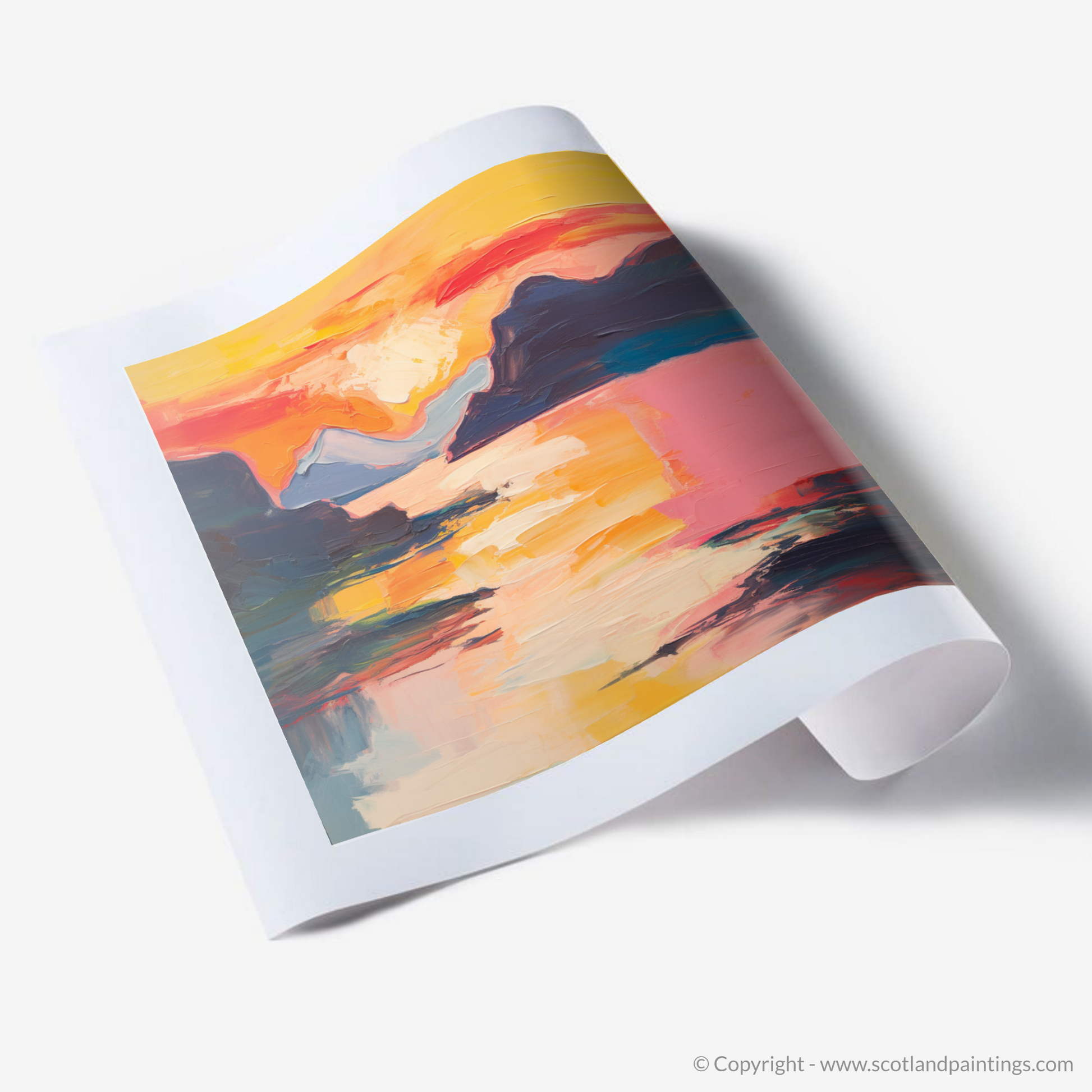 Bathed in the warm glow of a setting sun, this evocative abstract print captures the untamed beauty of Shieldaig Bay, rendering its serene landscape in vibrant strokes of color and form. As the sun dips below the horizon, a symphony of fiery oranges, deep reds, and gentle pinks stretches across the canvas, reflecting off the water to create a mirror-like illusion that's both mesmerizing and surreal.