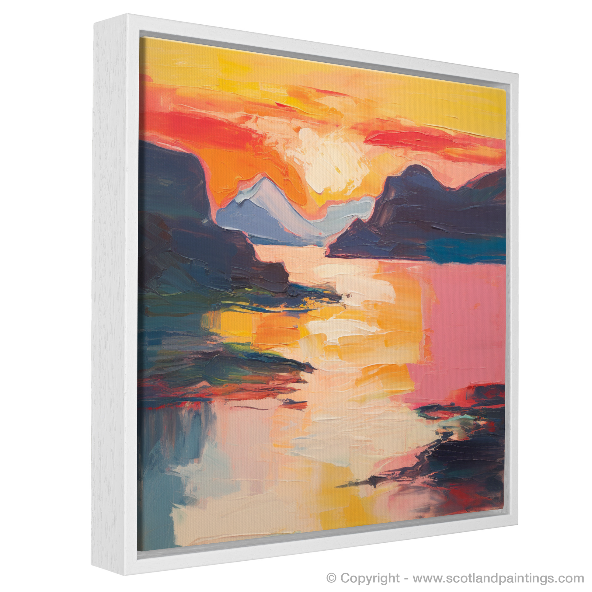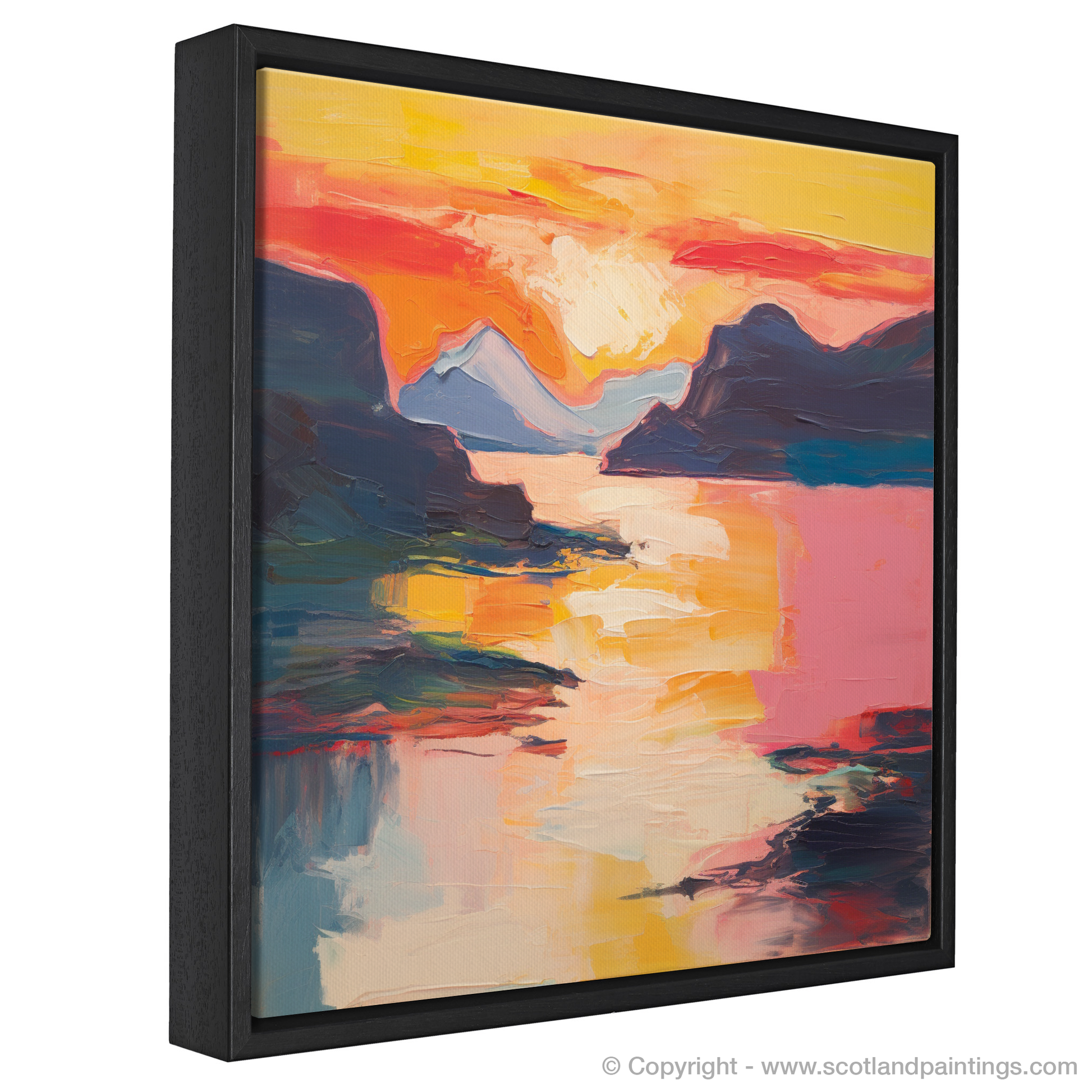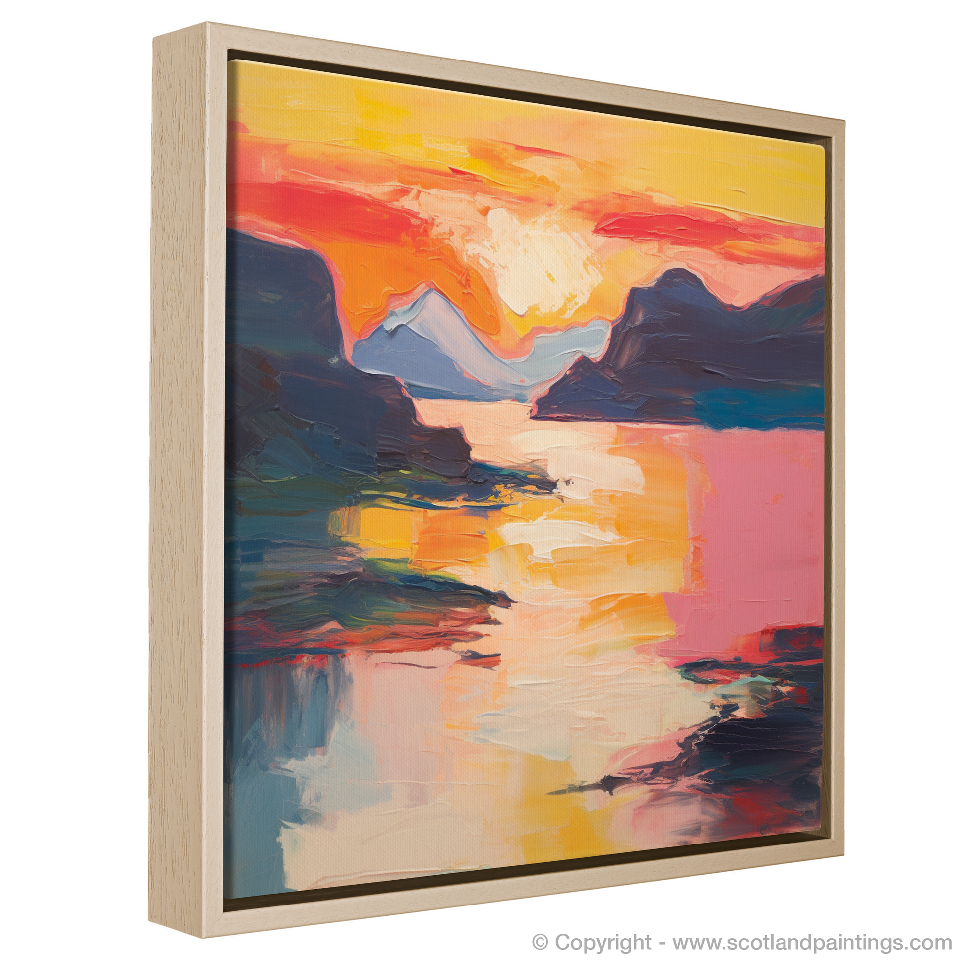 Bathed in the warm glow of a setting sun, this evocative abstract print captures the untamed beauty of Shieldaig Bay, rendering its serene landscape in vibrant strokes of color and form. As the sun dips below the horizon, a symphony of fiery oranges, deep reds, and gentle pinks stretches across the canvas, reflecting off the water to create a mirror-like illusion that's both mesmerizing and surreal.