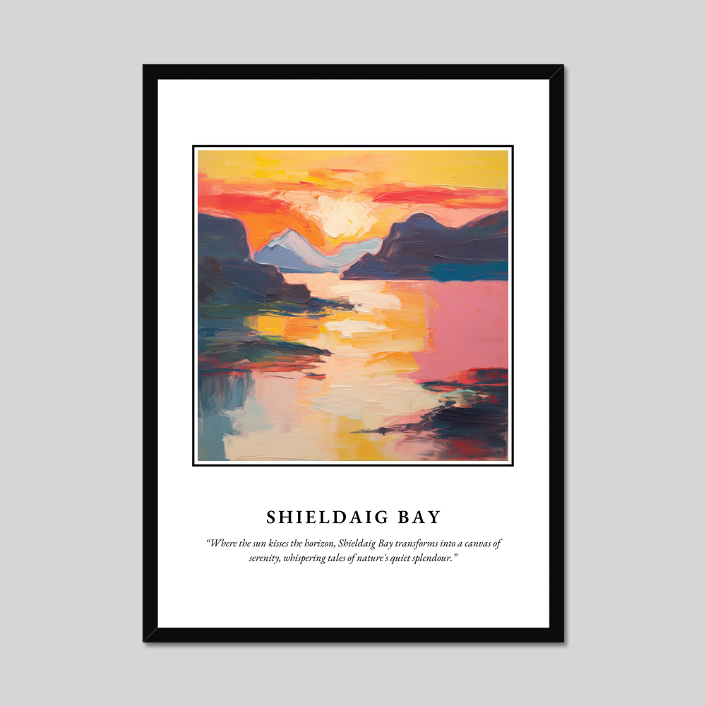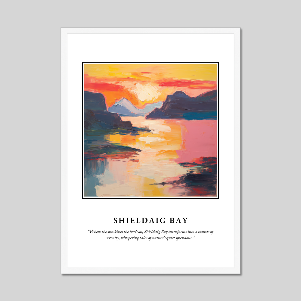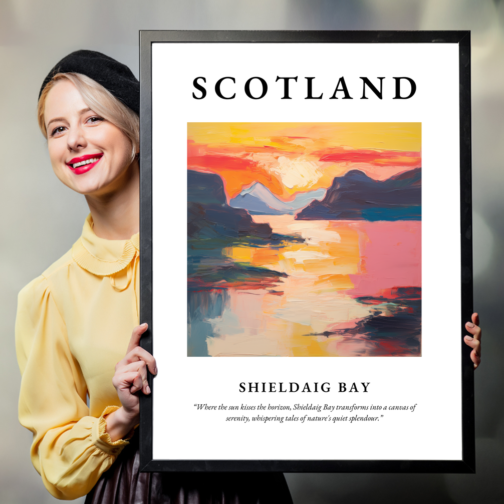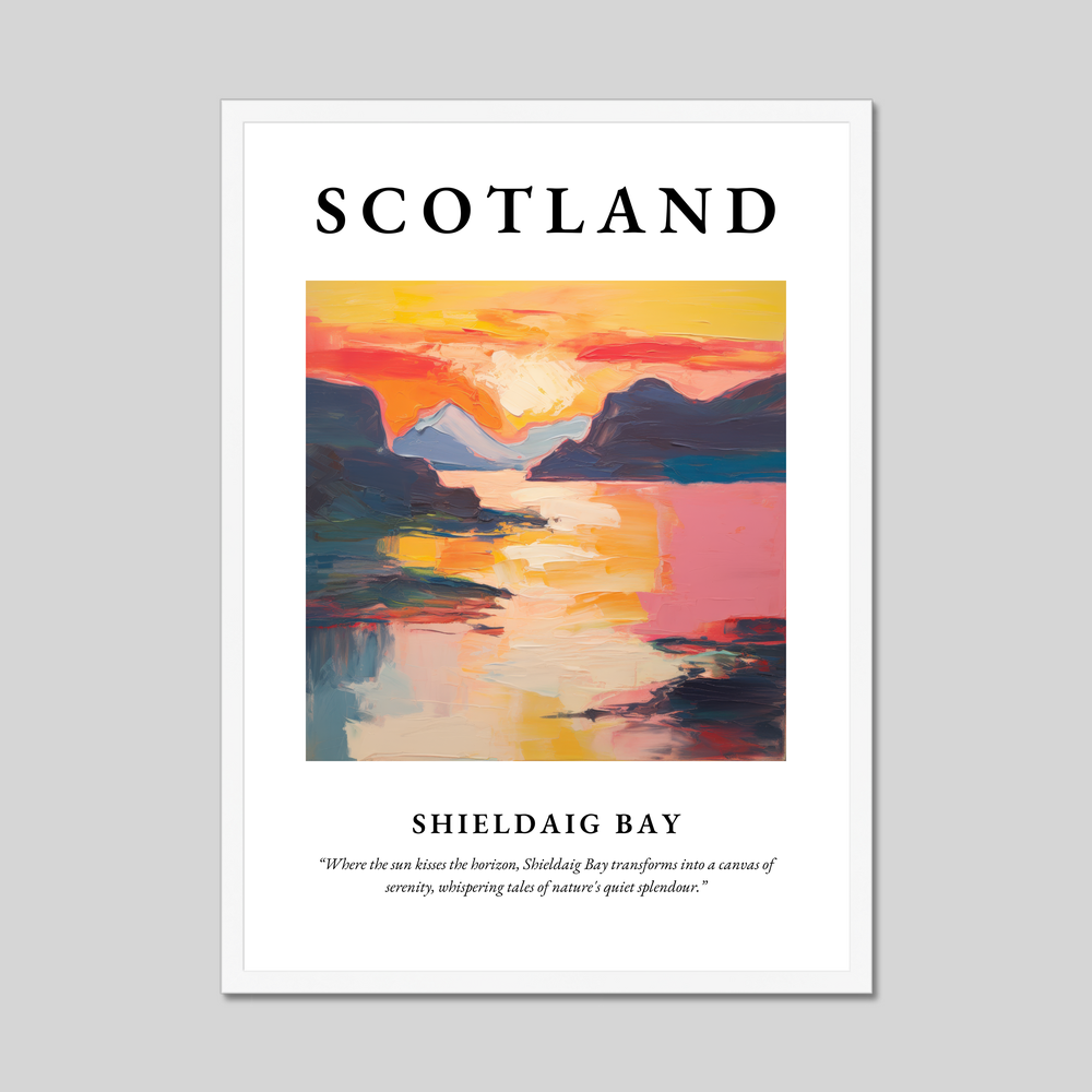 At the heart of the composition, the painting of Shieldaig Bay mesmerises with abstract brushstrokes, blending warm hues of orange and pink with cool shades of blue and green. It’s a captivating interpretation of the bay, where the sun dips below the horizon, creating a tapestry of tranquil colours and textures. The prominent word “SCOTLAND” emblazoned above the painting embodies national pride, while the evocative quote below invites reflection: “Where the sun kisses the horizon, Shieldaig Bay transforms into a canvas of serenity, whispering tales of nature's quiet splendour.”