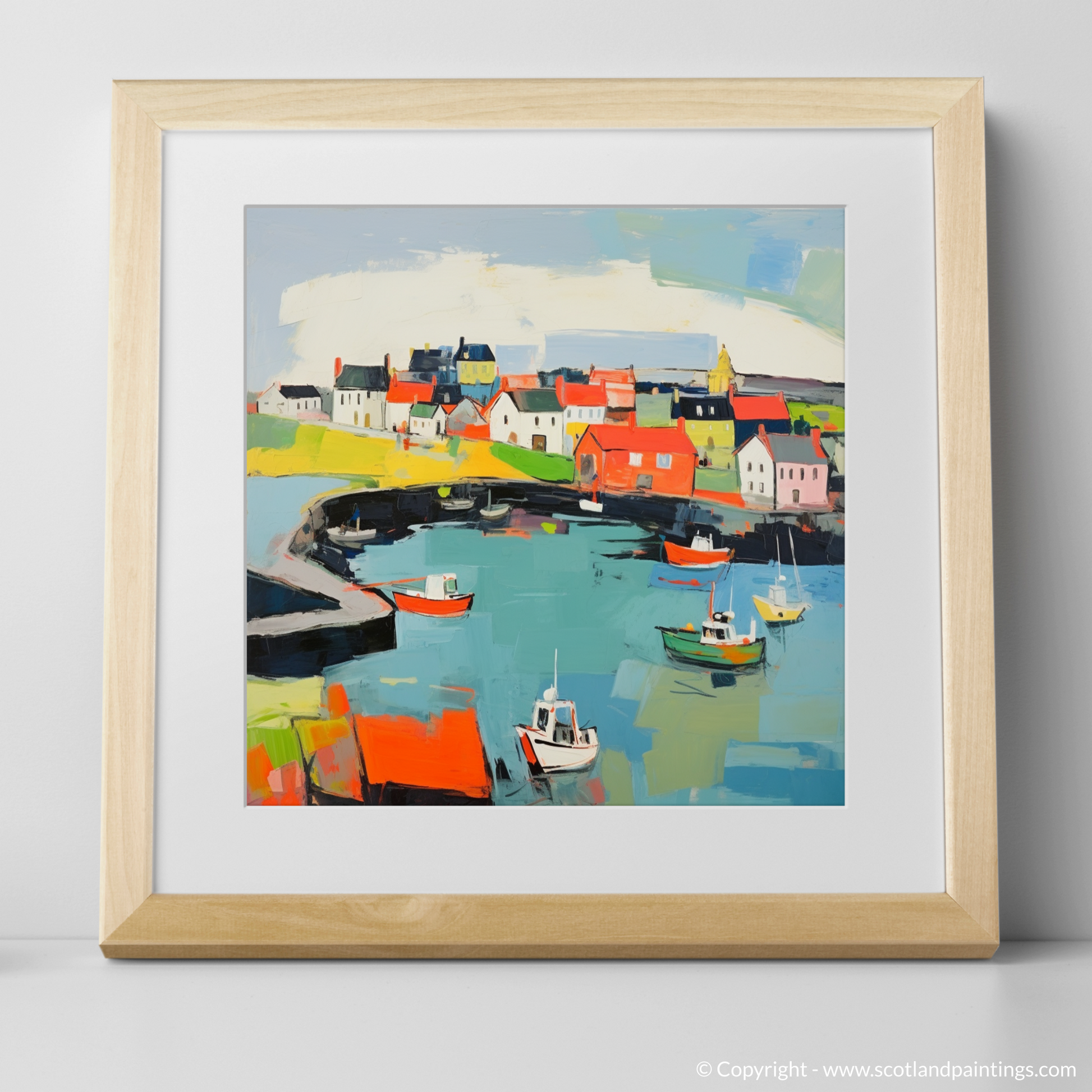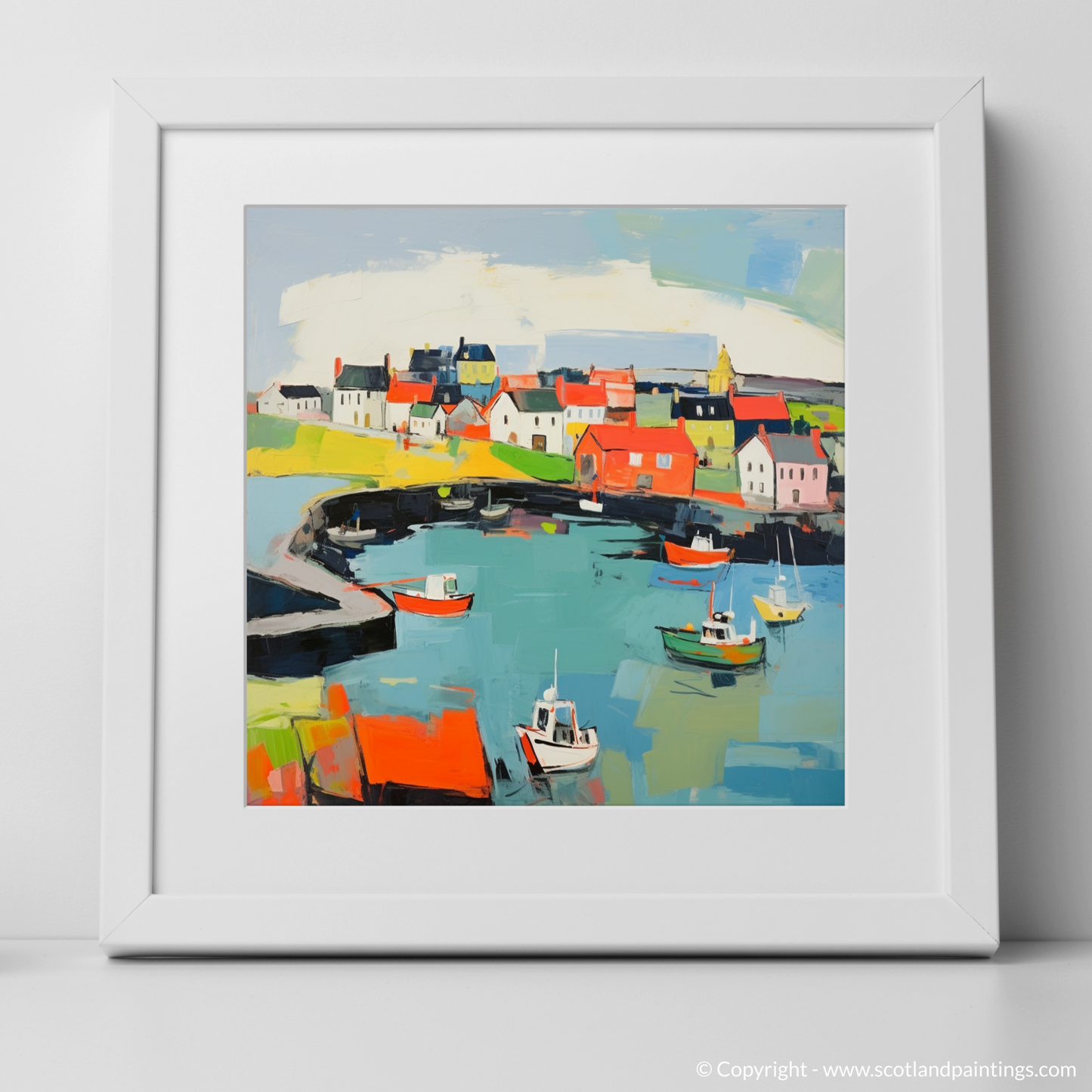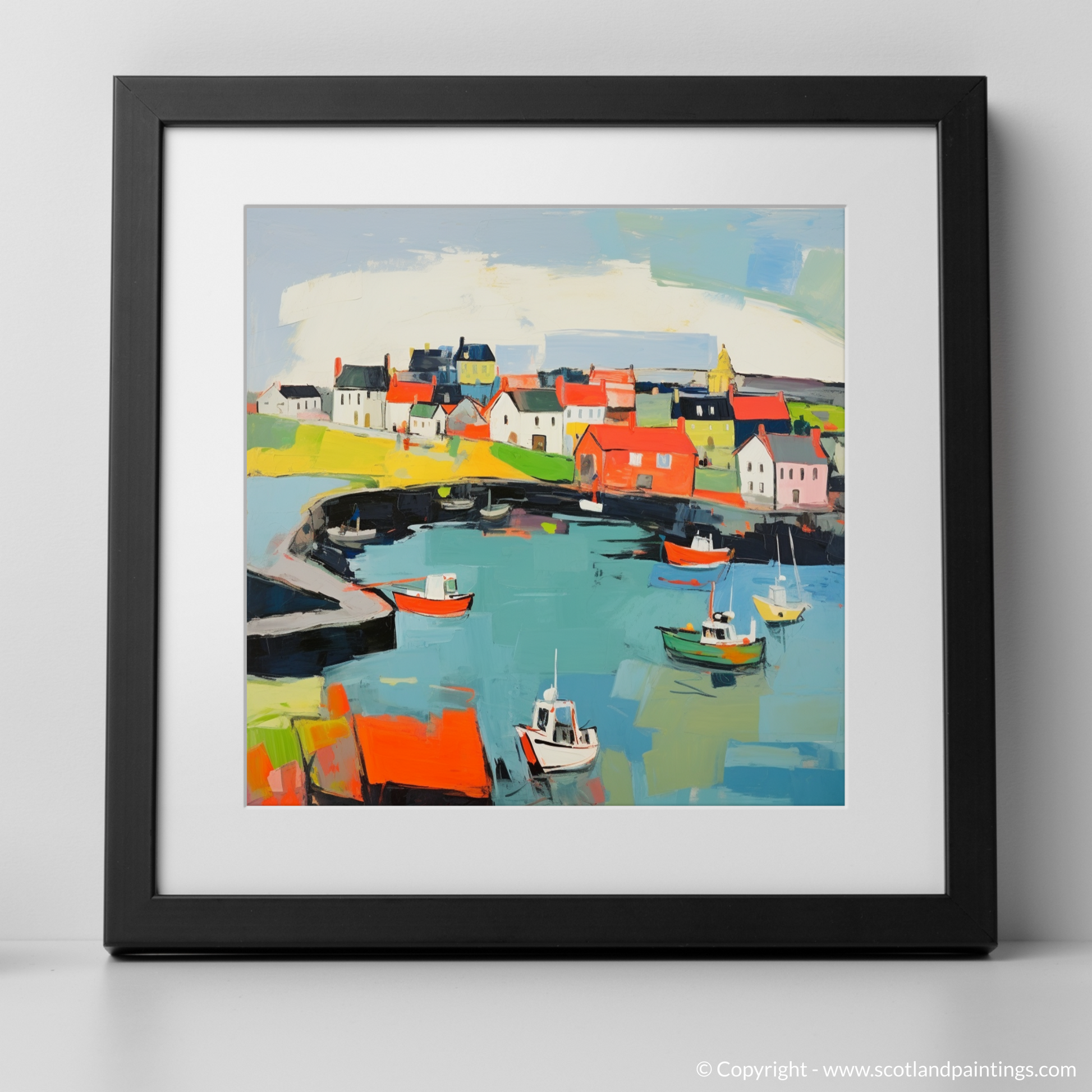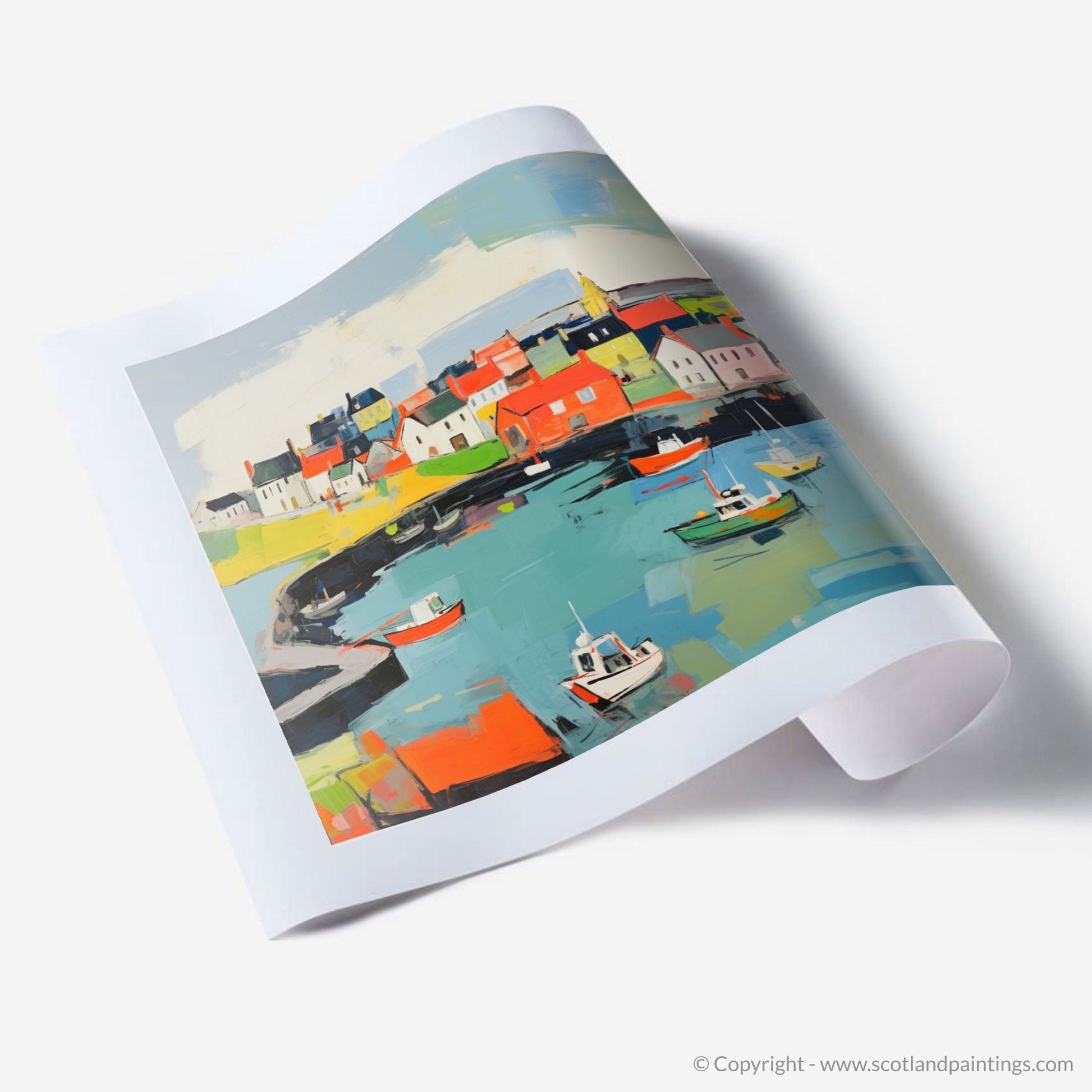 Capturing the tempestuous essence of a maritime scene, this evocative print invites the observer to experience the vibrant energy of Eyemouth Harbour under a stormy sky. The abstract depiction of this coastal locale is a spirited dance of colour and shape, manifesting a seascape pulsing with life and movement despite the brooding firmament above.
