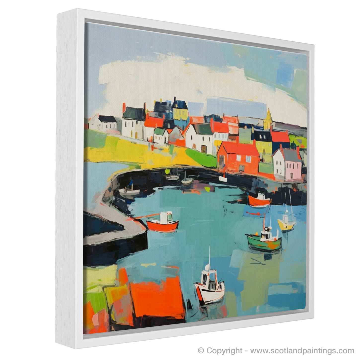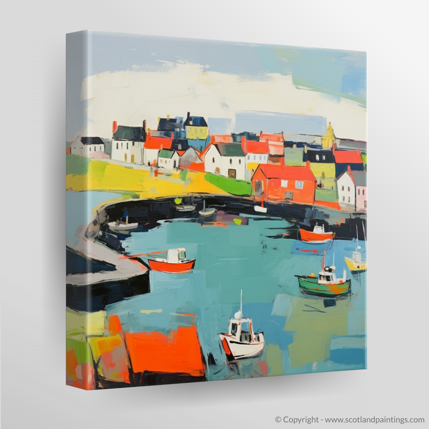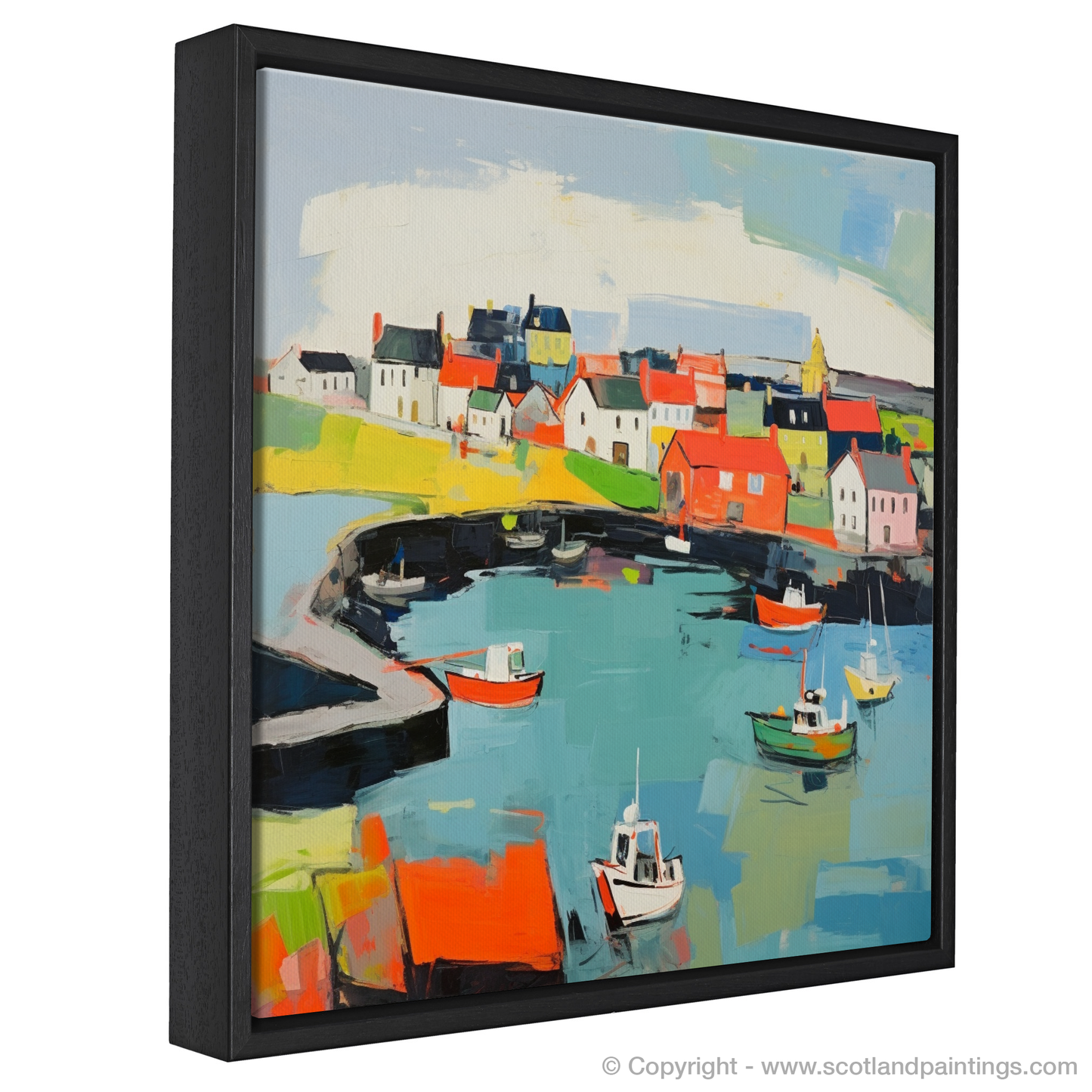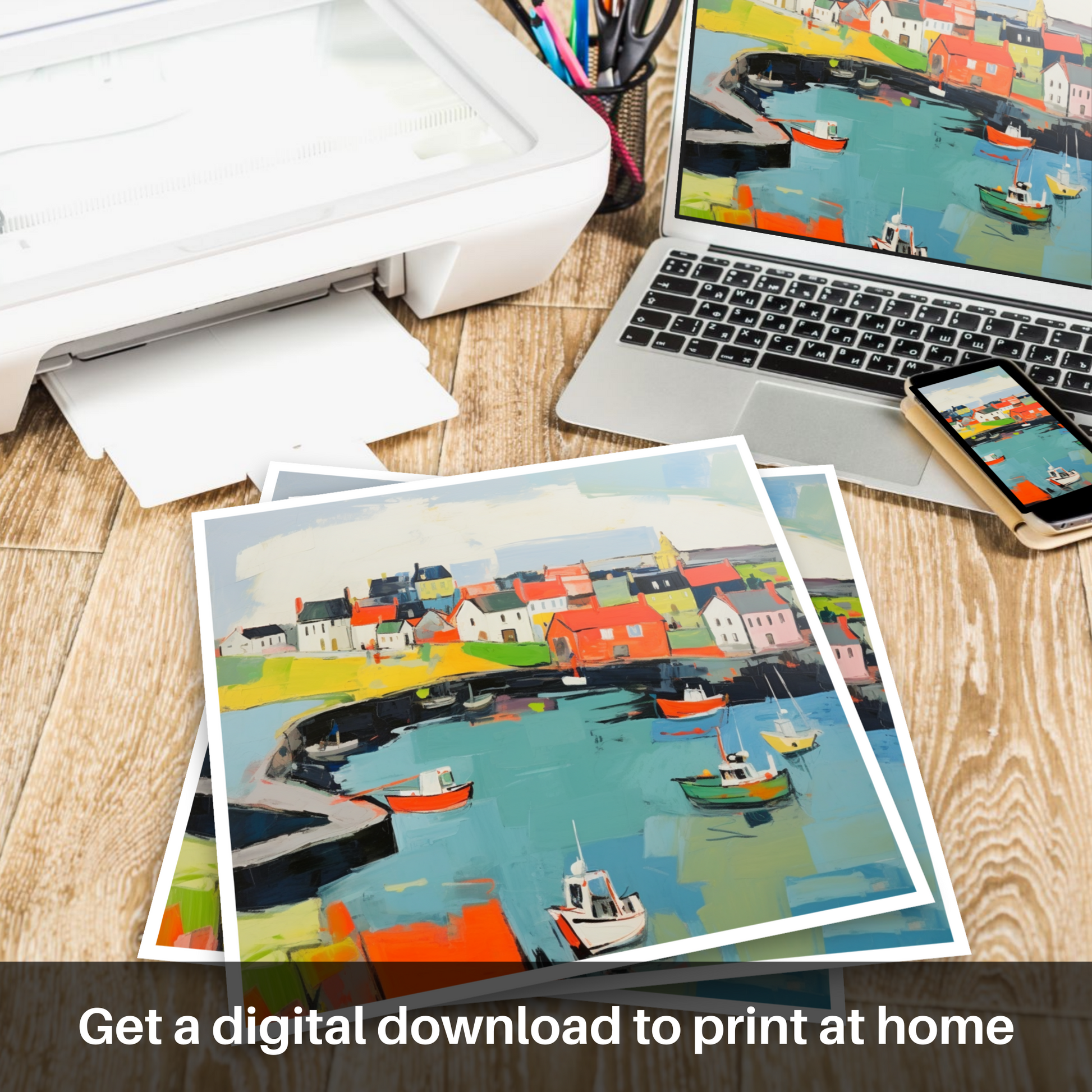 Capturing the tempestuous essence of a maritime scene, this evocative print invites the observer to experience the vibrant energy of Eyemouth Harbour under a stormy sky. The abstract depiction of this coastal locale is a spirited dance of colour and shape, manifesting a seascape pulsing with life and movement despite the brooding firmament above.