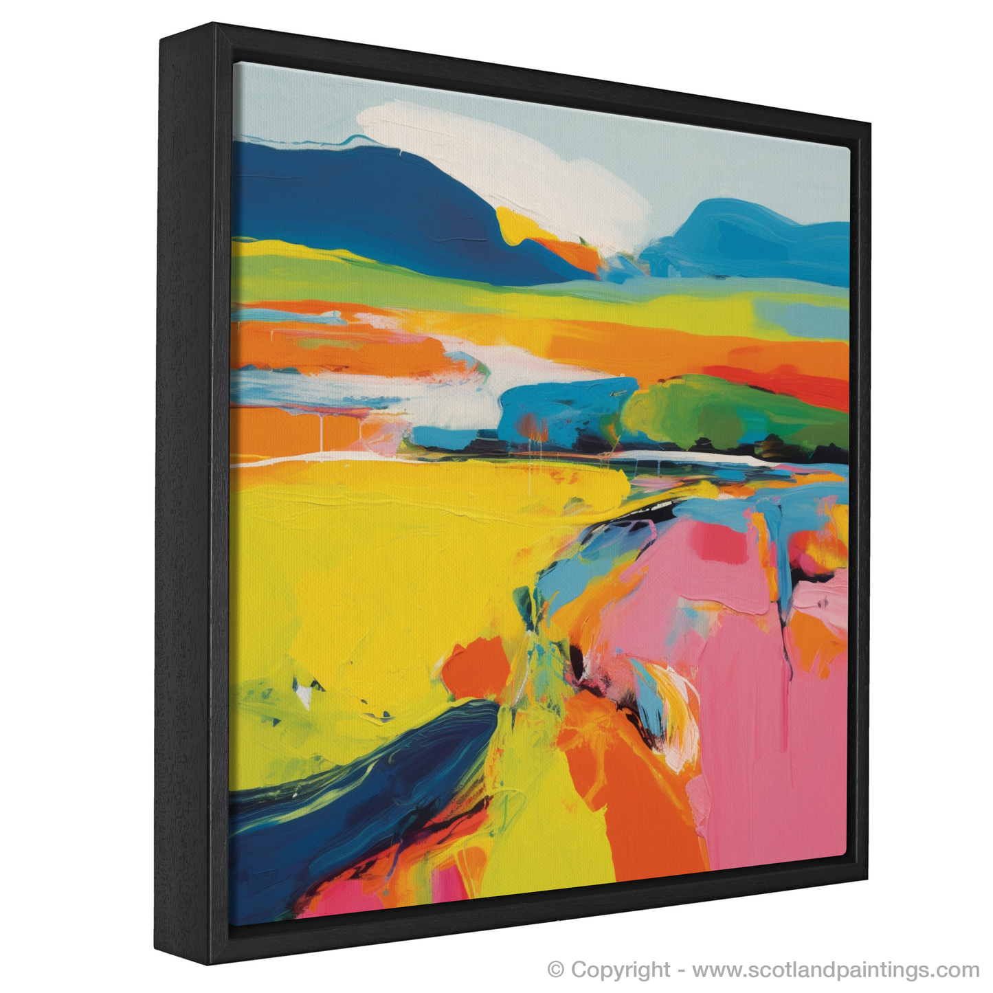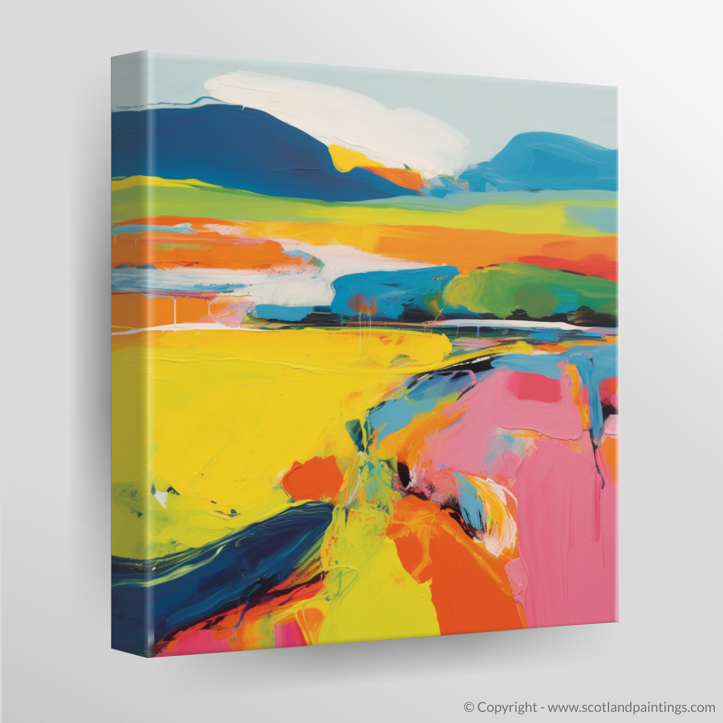 Embark on a visual journey along the River Clyde, rendered through the vivacious application of abstract artistry. This captivating piece is a symphony of colour, reflecting a contemporary twist on the serene Scottish landscape. Bold strokes of canary yellow juxtapose against the warmth of vermilion and the cool depth of cerulean, creating a dynamic tapestry that evokes the river's perpetual movement. Touches of ivory and hints of forest green meander across the canvas, reminiscent of scattered clouds casting fleeting shadows upon the rolling hills of the Clyde Valley.