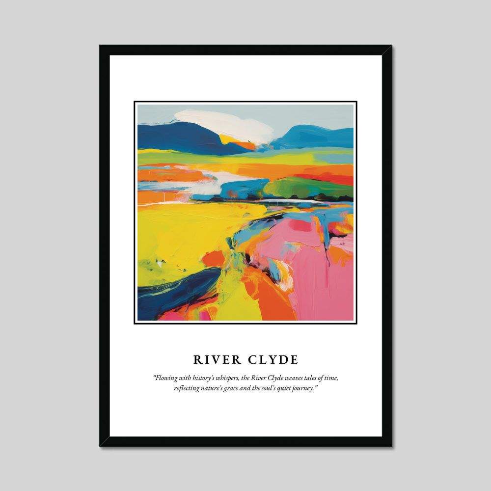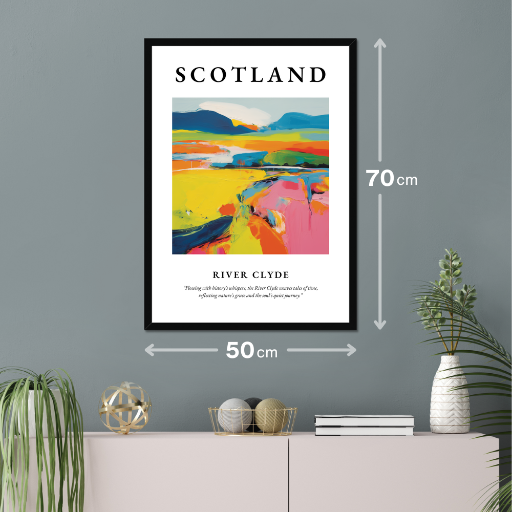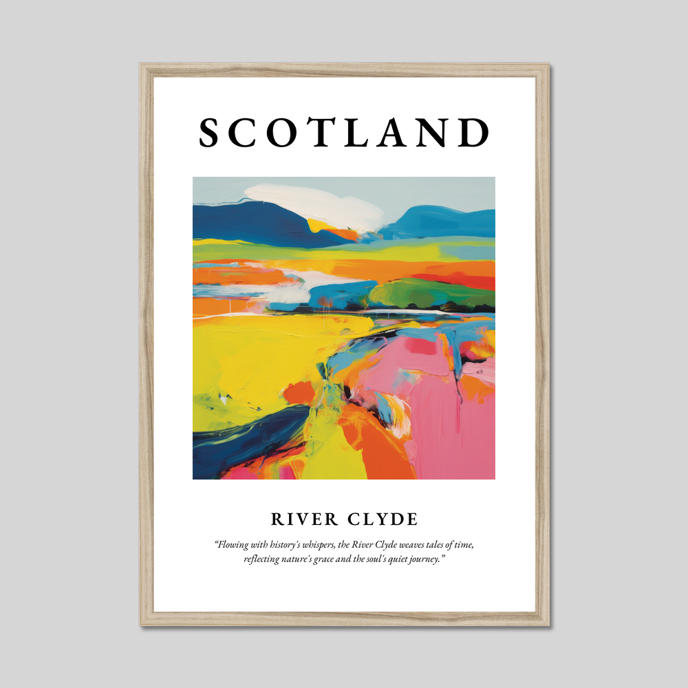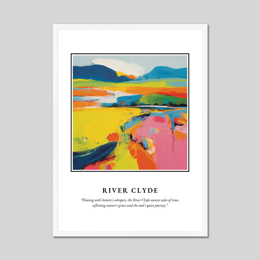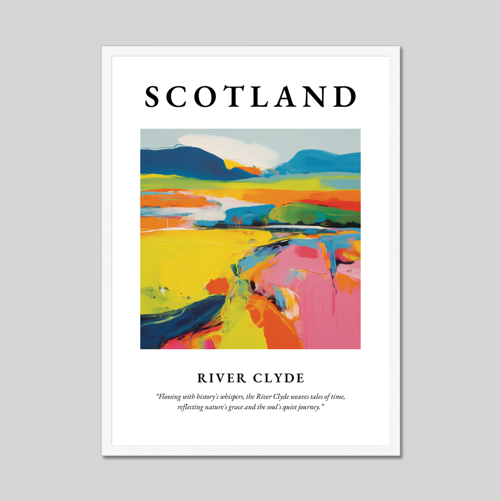 Featuring the word “SCOTLAND” in bold, this print draws your gaze to a vibrant abstract painting of the iconic River Clyde. The fluid strokes and vibrant colours evoke the river’s dynamic presence, inviting art enthusiasts and admirers of the abstract style to lose themselves in its depths. Below the painting, the quote “Flowing with history's whispers, the River Clyde weaves tales of time, reflecting nature's grace and the soul's quiet journey” adds a poetic touch, making this poster a perfect keepsake for those who cherish memories of Scotland, or have a profound connection to its landscapes.