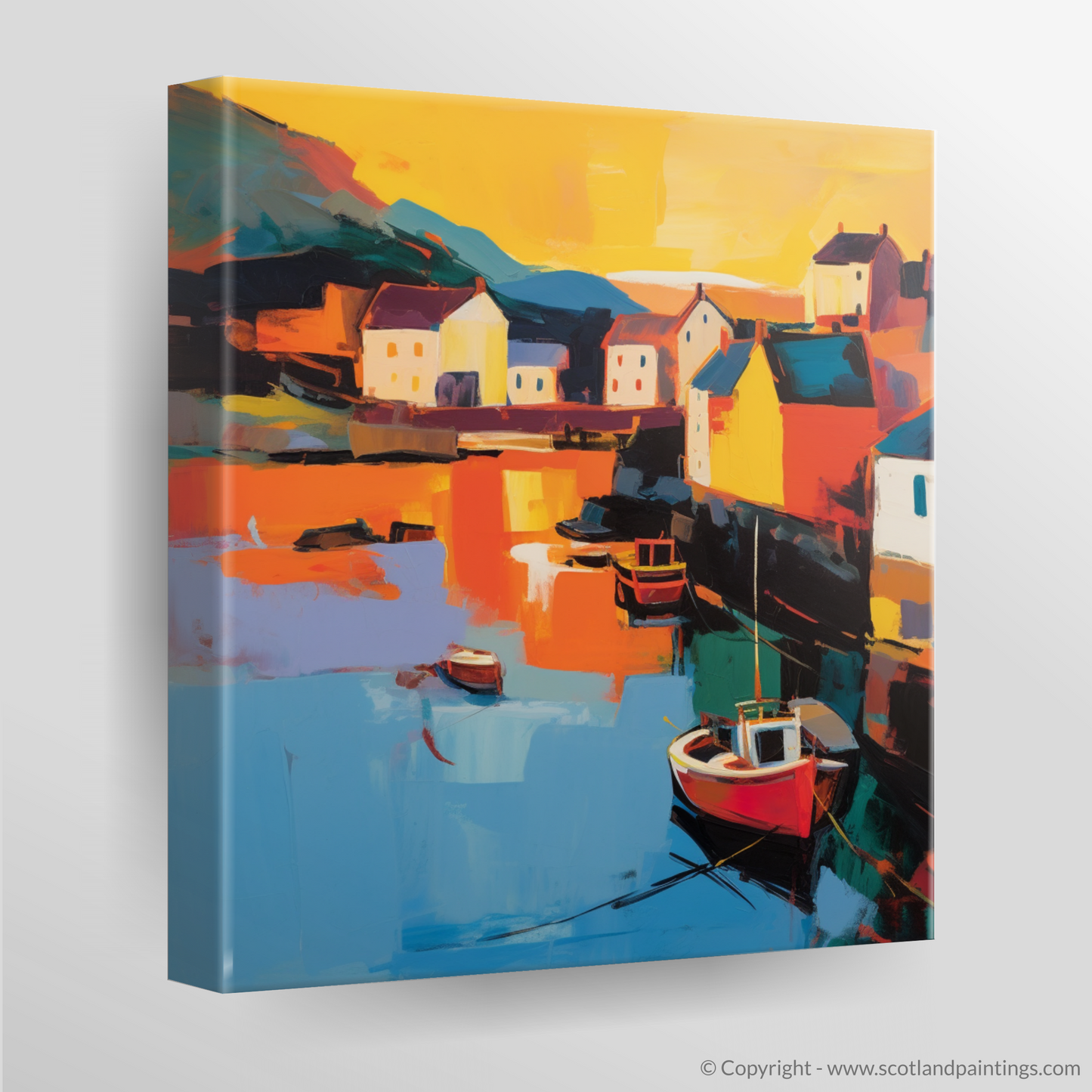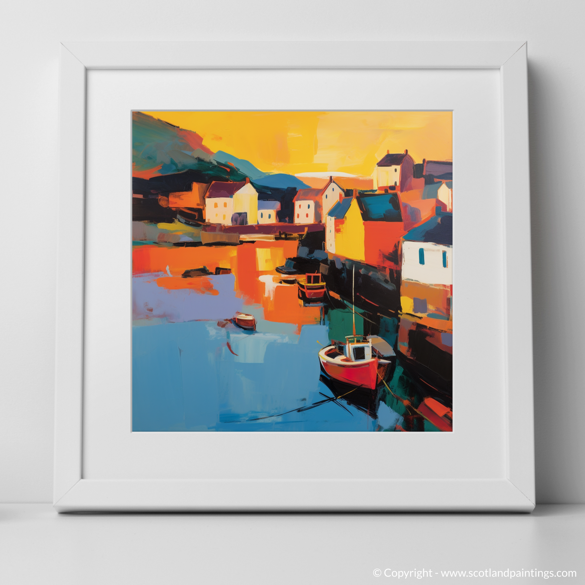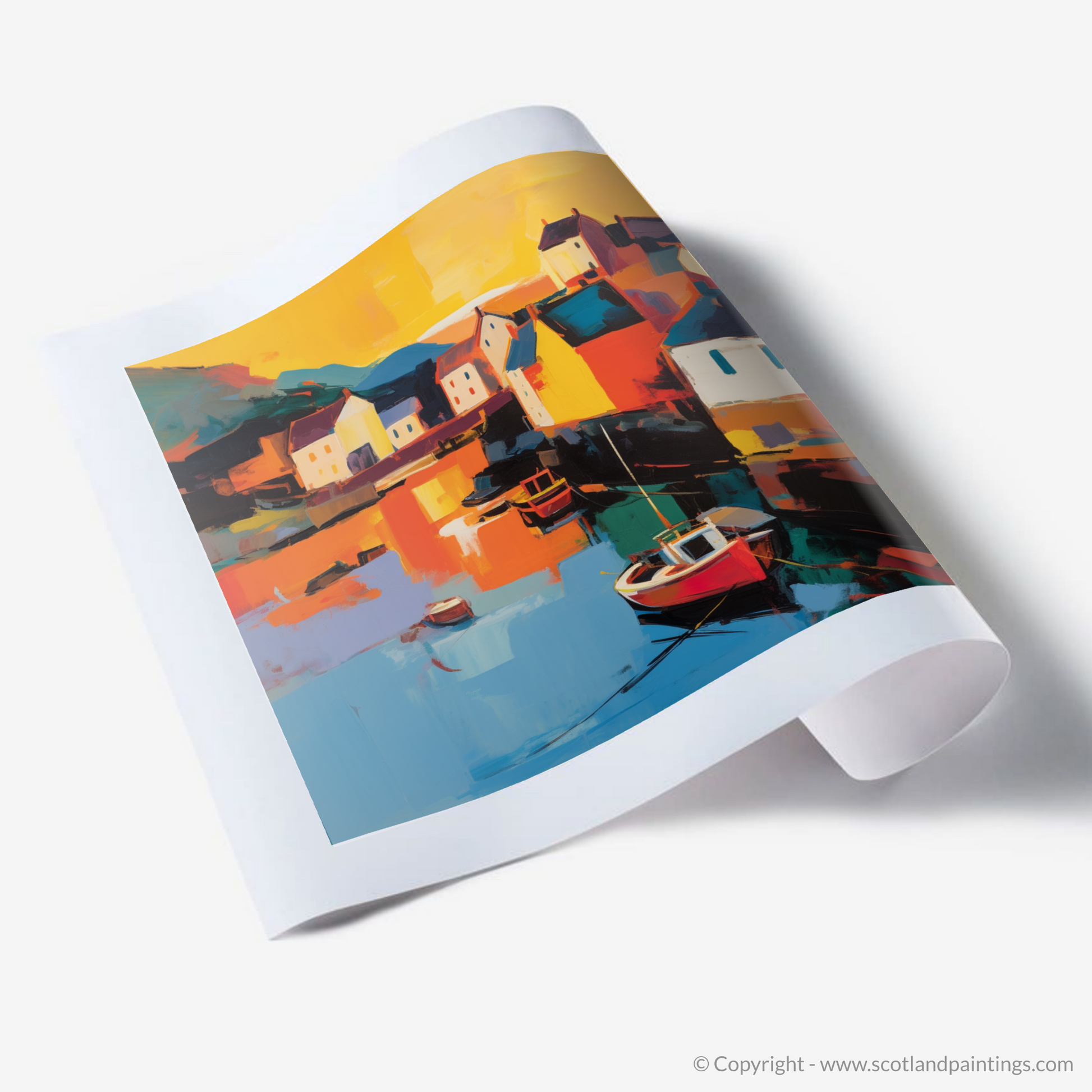 Immerse yourself in the vibrant dance of colours and shapes that capture the essence of Mallaig Harbour at its most magical hour. This captivating print presents an abstract vista of the harbour, where the warm glow of the sun sets the sky ablaze with shades of gold, orange, and crimson. The reflection in the tranquil waters creates a symphony of mirrored tones, enriching the visual feast.