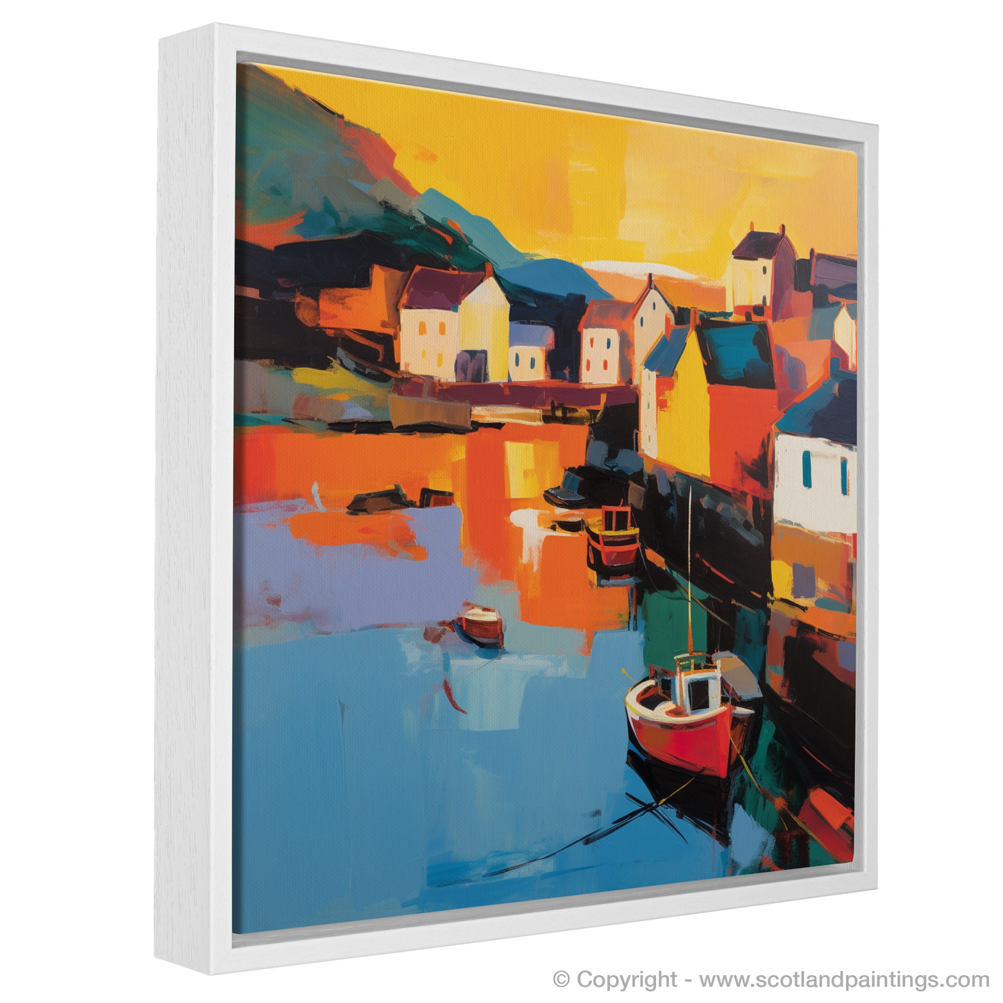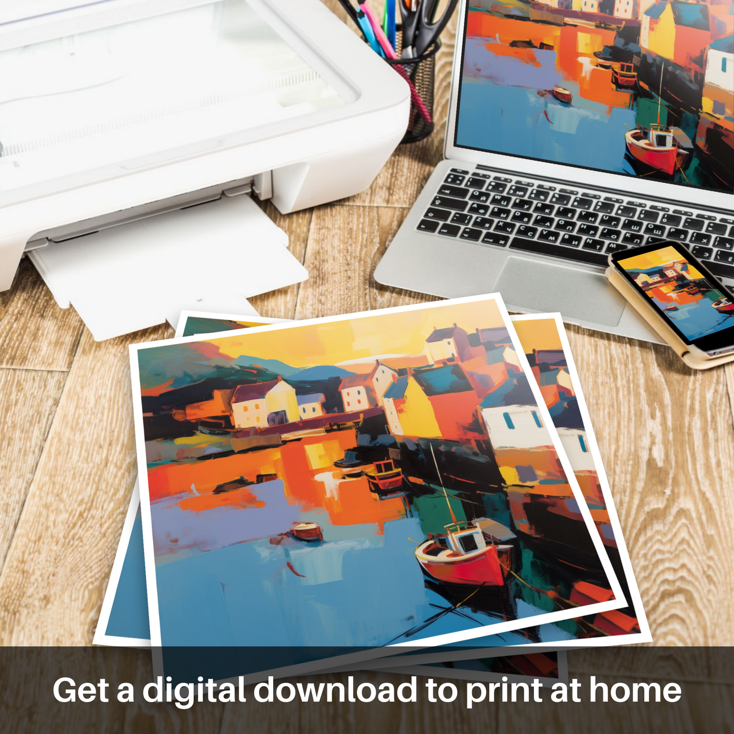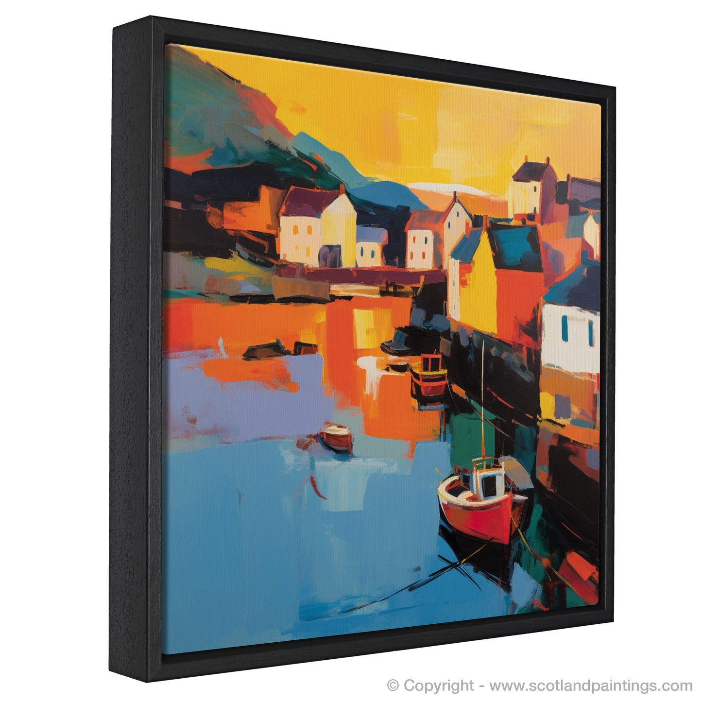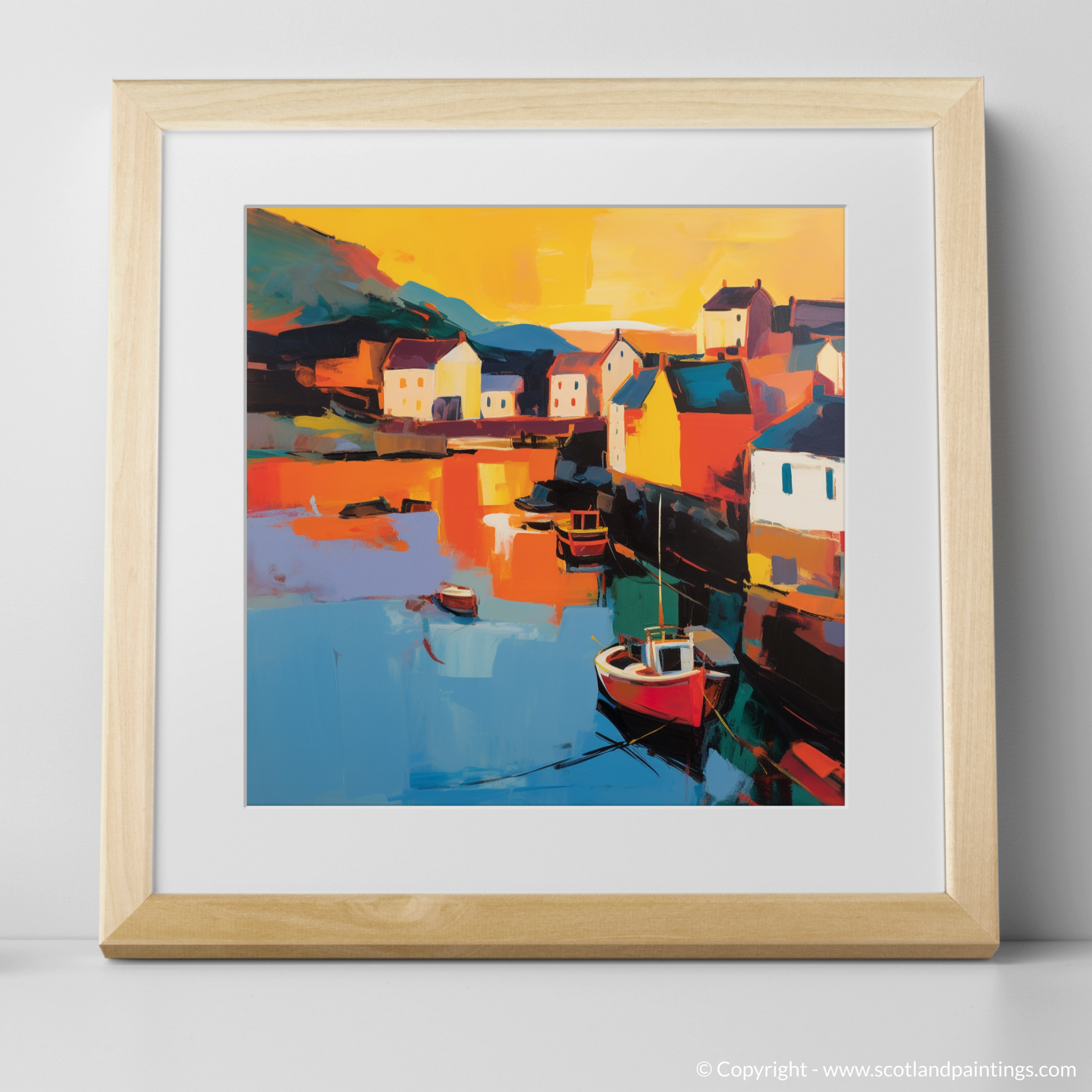 Immerse yourself in the vibrant dance of colours and shapes that capture the essence of Mallaig Harbour at its most magical hour. This captivating print presents an abstract vista of the harbour, where the warm glow of the sun sets the sky ablaze with shades of gold, orange, and crimson. The reflection in the tranquil waters creates a symphony of mirrored tones, enriching the visual feast.