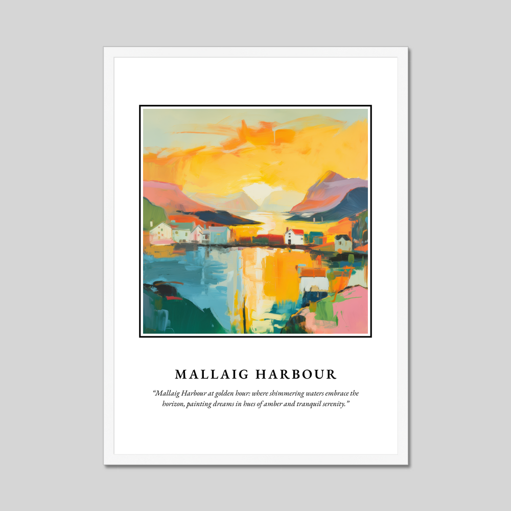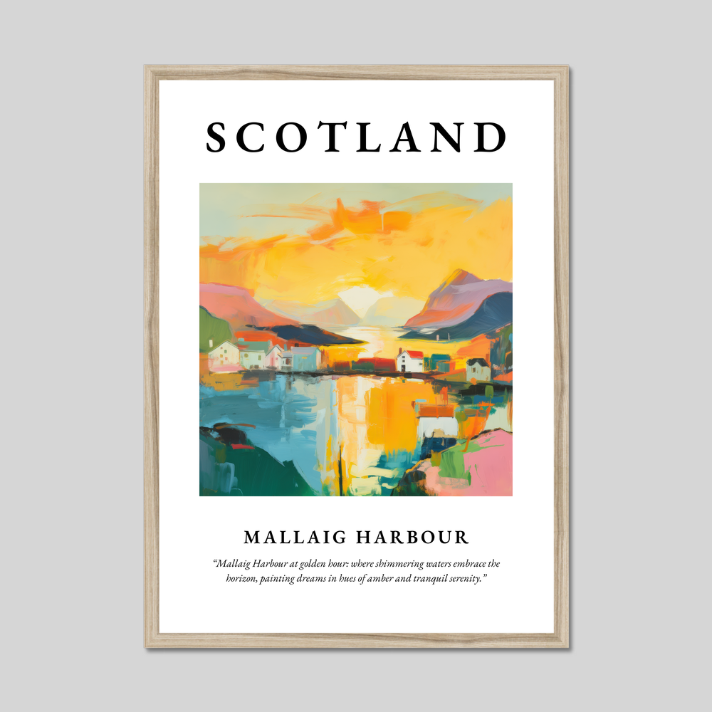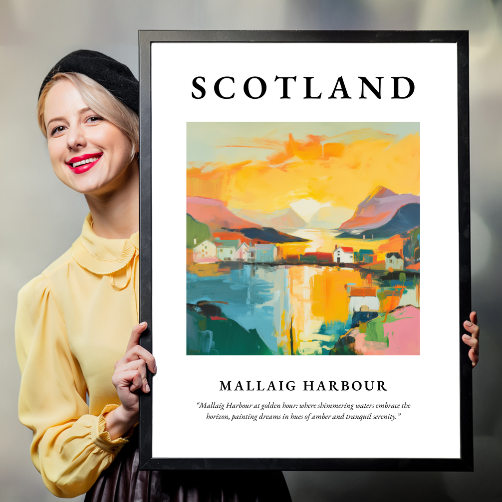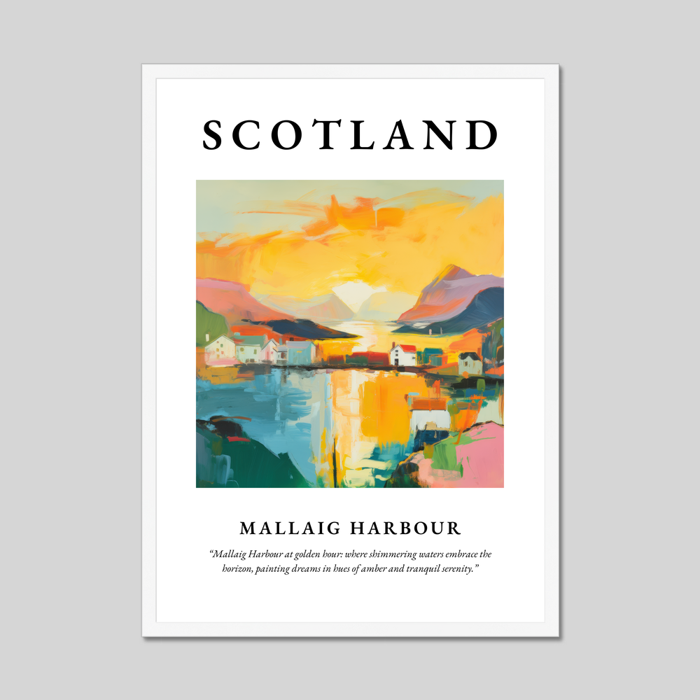At the top of the poster, the word "SCOTLAND" is emblazoned in bold lettering, commanding attention and setting the scene for the magnificent art below. Below, you'll discover a mesmerising painting of Mallaig Harbour, rendered in vibrant hues that capture the essence of a golden hour. The piece evokes tranquillity and dreams, with shimmering waters and a serene horizon, embodying the quote beneath: “Mallaig Harbour at golden hour: where shimmering waters embrace the horizon, painting dreams in hues of amber and tranquil serenity.”