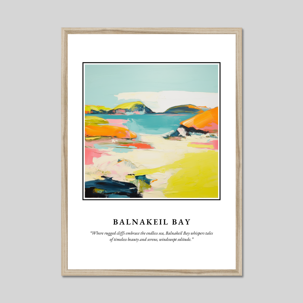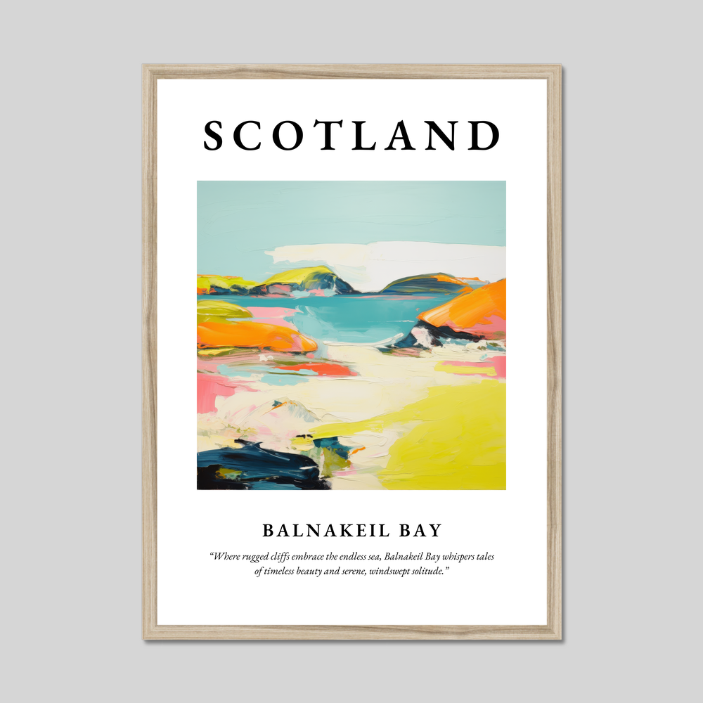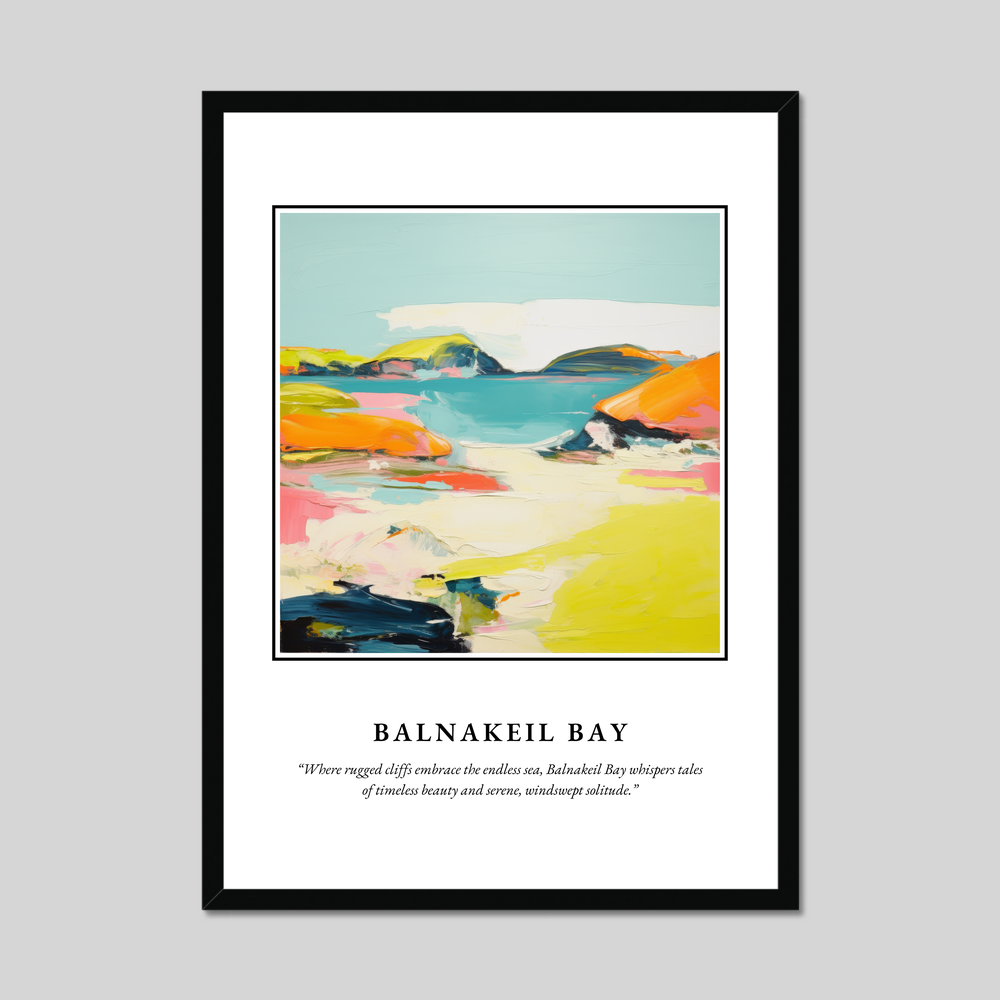 At the top, the word “SCOTLAND” is emblazoned in bold lettering, setting the stage for the vibrant, abstract painting below. This work of art captures the raw beauty and enigmatic charm of Balnakeil Bay with swirling colours and dynamic brushstrokes. The use of vivid hues conveys the bay's rugged cliffs and tranquil waters in a way that is both modern and timeless, inviting you to lose yourself in its sweeping vista. Complete with the evocative quote, “Where rugged cliffs embrace the endless sea, Balnakeil Bay whispers tales of timeless beauty and serene, windswept solitude,” this poster offers an artistic dialogue between text and imagery.