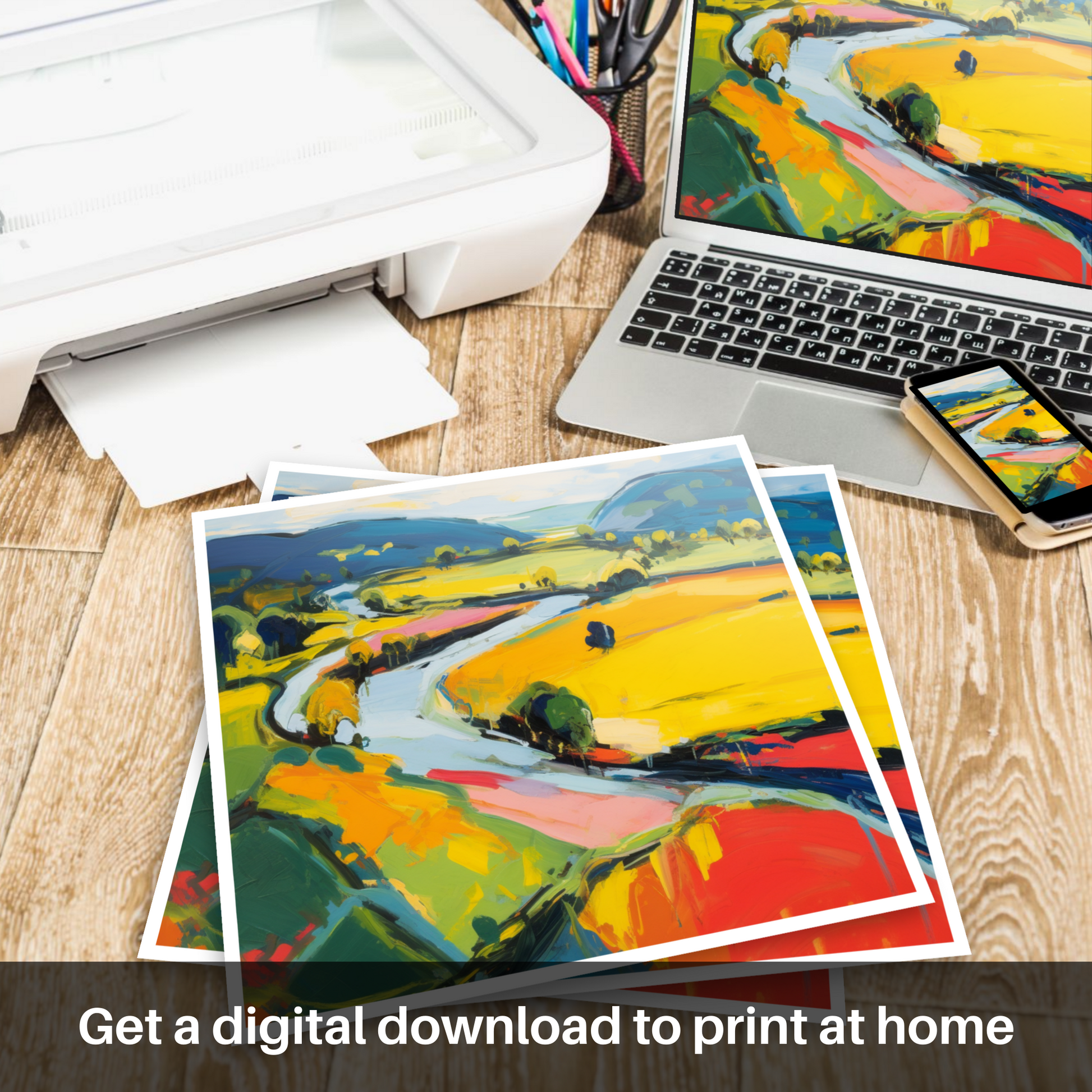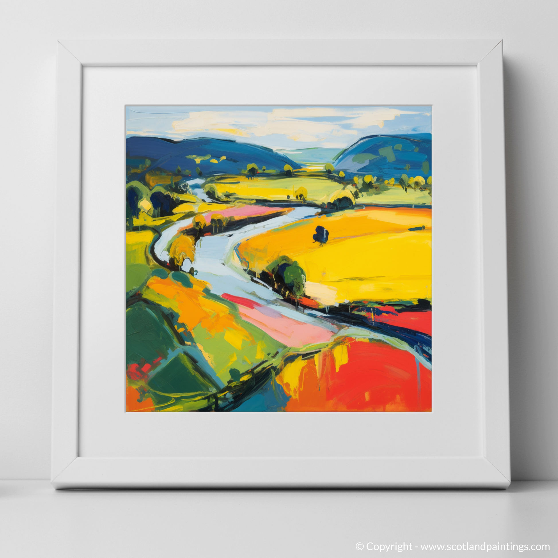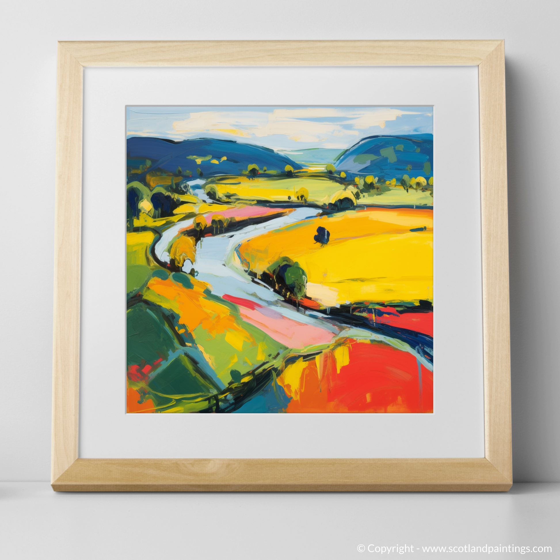 Immerse yourself in an effervescent portrayal of Perthshire's idyllic River Tay, captured here at the height of summer's embrace. This abstract print swirls with vigorous strokes of vivid hues, evoking the dynamic essence of the pastoral landscape's natural beauty. The vibrant yellows and oranges suggest fields bathed in sunlight, while the cerulean streaks hint at the meandering river's gentle flow beneath a vast, open sky brushed lightly with soft white clouds.