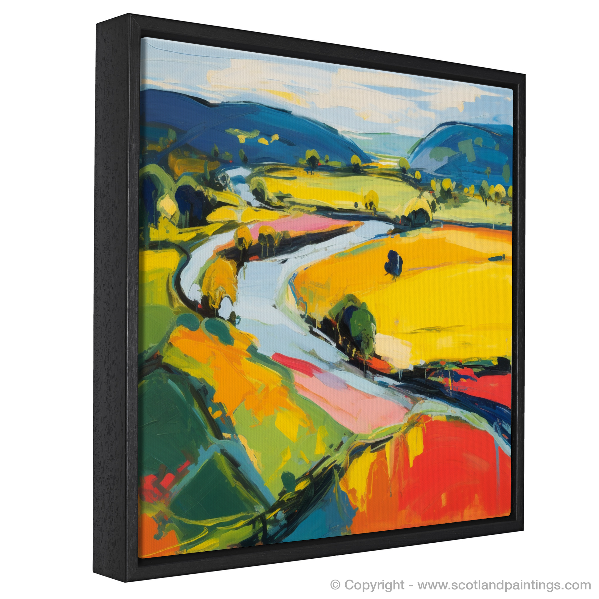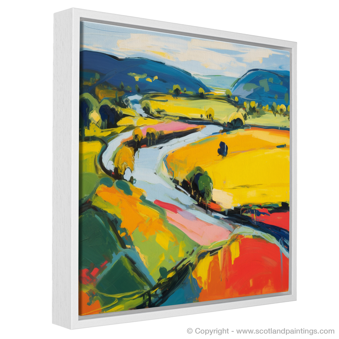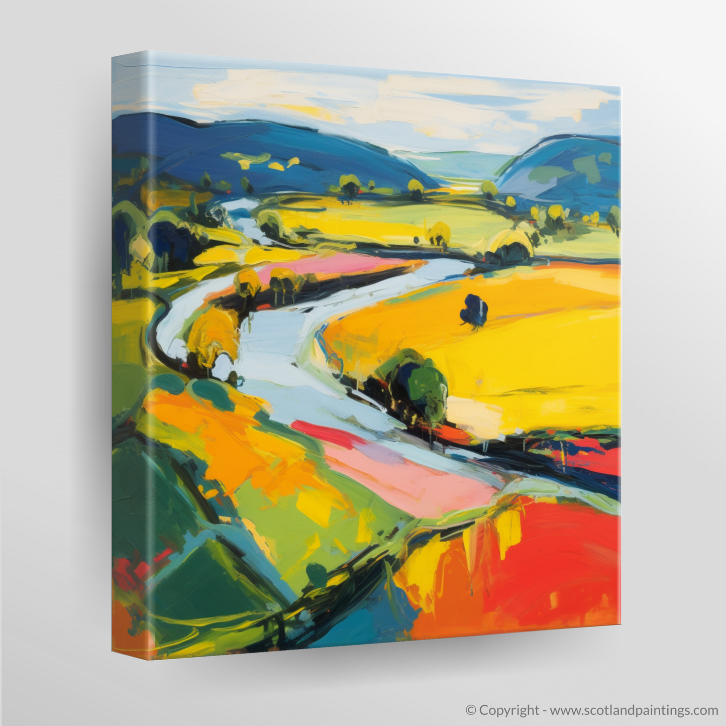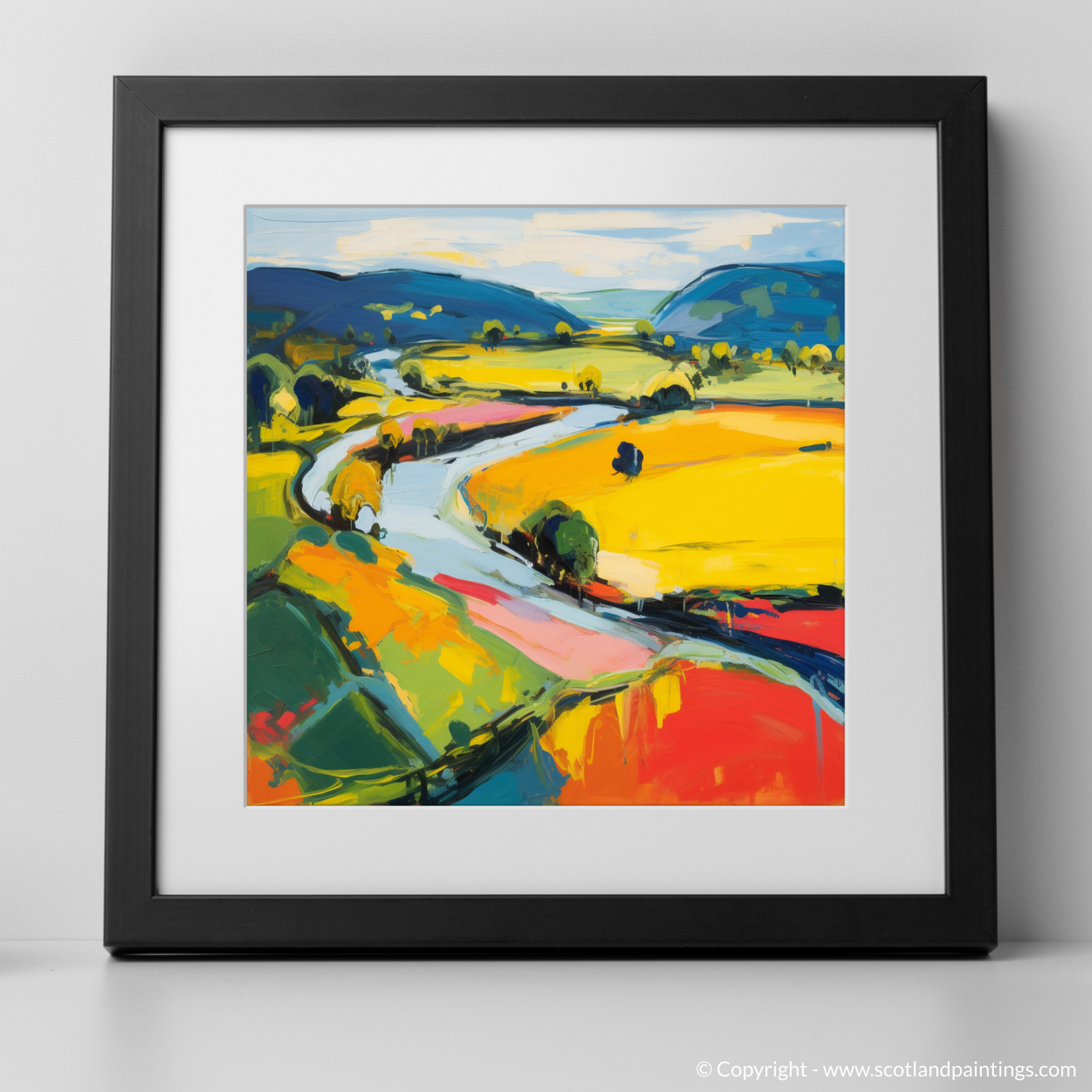 Immerse yourself in an effervescent portrayal of Perthshire's idyllic River Tay, captured here at the height of summer's embrace. This abstract print swirls with vigorous strokes of vivid hues, evoking the dynamic essence of the pastoral landscape's natural beauty. The vibrant yellows and oranges suggest fields bathed in sunlight, while the cerulean streaks hint at the meandering river's gentle flow beneath a vast, open sky brushed lightly with soft white clouds.