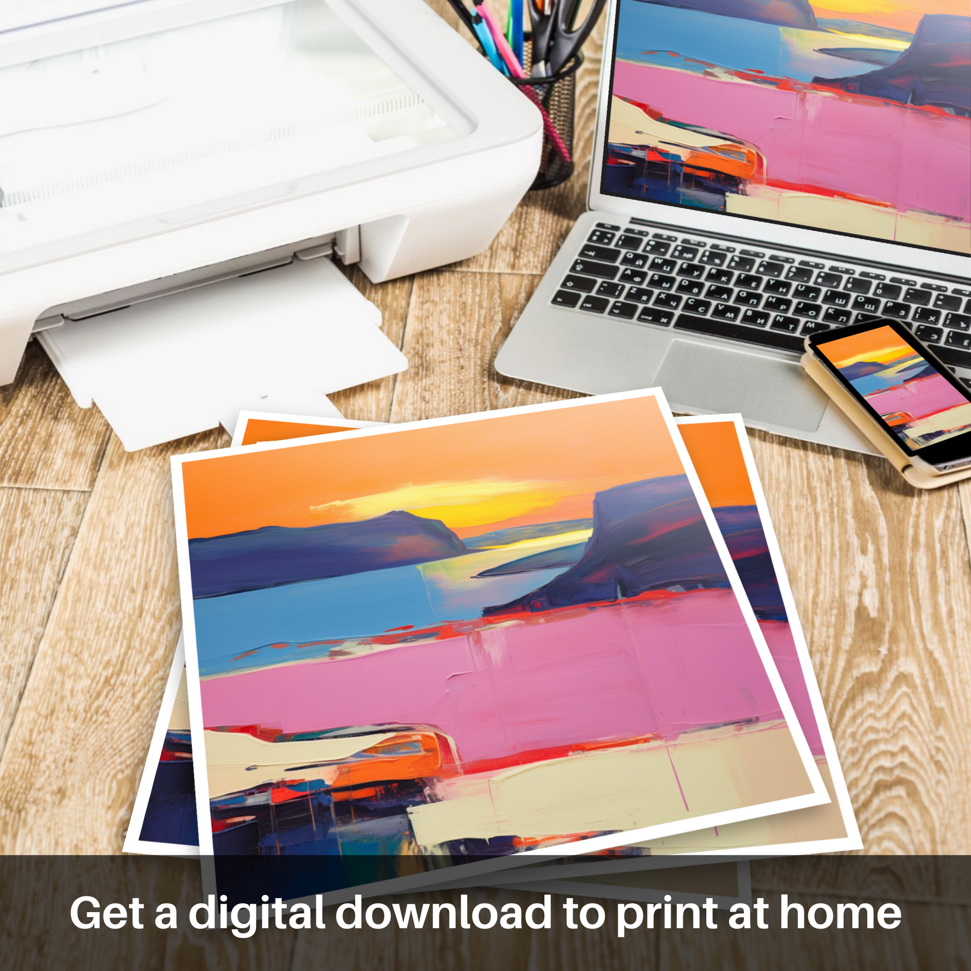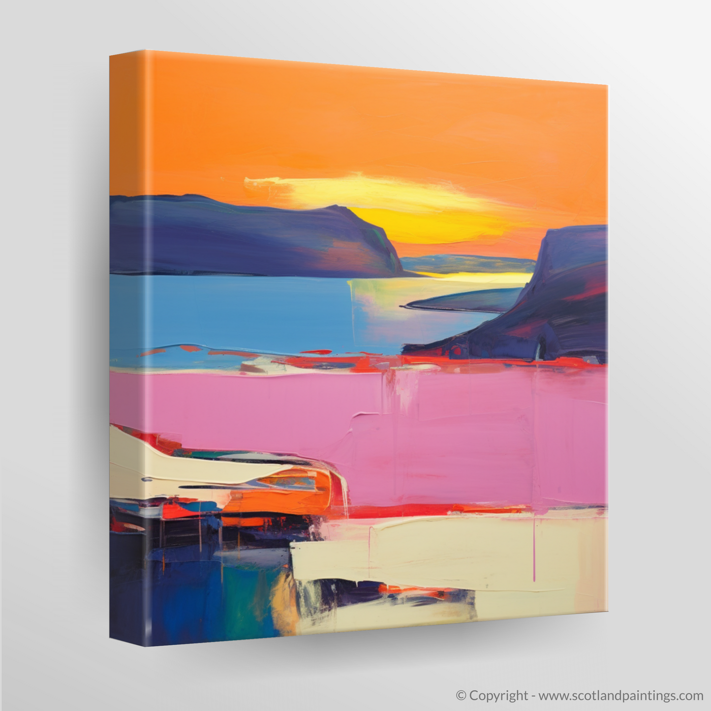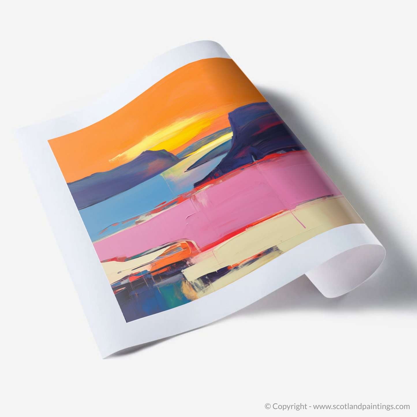 Let dusk at Sandwood Bay envelop your space with this mesmerising abstract print, capturing the essence of the bay's serene beauty as the day wanes. The canvas becomes a playground for hues, where broad strokes and daring colour choices hint at the natural splendour of this remote coastal gem.