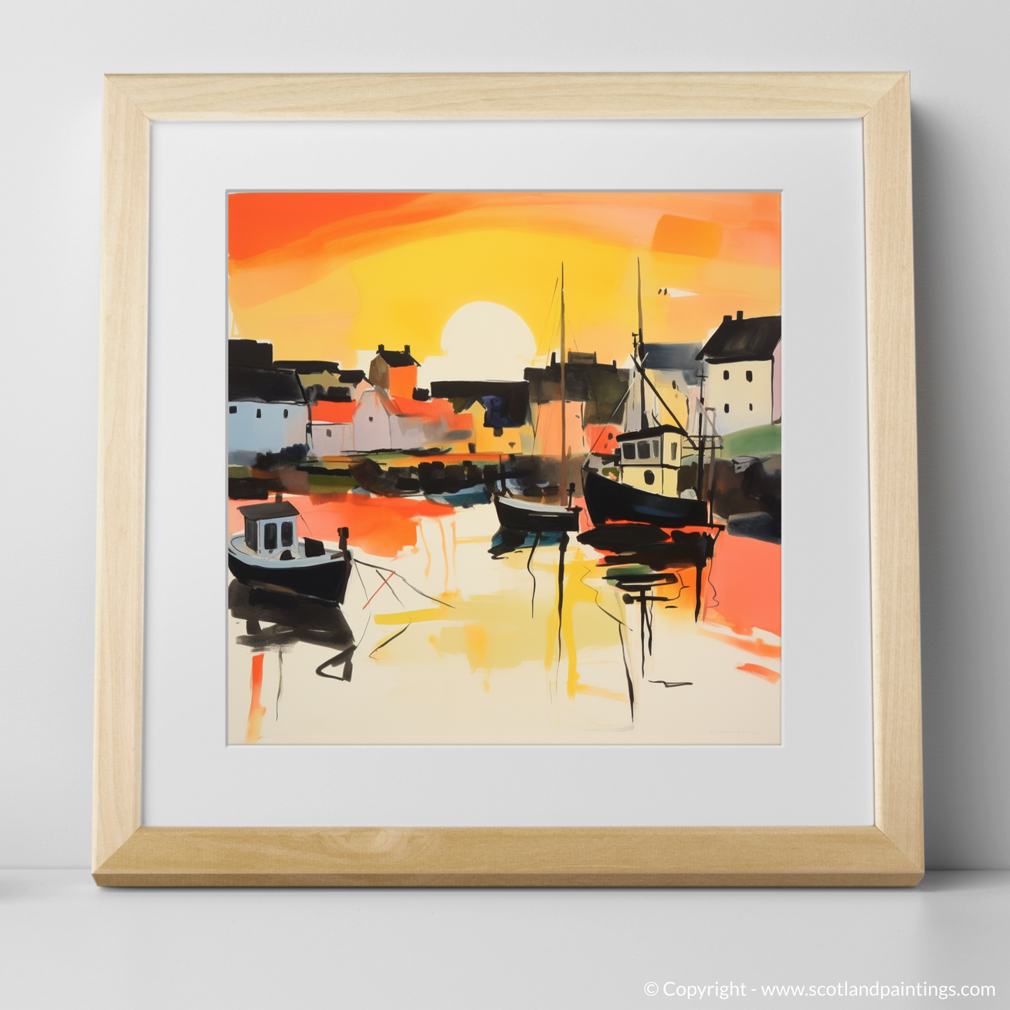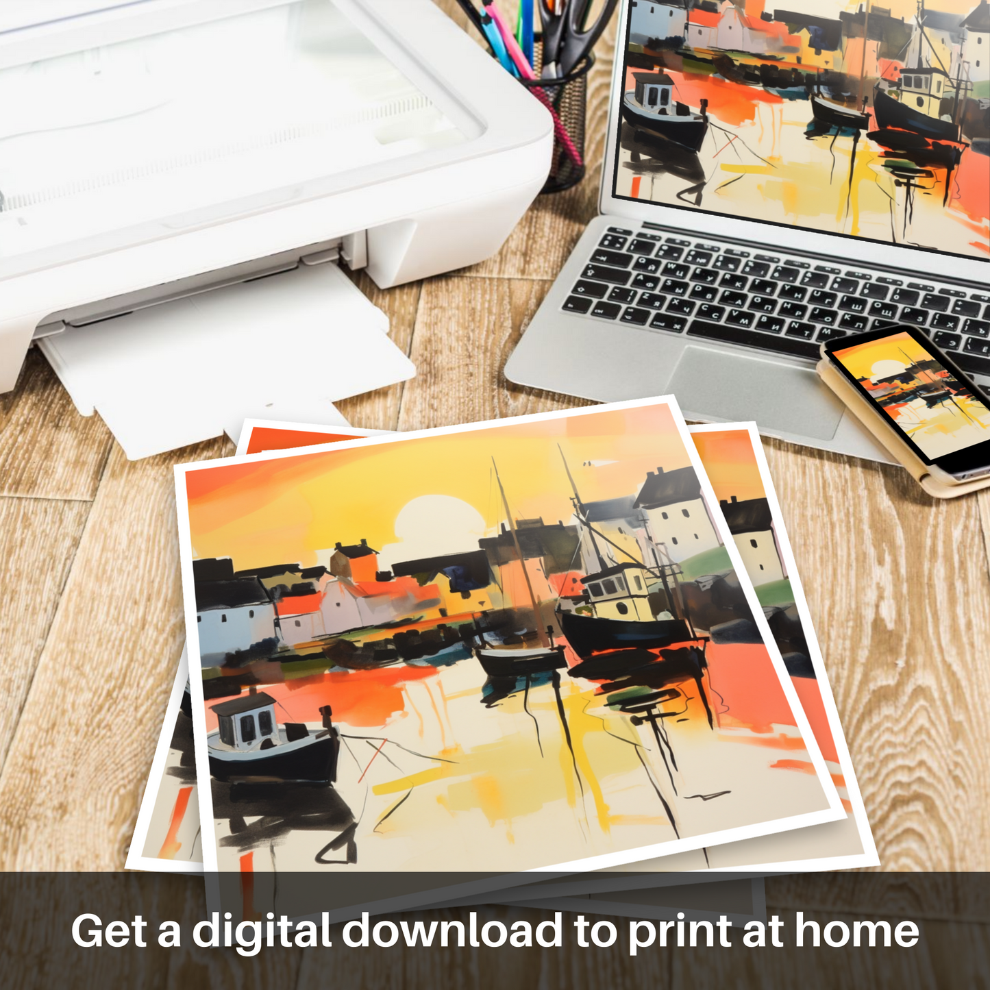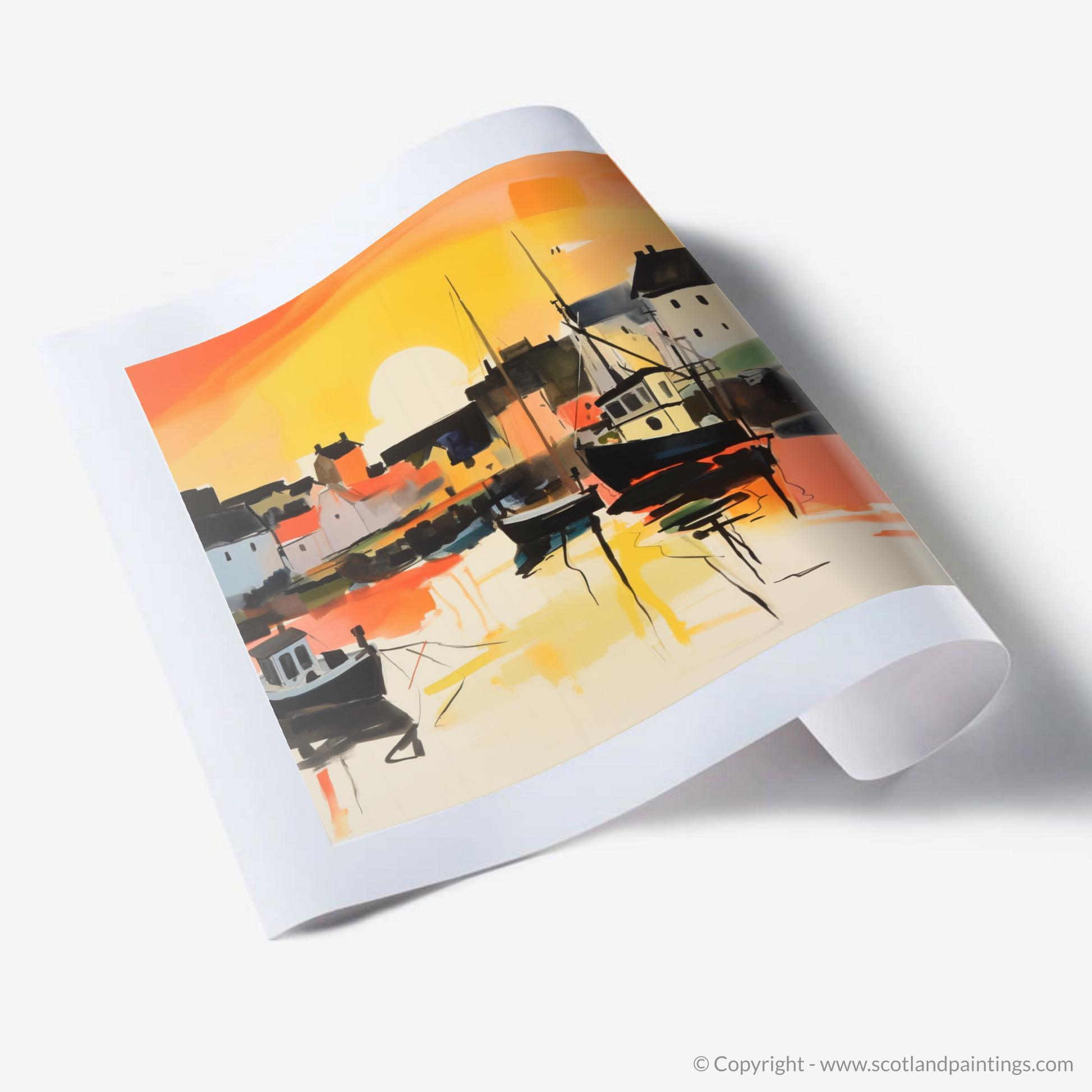 Immerse yourself in the distilled essence of a sunset over the serene Portnahaven Harbour, captured in this abstract print that masterfully plays with colour and form. The scene is a vibrant symphony of fiery oranges and reds that mirror the setting sun's lingering warmth in the evening sky. Bold strokes of white, black, and grey dance together, sketching out the quaint silhouettes of harbourside dwellings and the tranquil boats resting at anchor. These fleetingly still vessels are painted with a sense of gentle repose, their shadows and reflections a fluid dreamscape juxtaposed against the water's mirror-like surface. Hues of rich blues and greens sneak through, adding depth and a whisper of the cool seawater beneath the day's fiery farewell. This piece is not just a visual encounter; it's a sensory voyage that invites contemplative gazes and stirs the imagination — a print that promises to be a captivating focal point in any collection.