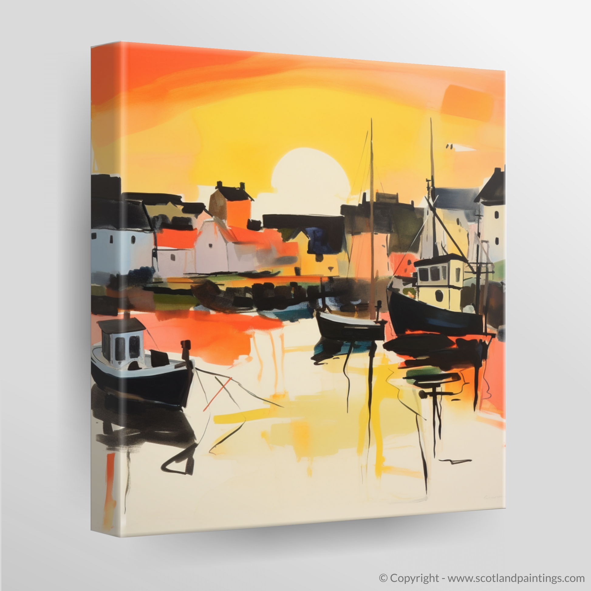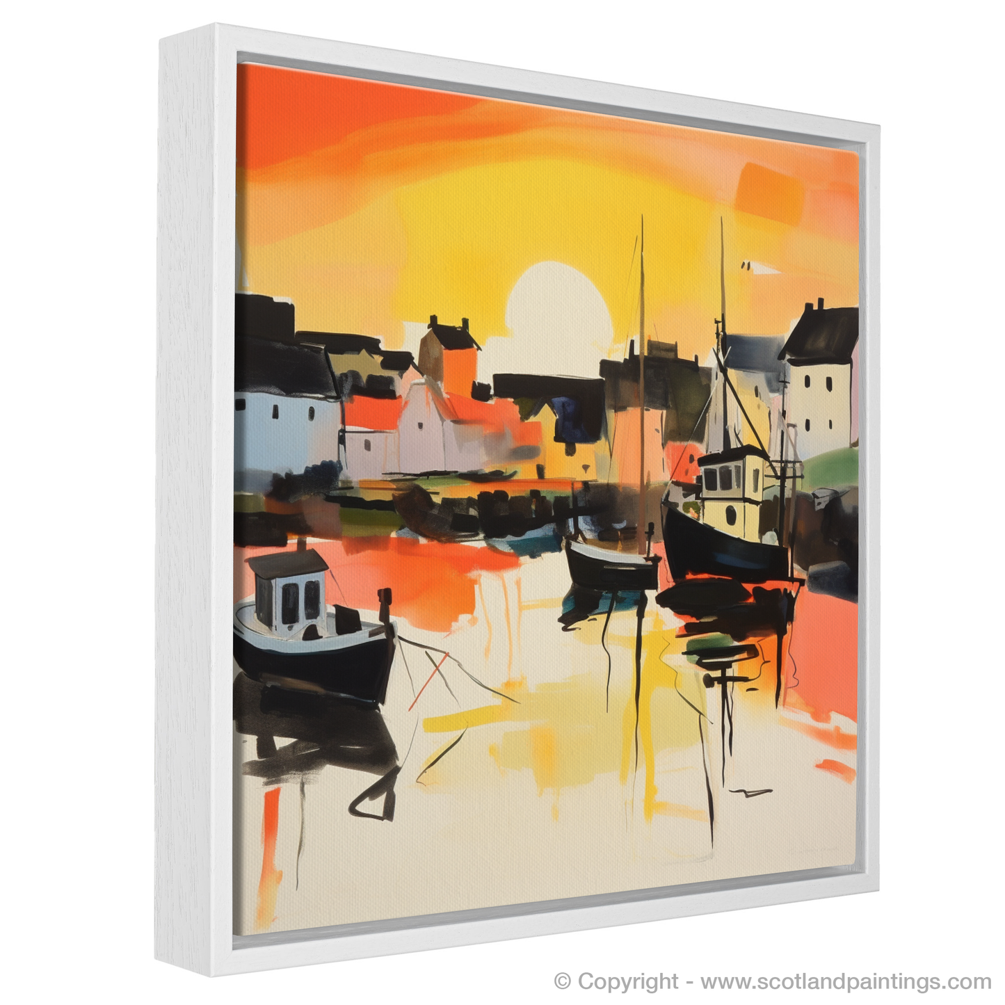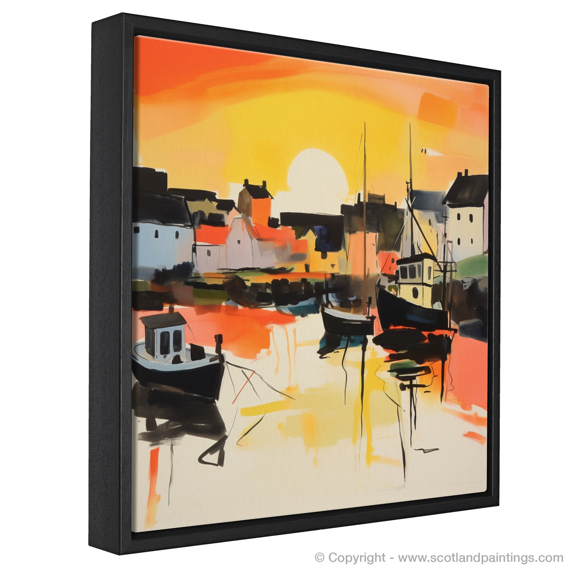 Immerse yourself in the distilled essence of a sunset over the serene Portnahaven Harbour, captured in this abstract print that masterfully plays with colour and form. The scene is a vibrant symphony of fiery oranges and reds that mirror the setting sun's lingering warmth in the evening sky. Bold strokes of white, black, and grey dance together, sketching out the quaint silhouettes of harbourside dwellings and the tranquil boats resting at anchor. These fleetingly still vessels are painted with a sense of gentle repose, their shadows and reflections a fluid dreamscape juxtaposed against the water's mirror-like surface. Hues of rich blues and greens sneak through, adding depth and a whisper of the cool seawater beneath the day's fiery farewell. This piece is not just a visual encounter; it's a sensory voyage that invites contemplative gazes and stirs the imagination — a print that promises to be a captivating focal point in any collection.