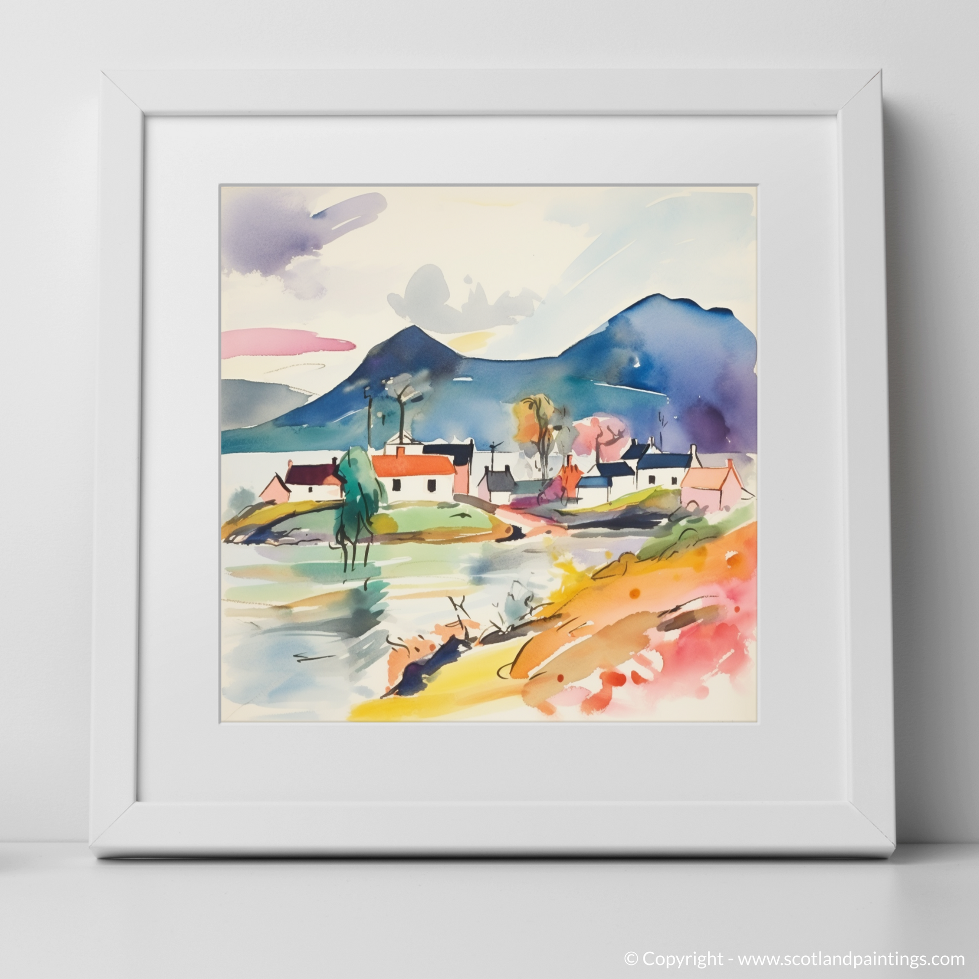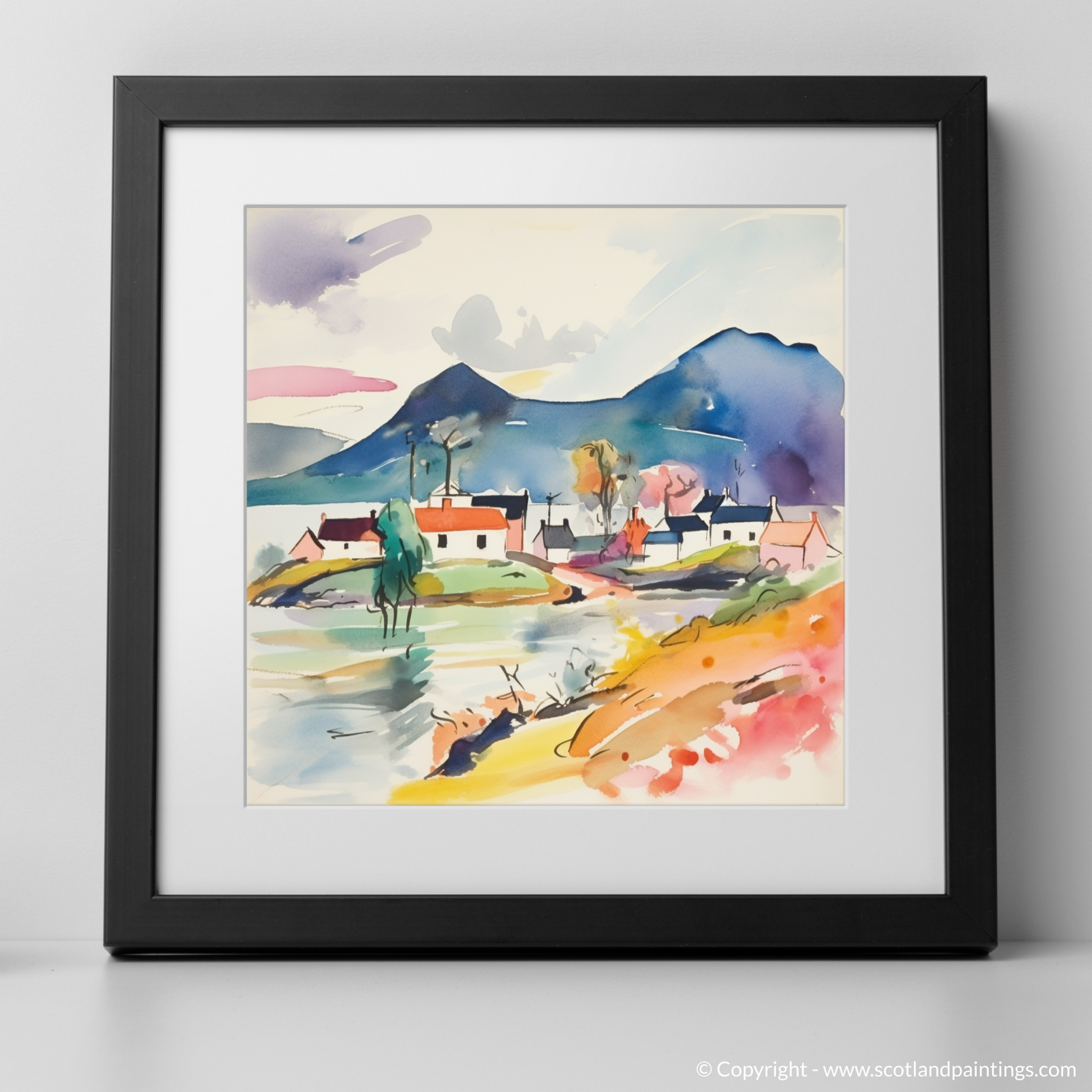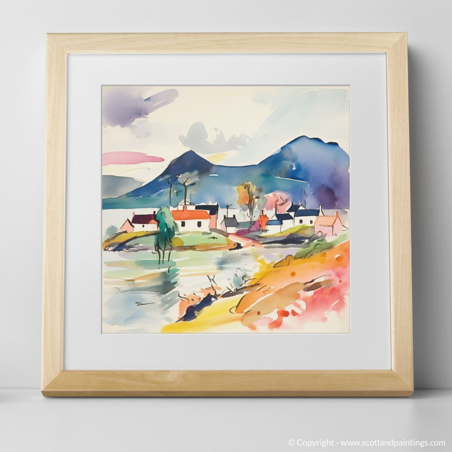 A smattering of quaint houses, their forms simplified and stylised, are painted in a harmony of pastels and bold hues, reflecting Plockton’s charming architecture. A solitary tree, abstracted to its very essence, stretches its limbs towards the sky, an embodiment of resilience and growth.