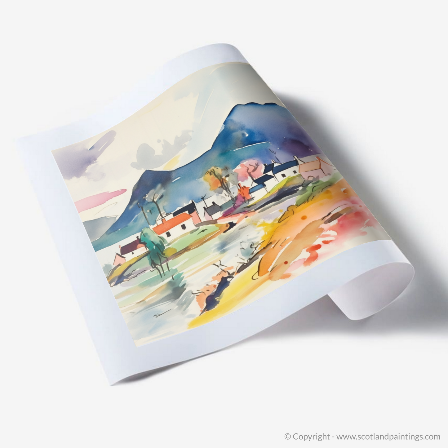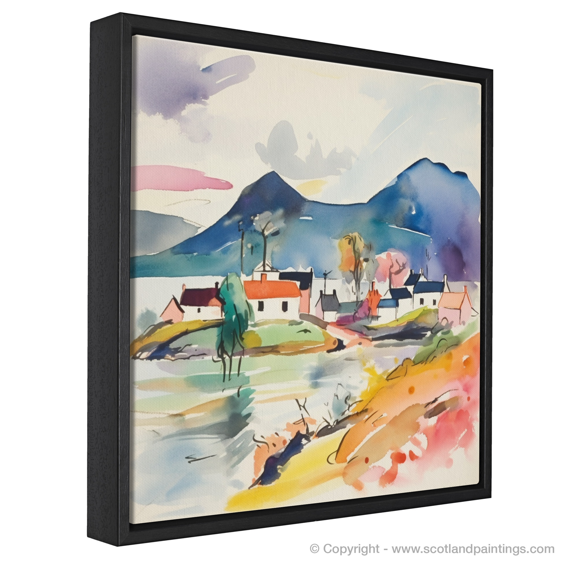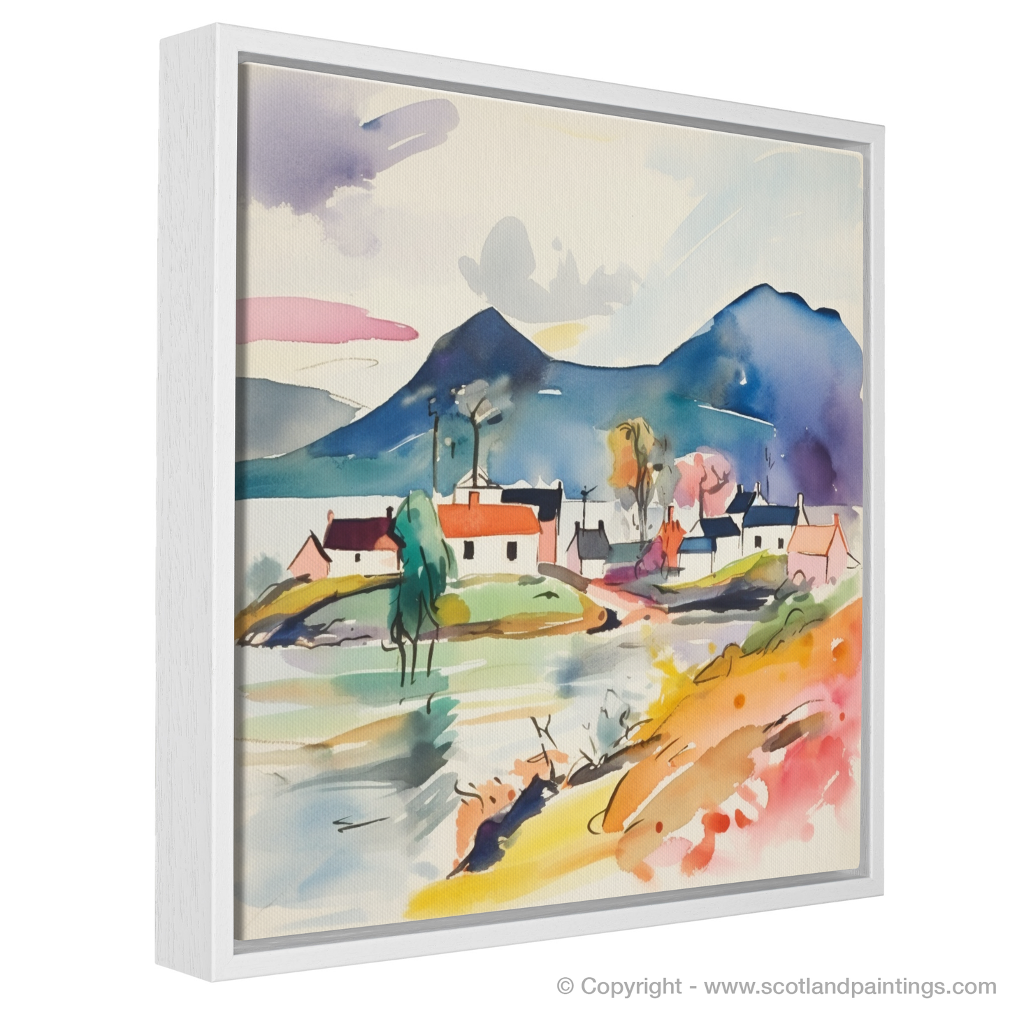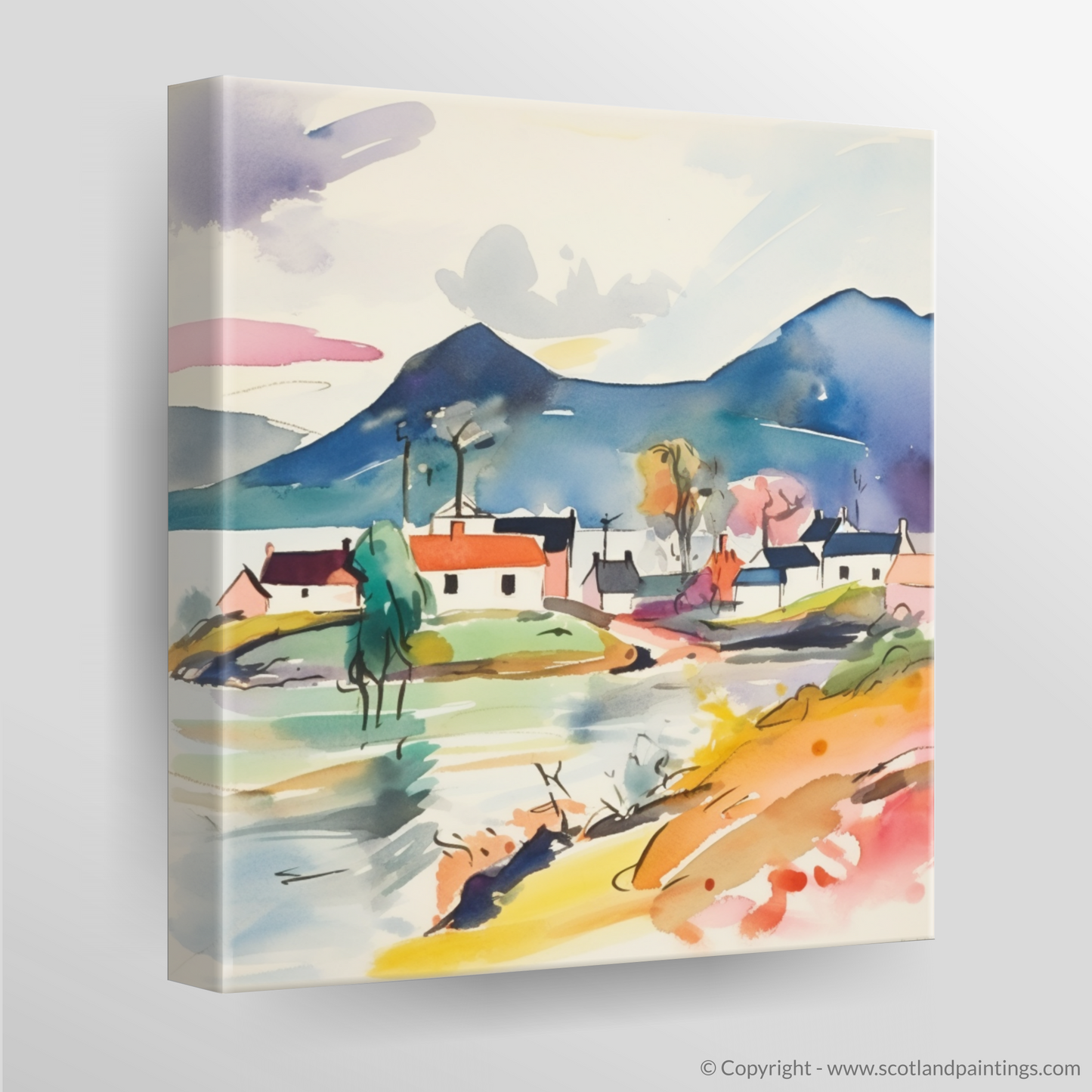 A smattering of quaint houses, their forms simplified and stylised, are painted in a harmony of pastels and bold hues, reflecting Plockton’s charming architecture. A solitary tree, abstracted to its very essence, stretches its limbs towards the sky, an embodiment of resilience and growth.