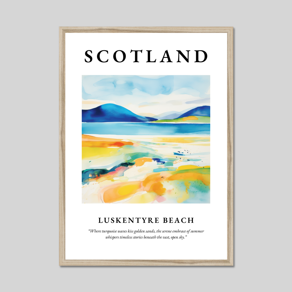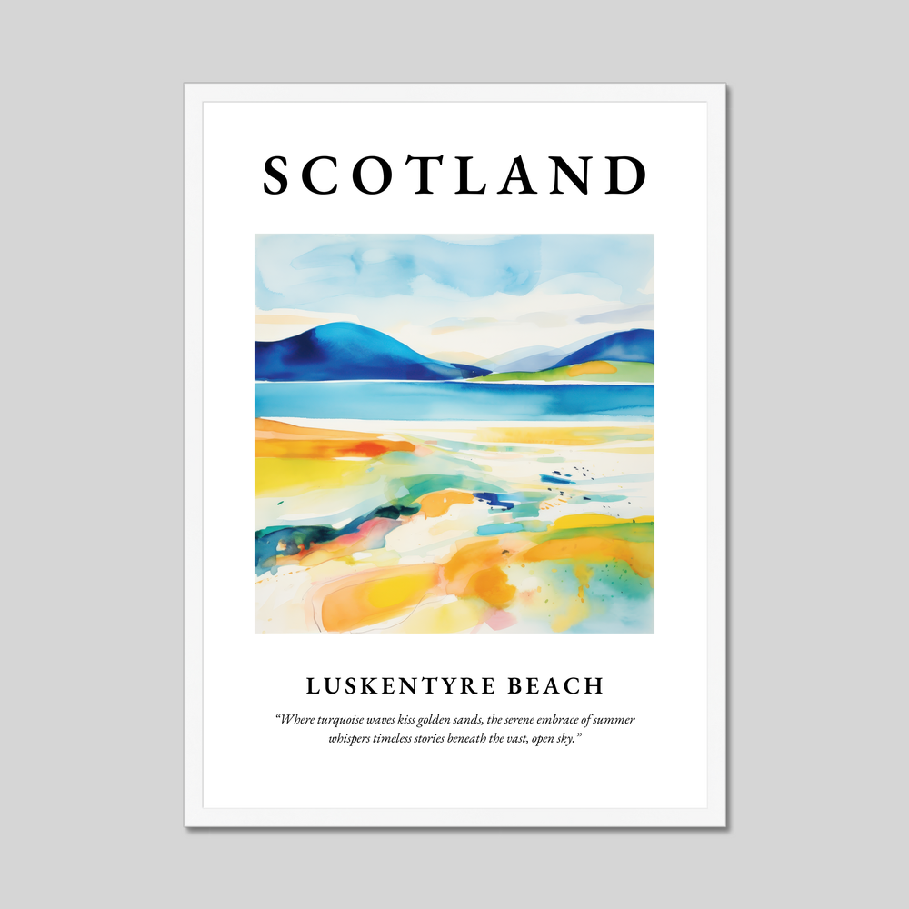 This poster captures the essence of Luskentyre Beach through an abstract lens, where bold, sweeping strokes of vibrant turquoise blend seamlessly with warm, golden hues, echoing the serene embrace of a summer's day. The word “SCOTLAND” stands proudly at the top, inviting viewers to begin a visual adventure, while the evocative quote beneath the painting adds layers of meaning, hinting at the timeless stories whispered by the natural landscape.
