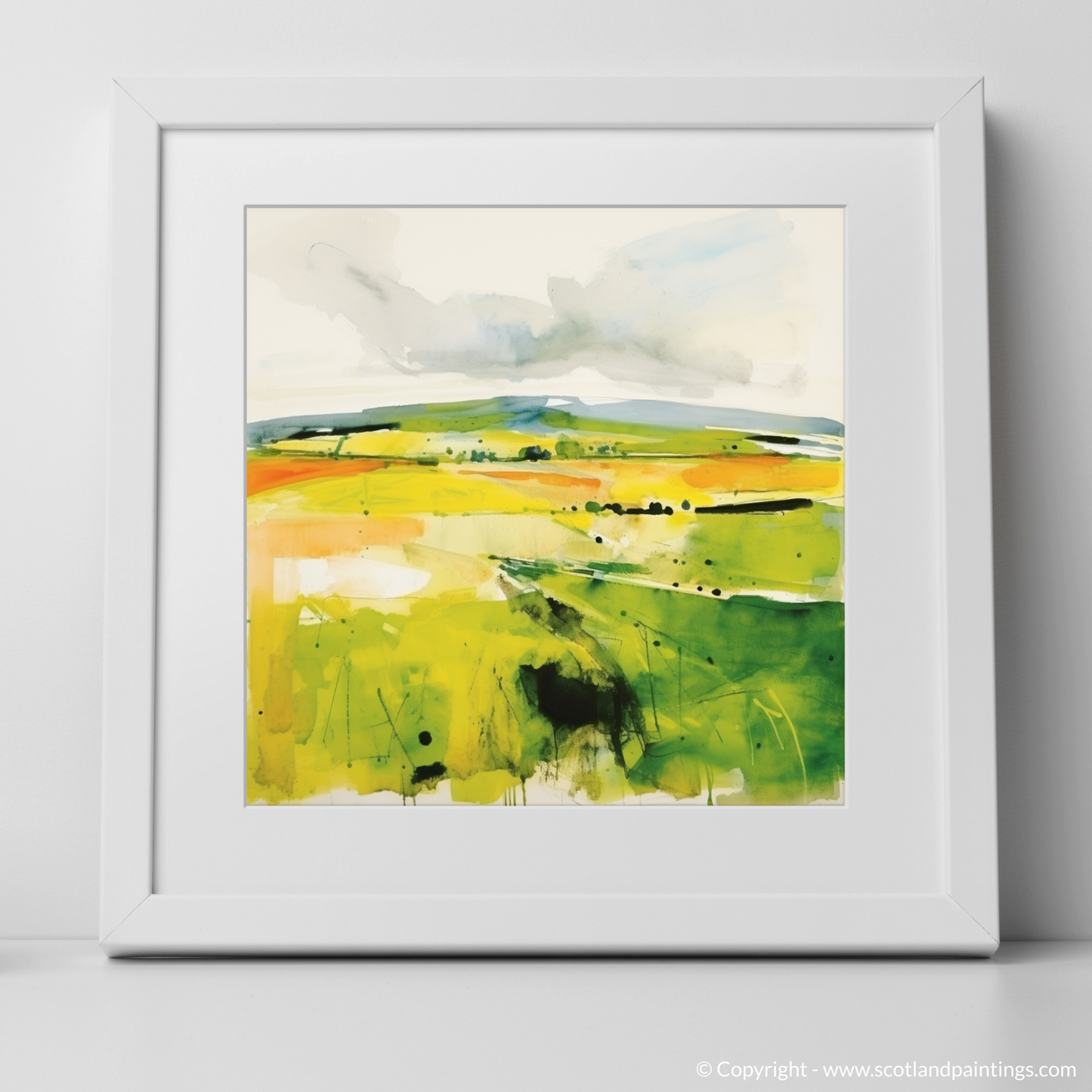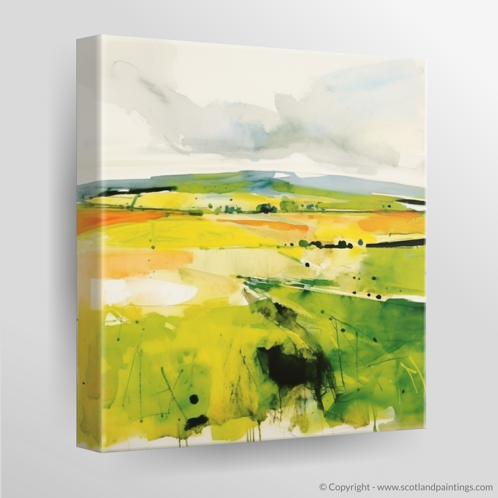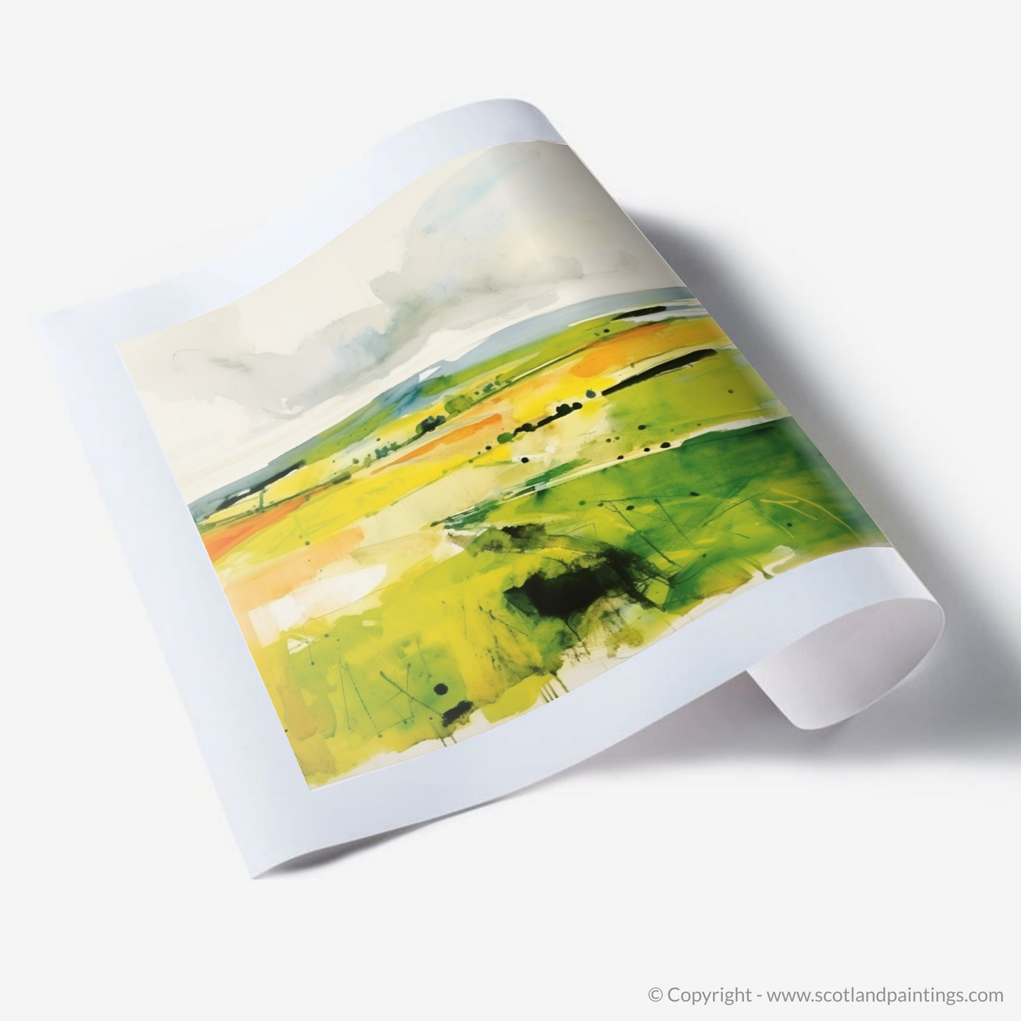 Broad, sweeping brushstrokes give the impression of movement, as if the very breeze that rustles through the valley has left its mark across the canvas. Droplets and splatters convey a sense of the unpredictable Scottish rain, bringing life and nourishment to the land.