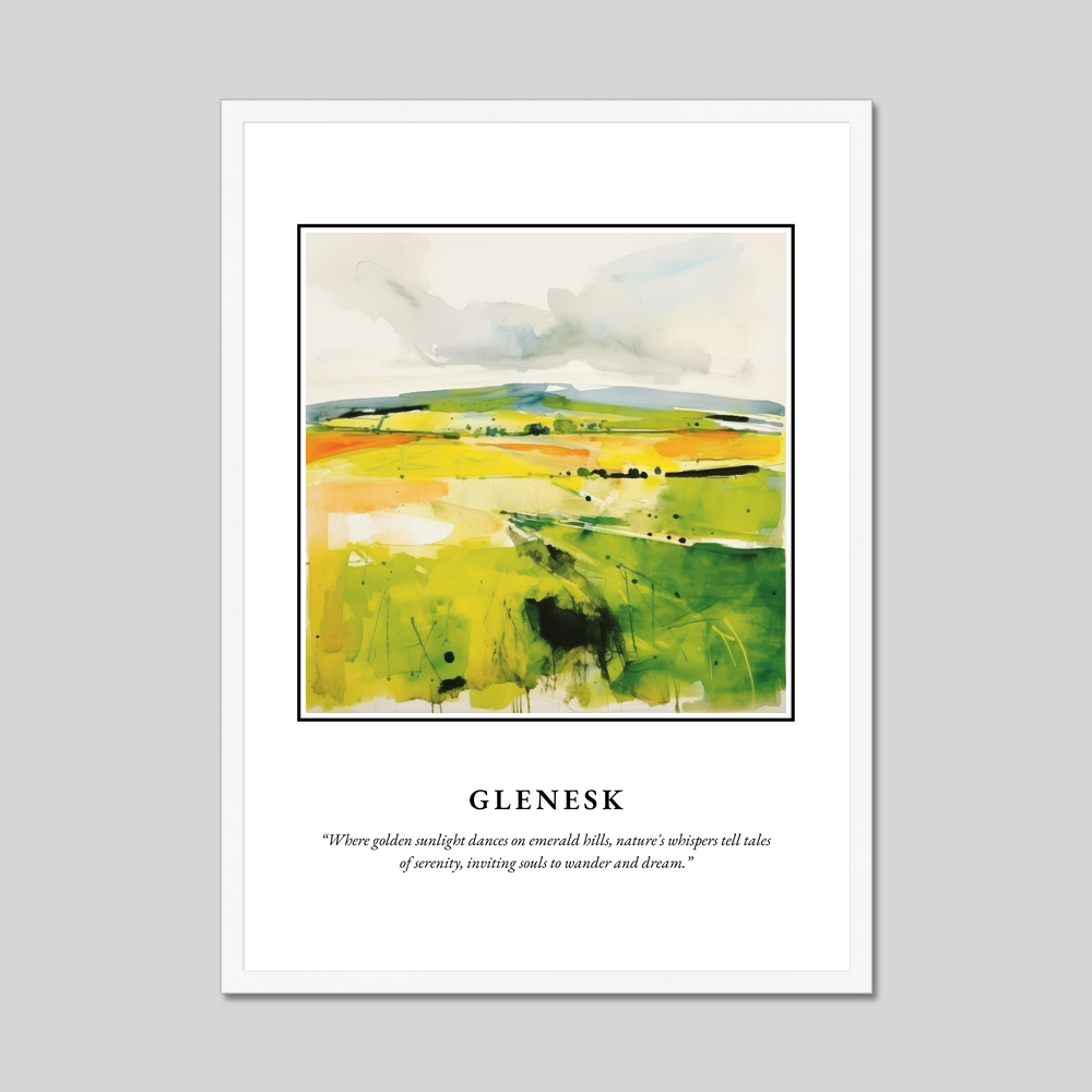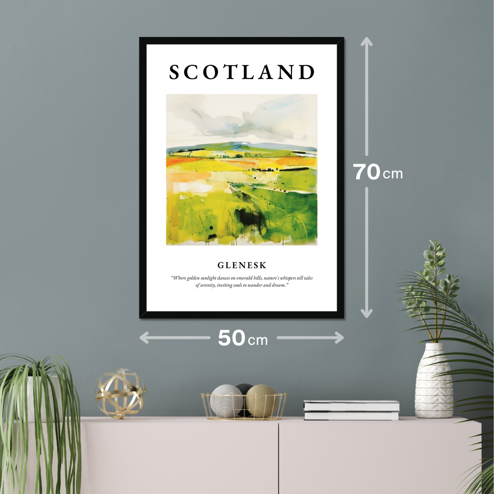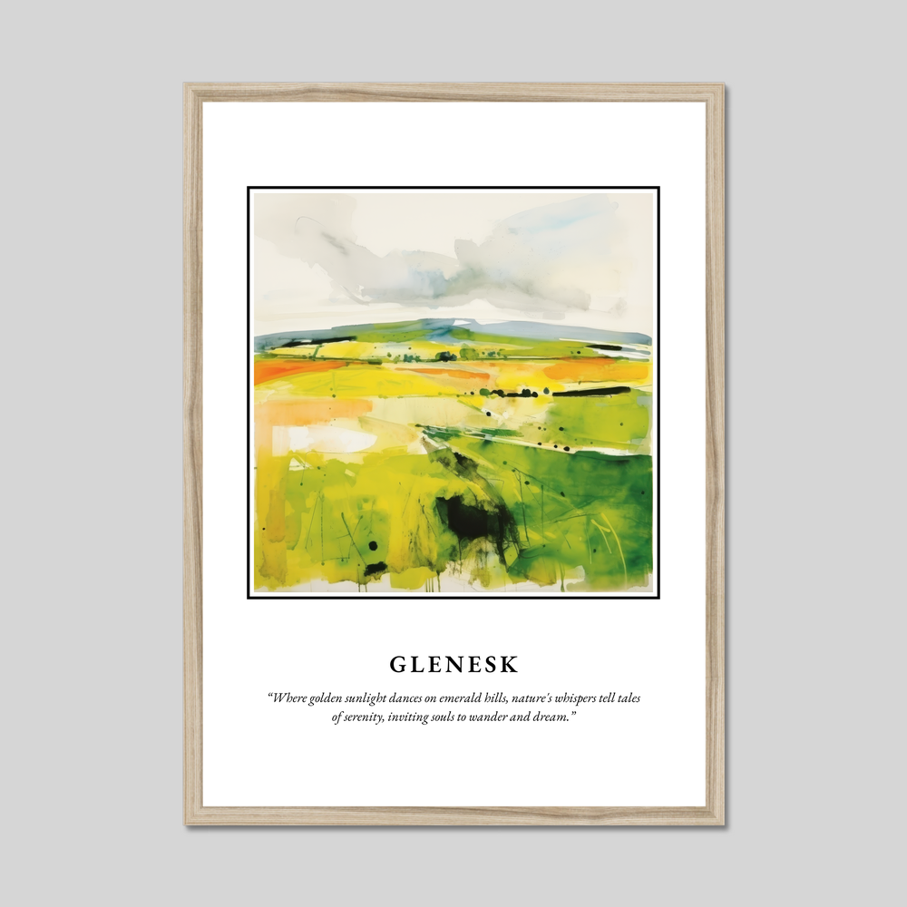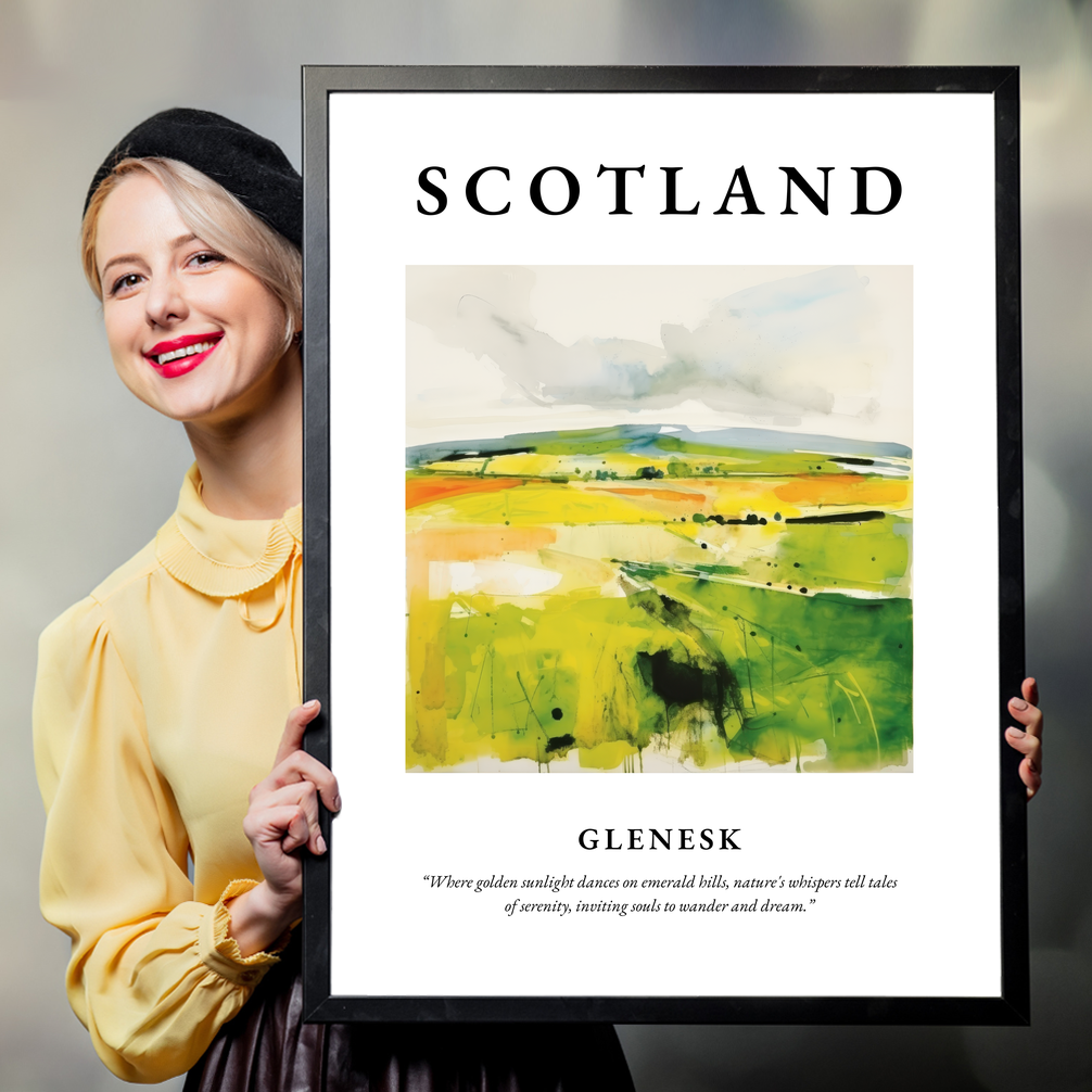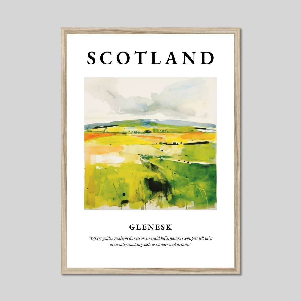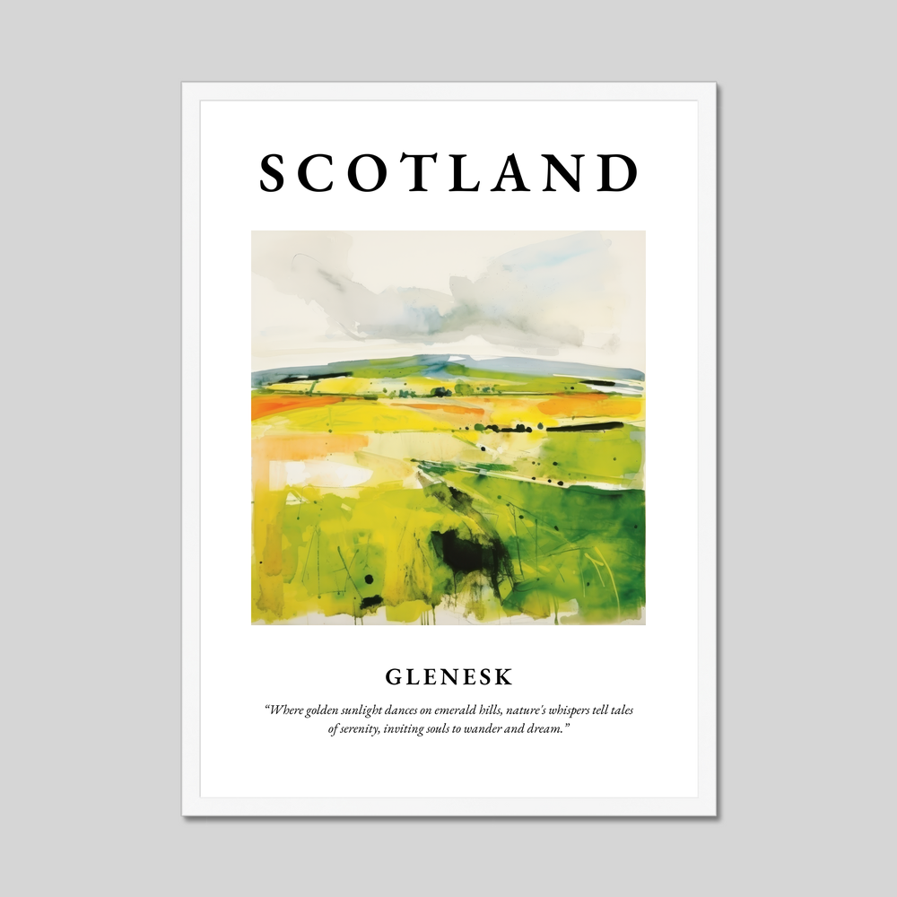 Dive into the abstract beauty captured in this poster, where vibrant hues of green and gold converge in a dynamic portrayal of Glenesk's rolling landscapes. The bold lettering at the top proudly proclaims "SCOTLAND," setting the stage for the visual journey below. The flowing brushstrokes evoke a heartfelt connection to nature, shadows flit across the scene, mimicking the play of sunlight over the hills, inviting viewers to explore the land with their imagination. Beneath the painting, the evocative quote, “Where golden sunlight dances on emerald hills, nature's whispers tell tales of serenity, inviting souls to wander and dream,” adds an extra layer of depth, resonating with anyone who carries a piece of Scotland in their heart.