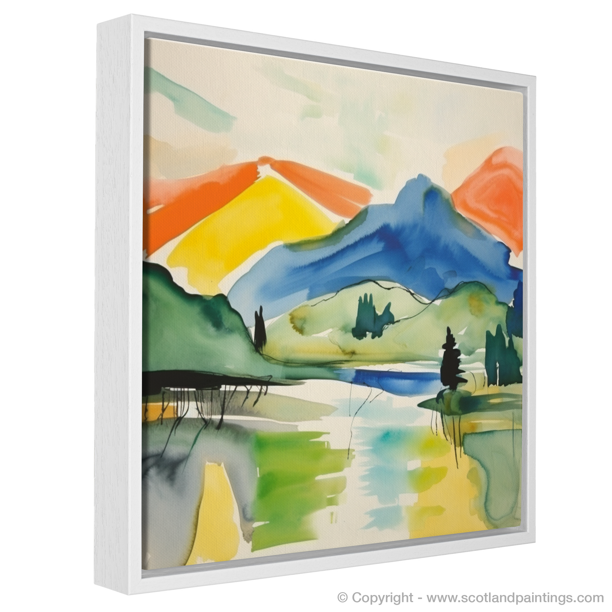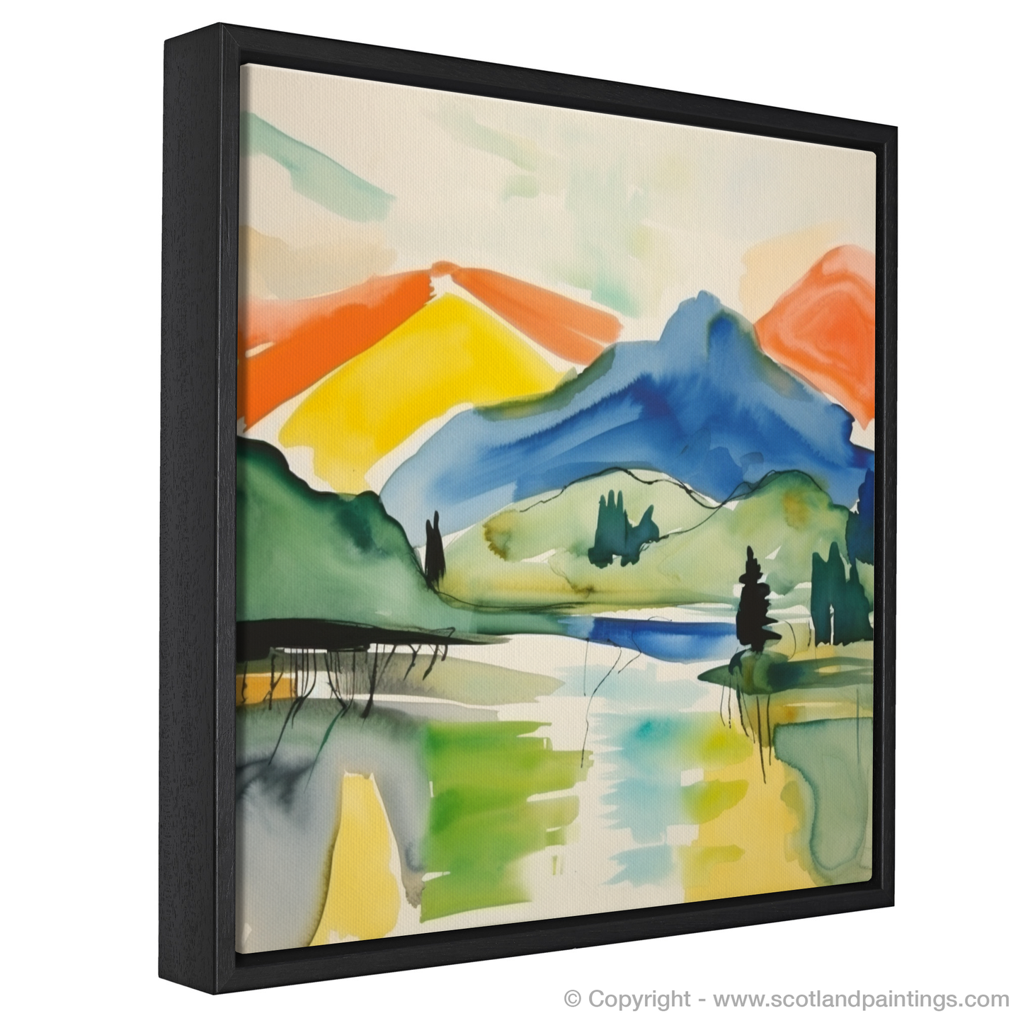 Imagine a canvas where the serene beauty of Loch Achray is captured through a symphony of vivid colours and fluid forms, inviting you into an abstract realm. This exquisite print showcases a landscape transformed into a mesmerising interplay of organic shapes and entrancing hues. The viewer is presented with a tapestry of deep blues and fresh greens that echo the natural essence of water and foliage, while the rolling hills are reimagined with broad strokes in shades of azure and olive.