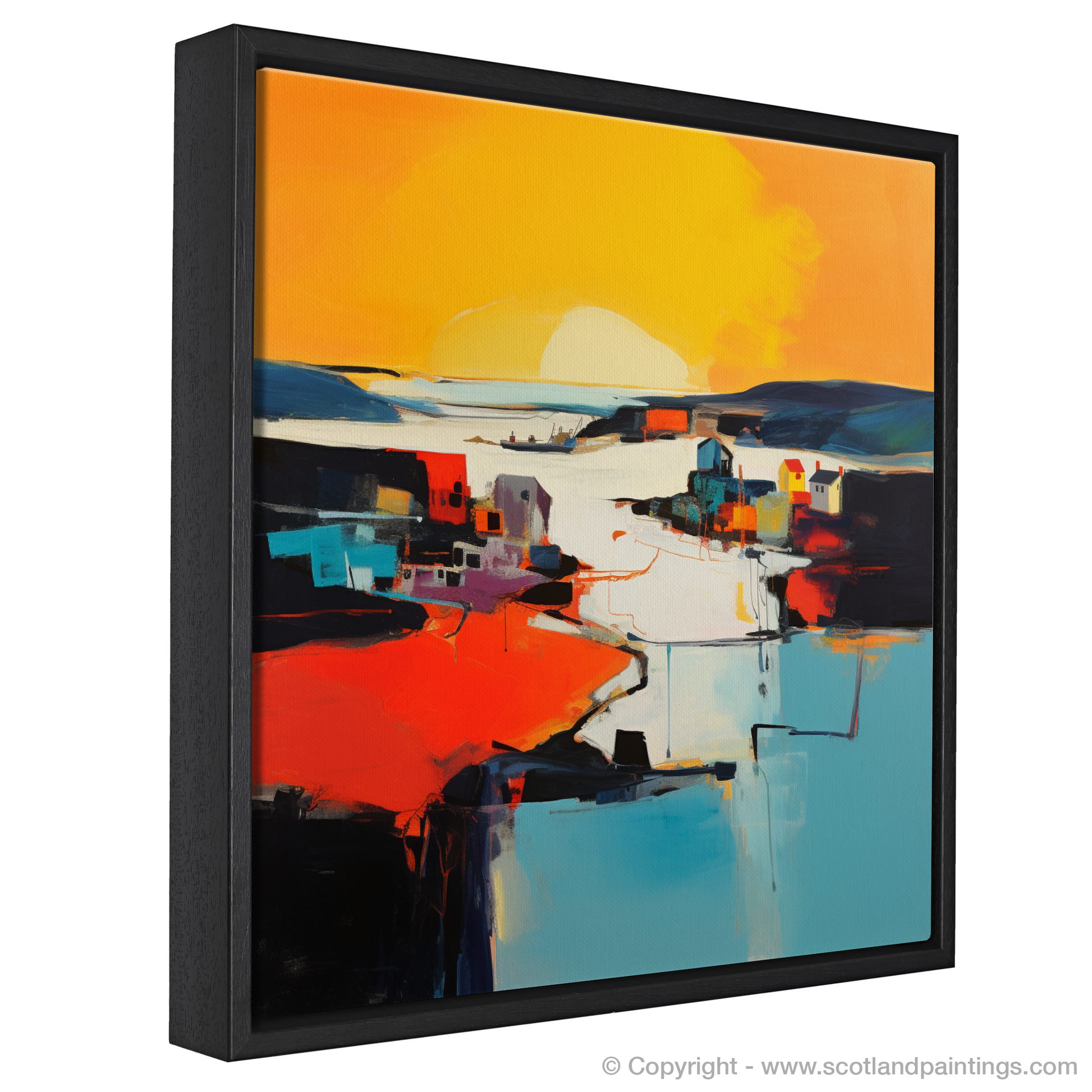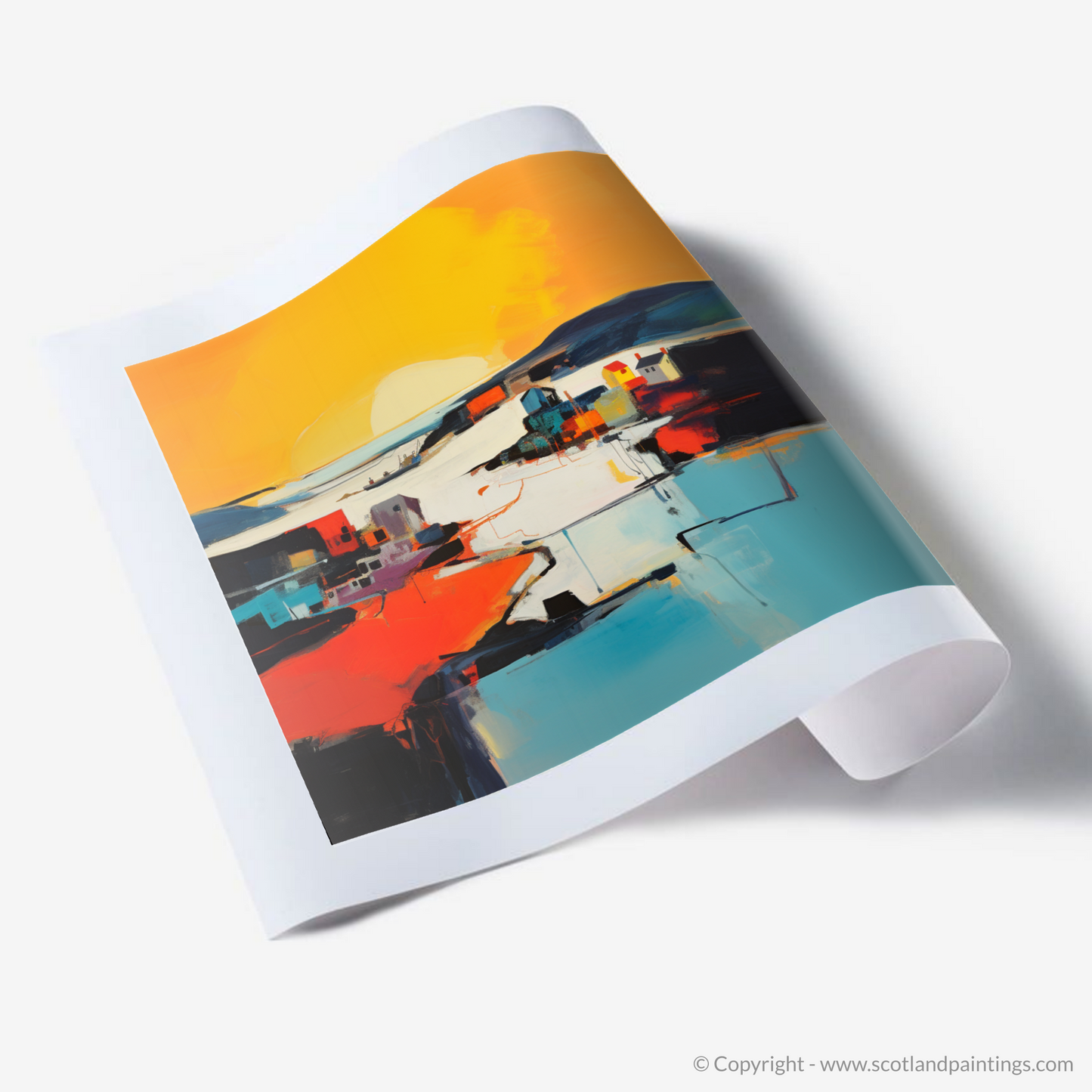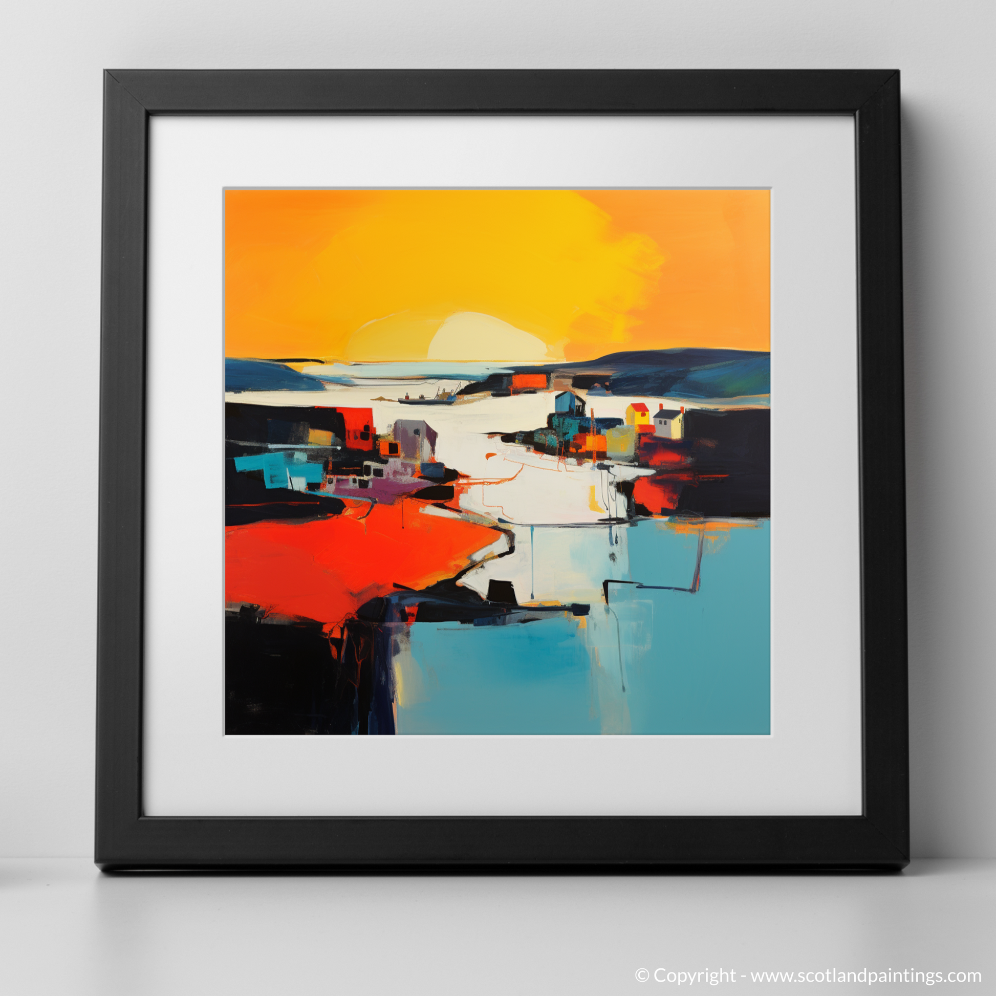 Capturing the ephemeral beauty of the twilight dance, this evocative abstract print transforms Whitehills Harbour into a symphony of bold colours and striking shapes, alluding to the serene grandeur of golden hour. Fiery oranges and warm yellows melt into cooler blues and stark blacks, portraying the unique interplay of light and shadow as day gracefully submits to evening. The abstraction distils the essence of the harbour, creating a vista that is both familiar in its homage to coastal charm and intriguing in its departure from literal representation.