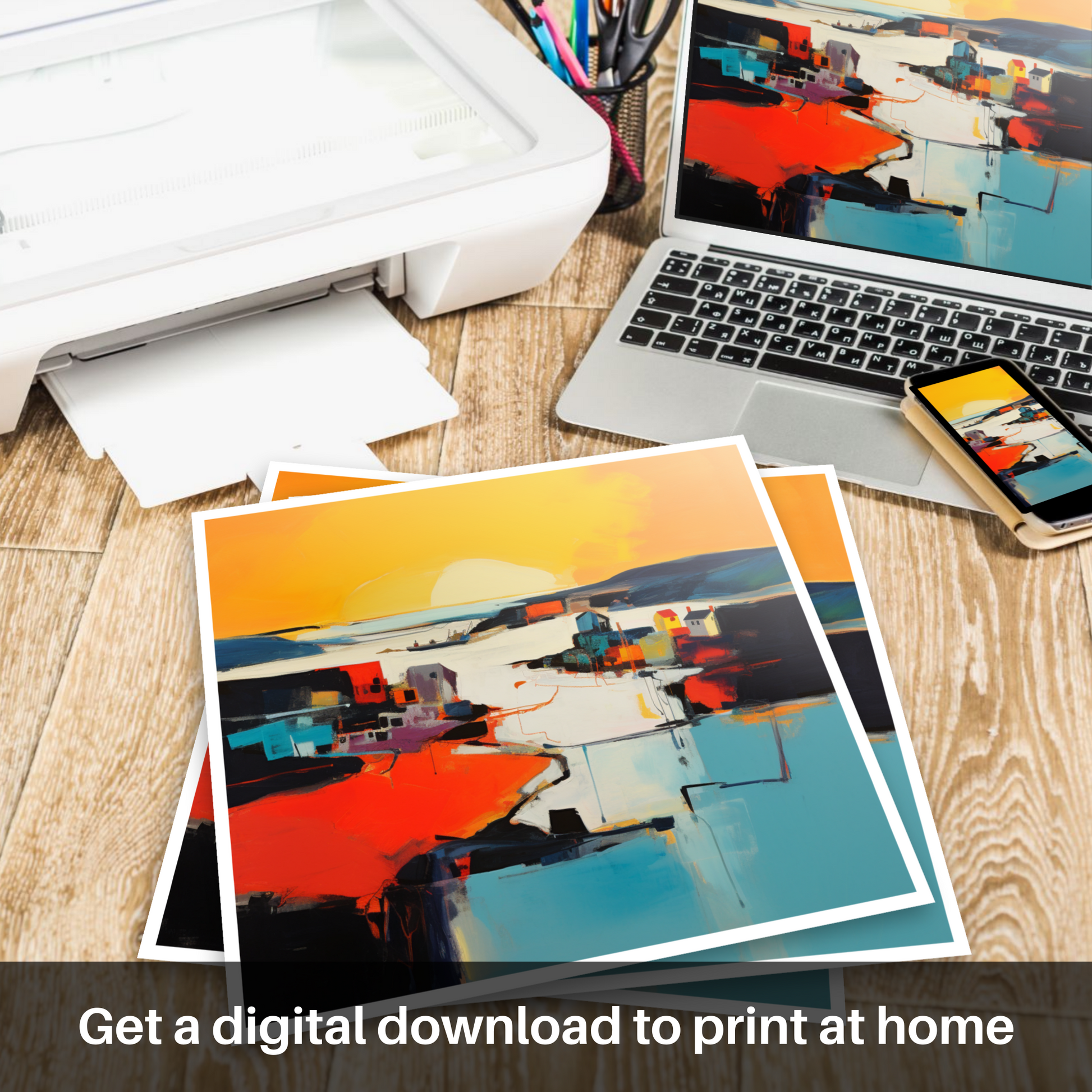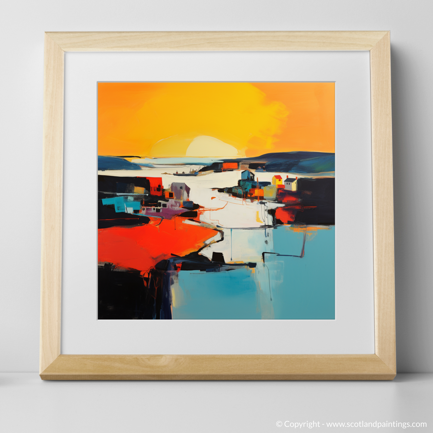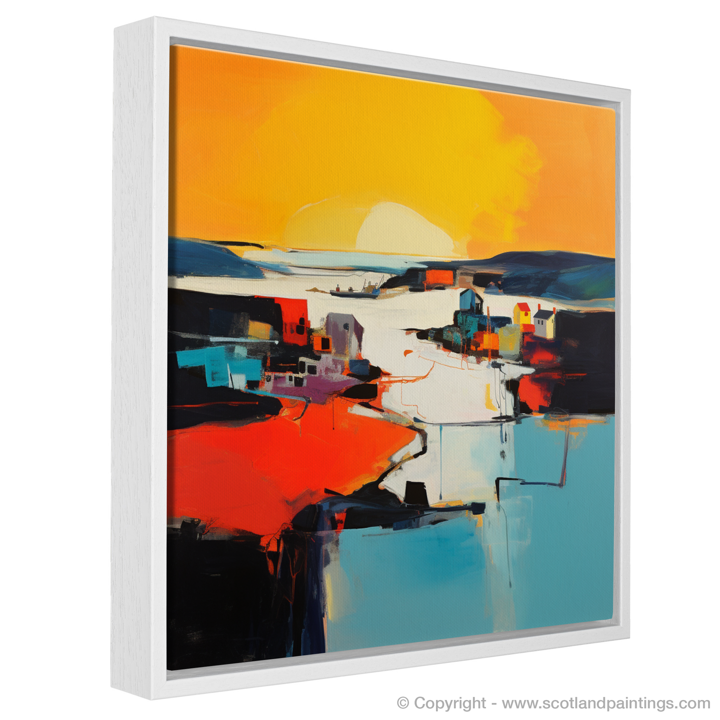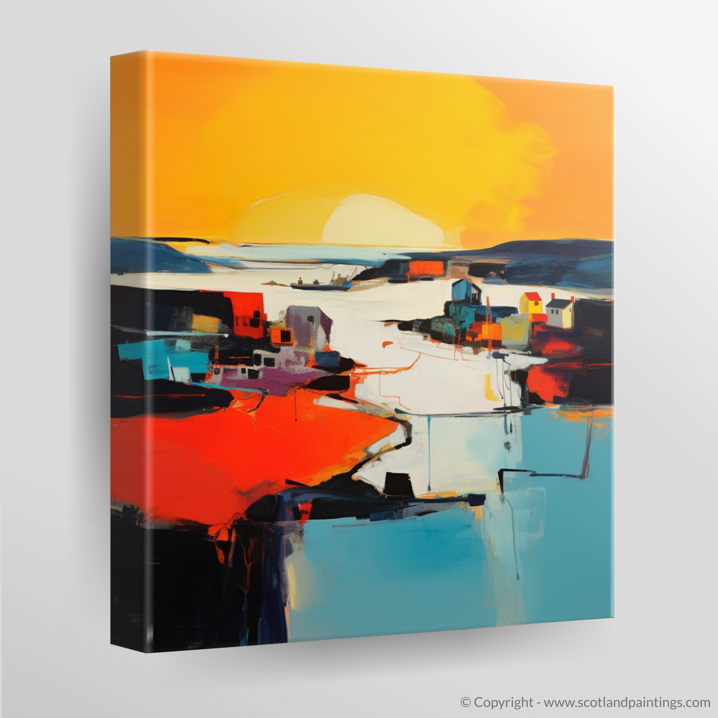Capturing the ephemeral beauty of the twilight dance, this evocative abstract print transforms Whitehills Harbour into a symphony of bold colours and striking shapes, alluding to the serene grandeur of golden hour. Fiery oranges and warm yellows melt into cooler blues and stark blacks, portraying the unique interplay of light and shadow as day gracefully submits to evening. The abstraction distils the essence of the harbour, creating a vista that is both familiar in its homage to coastal charm and intriguing in its departure from literal representation.