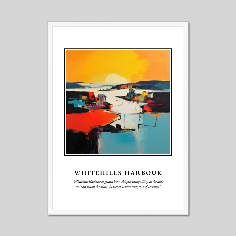 At the heart of this eye-catching piece is a vibrant painting of Whitehills Harbour, an abstract masterpiece that sings with bold colours and dynamic forms. The scene is illuminated by the golden hour, as the sun casts a warm, shimmering light over the water, creating pockets of tranquillity and peace. A quote underlines the painting: “Whitehills Harbour at golden hour whispers tranquillity, as the sun's embrace paints the waters in warm, shimmering hues of serenity.” This stunning visual composition invites you to experience the calm and allure of the harbour, whether you’ve visited before, have a connection to the area, or simply appreciate abstract art.